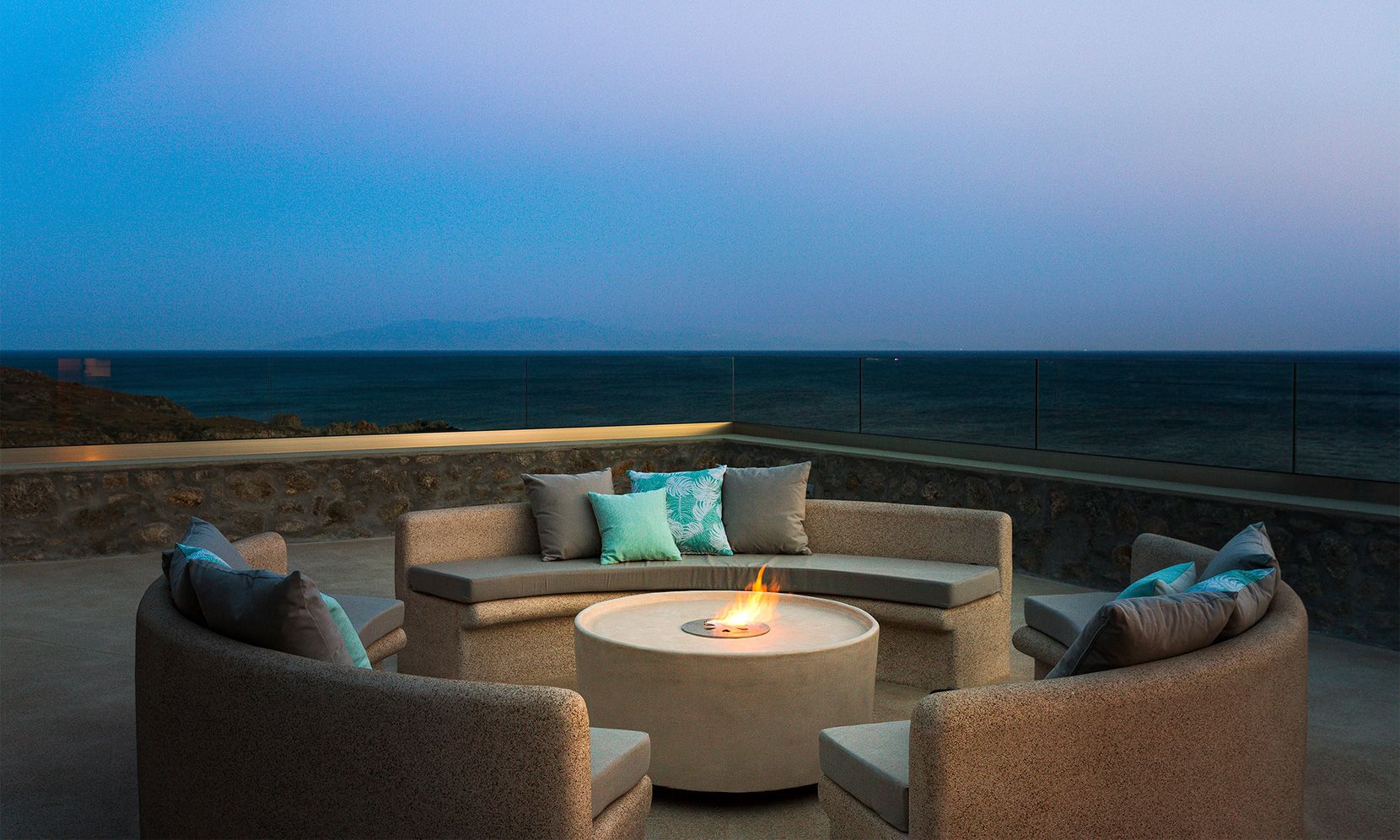 Mykonos Villa Oriana is brand new waterfront property in Aleomandra with amazing unobstructed sea views, built at the edge of a rocky shore in a wind protected spot right above the Aegean waters. It expands on 3 levels and features 6 en suite double bedrooms (out of which the 2 are masters), an additional en suite staff room, 7 bathrooms and 2 open plan kitchens and may comfortably accommodate up to 12 guests. The villa is elegantly furnished and decorated with warm, welcoming colors and boasts multiple indoor and outdoor lounge areas, a private infinity pool, an outdoor Jacuzzi and an outdoor fireplace (fire pit) which creates the perfect focal point from which guests may enjoy the astounding sea views. Last but not least, below the villa’s main terrace at only two-minutes’ walk, there is a small isolated sandy beach which guests may freely visit.