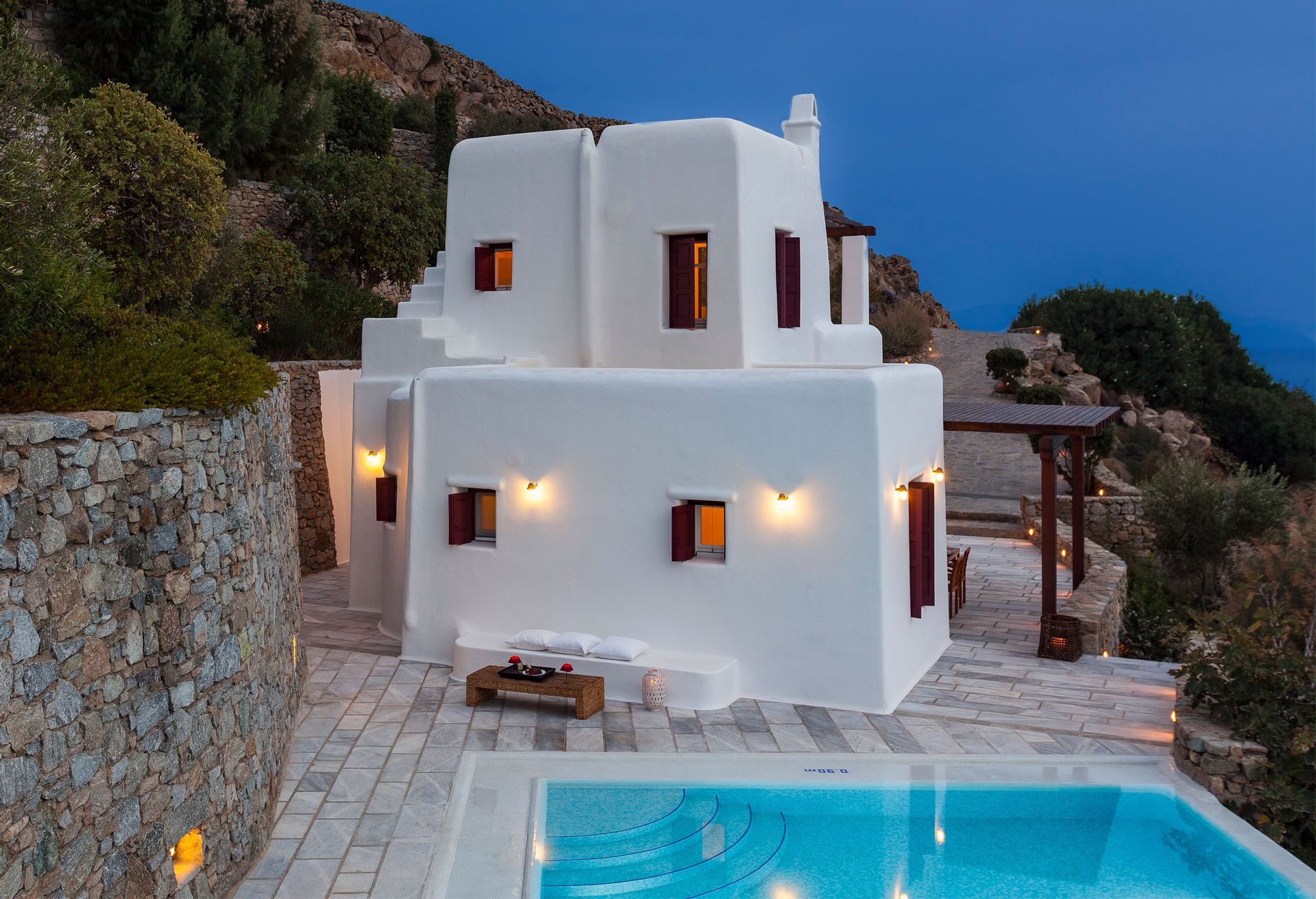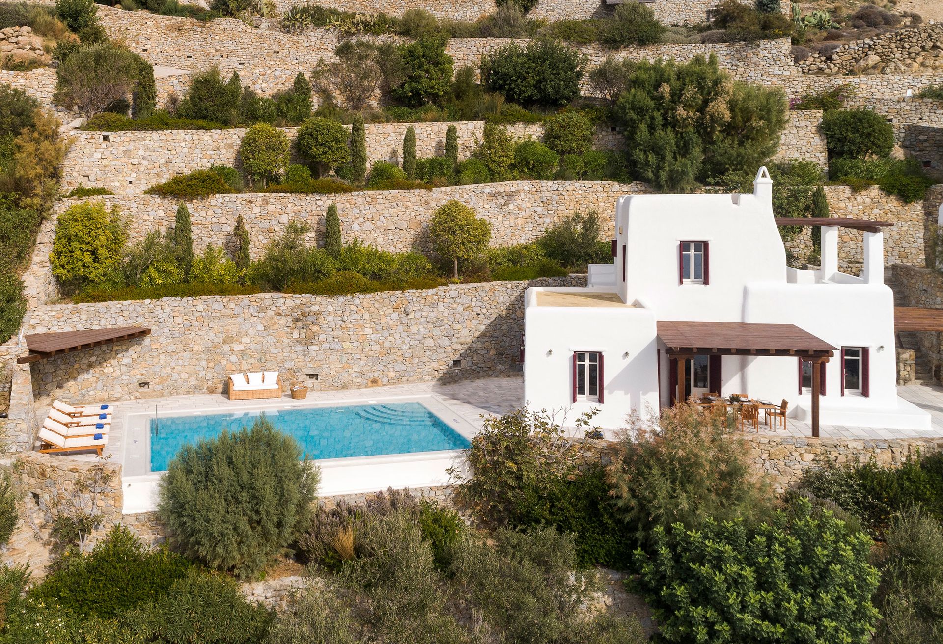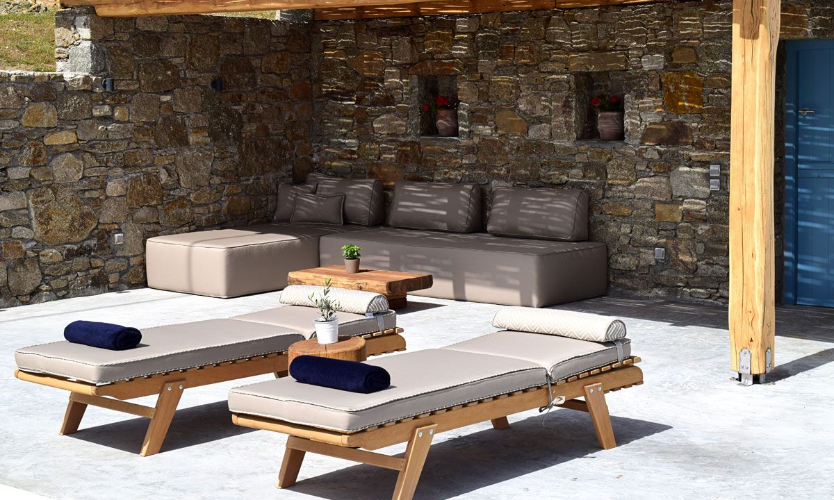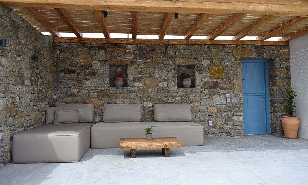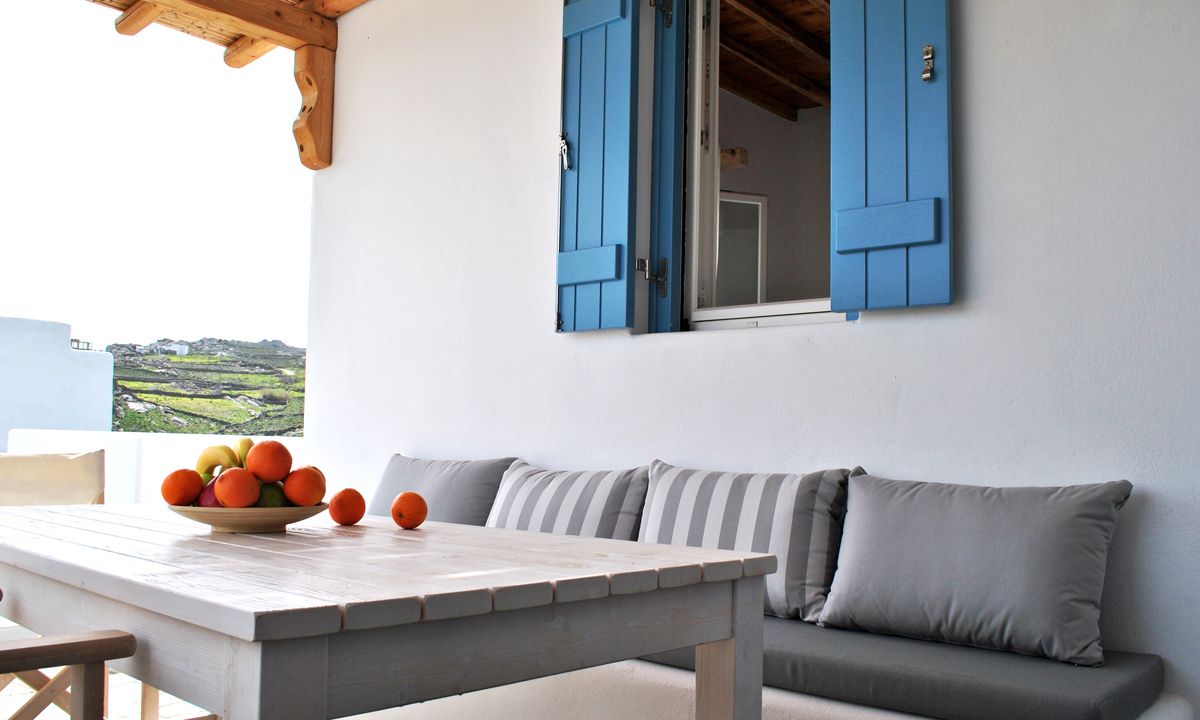 Outdoors, there are large terraces, a covered pergola that offers shade during the hot cycladic summer days and a dining table for six. There are lounge chairs where someone can relax and enjoy the panoramic view over the Kalo Livadi bay.