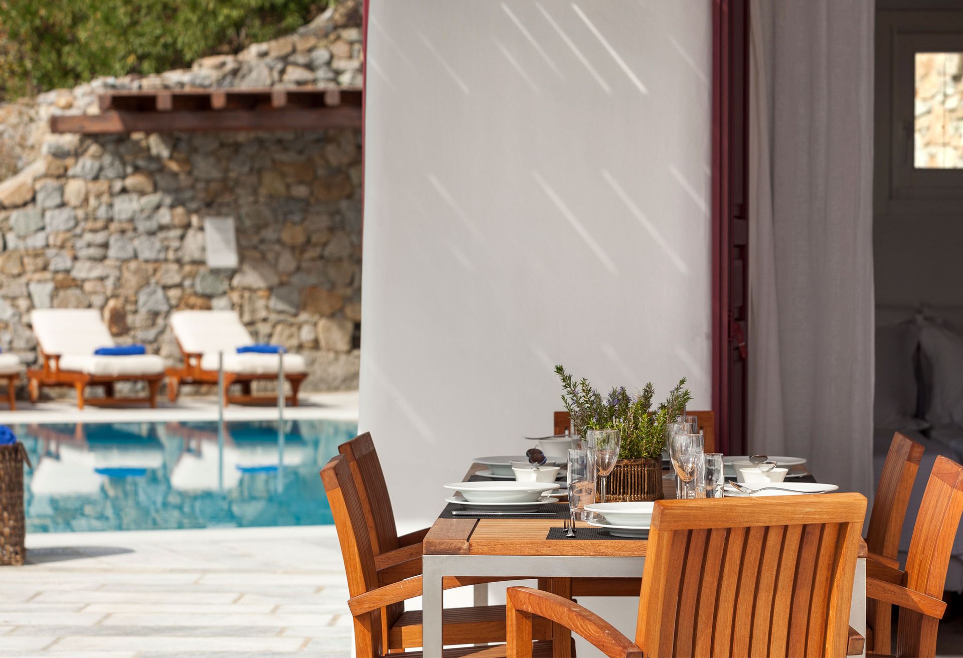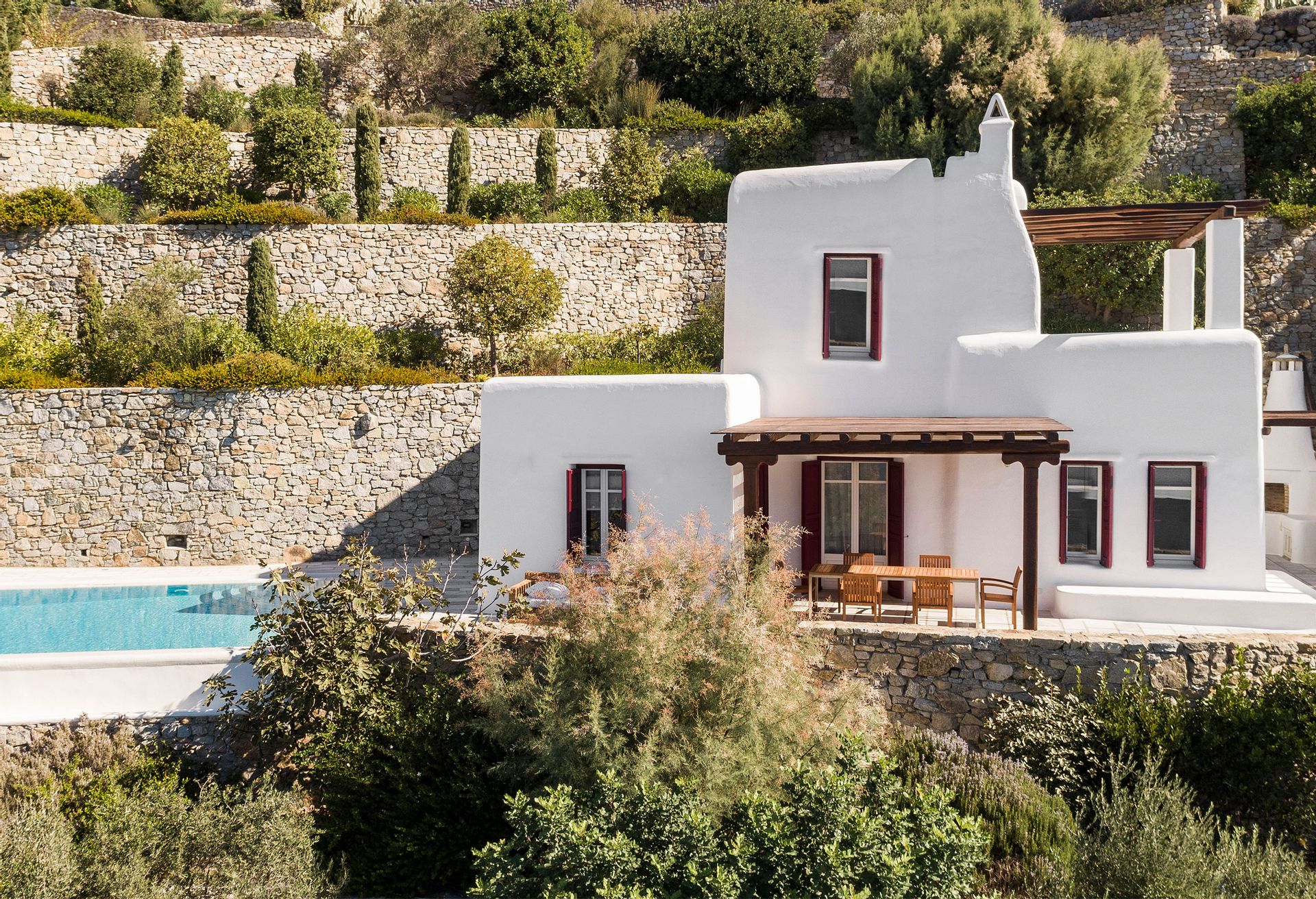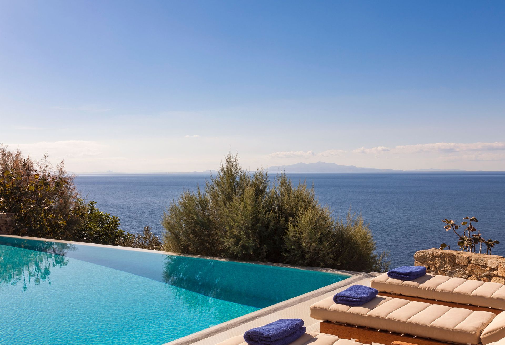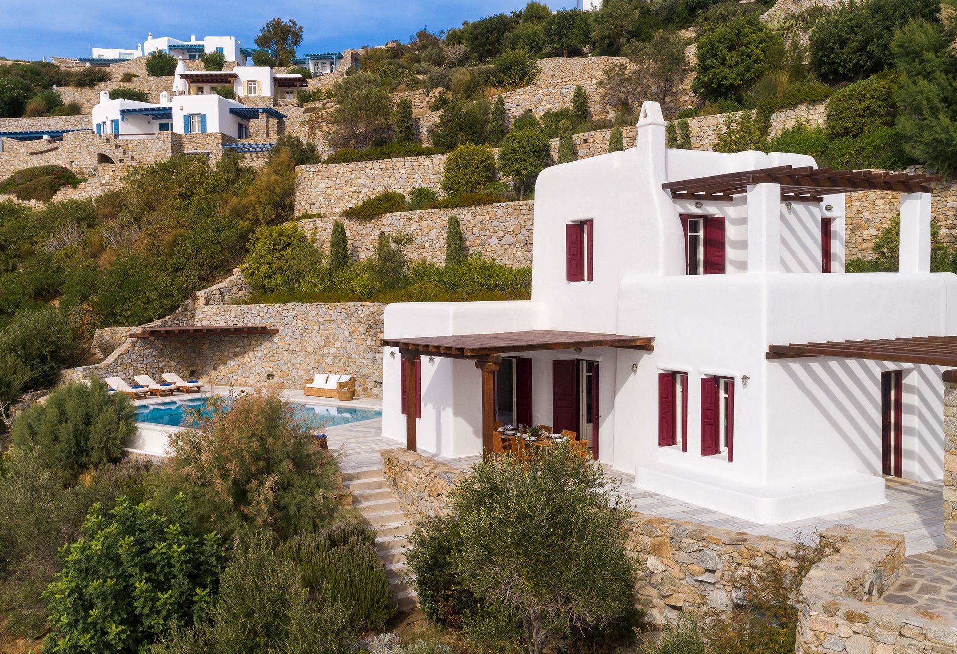 Villa Rhea is only a 10 minute walk from the famous cosmopolitan beach Kalo Livadi where all the restaurants, beach clubs and water sports are located.