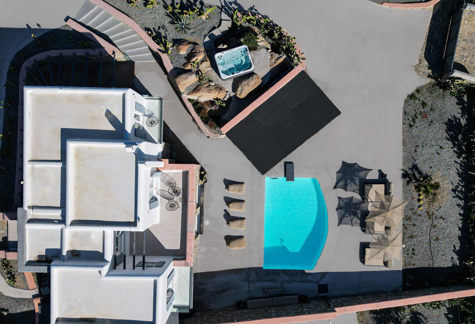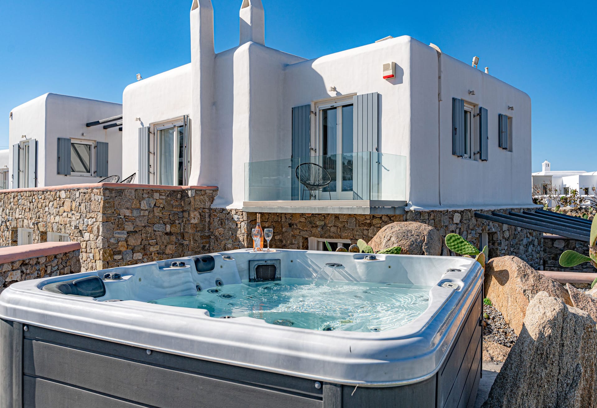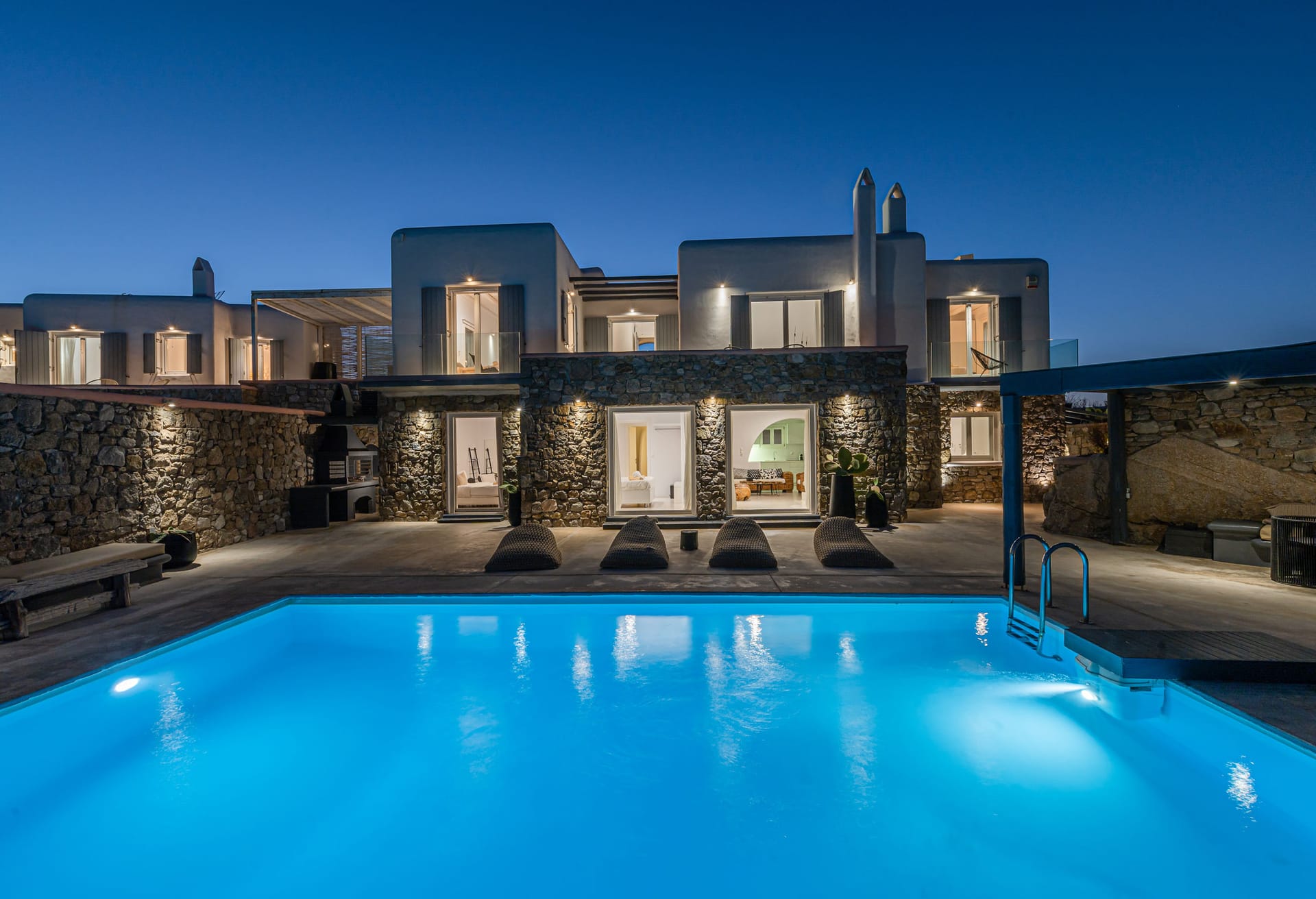 Villa Zafira 5 is perched at the top a private 10-Villa Estate and enjoys a bird’s eye view of the islands of Delos and Rhenea over a majestic drop to the sea, offering the picture-perfect Mykonos sunset. Villa Zafira 5 boasts an outdoor BBQ and an outdoor dining & lounging area (sunny & shady all day long)- all in front of the 79m2 infinity pool that flows off into the Aegean horizon- and you are still less than a two-minute walk to the sea (still within the estate). Villa Zafira 5 has a single main entrance that opens into the open-plan kitchen and the living/dining room area. On the upper level is a Master bedroom with an Expanded Queen and an en-suite bathroom & balcony. On the pool level is another Master bedroom with 1King-size bed (or 2 Singles) with a bathroom. On the ground level are: 1 bedroom with a Queen bed, w/ en-suite bathroom, and a balcony door leading to the grounds. There is another room with a Queen bed, w/ en-suite bathroom with a curs anglais window. The brilliant white interiors and exteriors and the subtle tasteful decorations reflect the Mykonian-elegance the island is known for, so you can totally immerse yourself in the spirit of the island. The brilliant white interiors and exteriors and the subtle tasteful decorations reflect the Mykonian-elegance the island is known for, so you can totally immerse yourself in the spirit of the island. The refurbished luxury estate has daily, complimentary maid service-so you don’t lift a finger, 24/7 CCTV monitoring at the periphery of the estate- so unauthorized people are detectable, Netflix- to quench your thirst for relaxed adventure, flat-screen TVs- so everyone can watch, back-up generators- to face the frequent local electric shortages, a desalination plant- so you can ignore the frequent local water shortages, and a 24/7 gate-access control. The pool can be heated for a fee.
