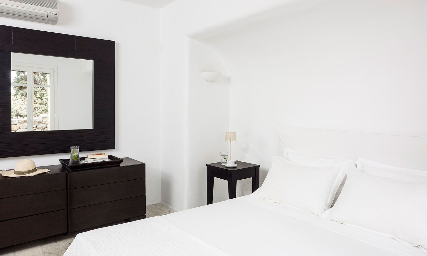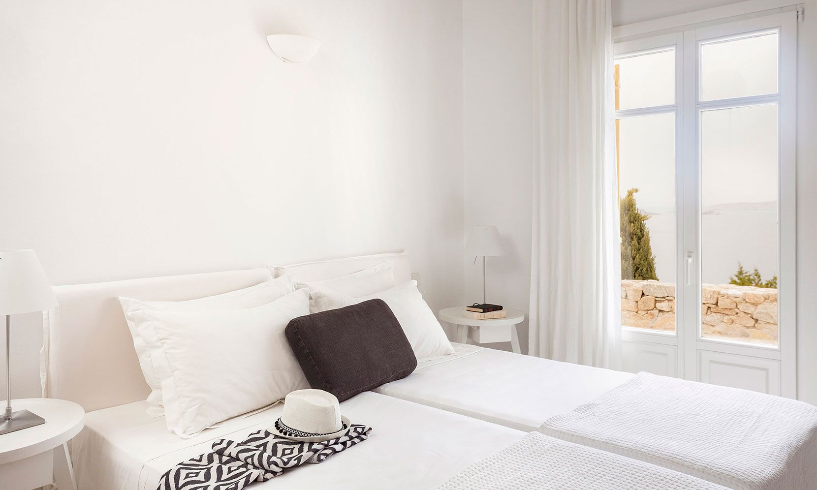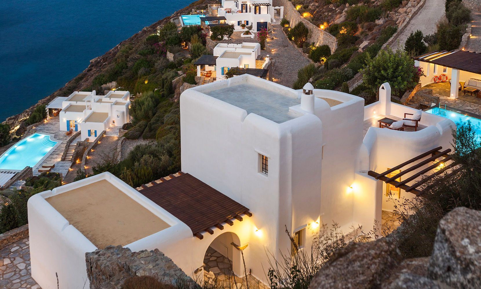Villa Zafira 5 is perched at the top a private 10-Villa Estate and enjoys a bird’s eye view of the islands of Delos and Rhenea over a majestic drop to the sea, offering the picture-perfect Mykonos sunset. Villa Zafira 5 boasts an outdoor BBQ and an outdoor dining & lounging area (sunny & shady all day long)- all in front of the 79m2 infinity pool that flows off into the Aegean horizon- and you are still less than a two-minute walk to the sea (still within the estate). Villa Zafira 5 has a single main entrance that opens into the open-plan kitchen and the living/dining room area. On the upper level is a Master bedroom with an Expanded Queen and an en-suite bathroom & balcony. On the pool level is another Master bedroom with 1King-size bed (or 2 Singles) with a bathroom. On the ground level are: 1 bedroom with a Queen bed, w/ en-suite bathroom, and a balcony door leading to the grounds. There is another room with a Queen bed, w/ en-suite bathroom with a curs anglais window. The brilliant white interiors and exteriors and the subtle tasteful decorations reflect the Mykonian-elegance the island is known for, so you can totally immerse yourself in the spirit of the island. The brilliant white interiors and exteriors and the subtle tasteful decorations reflect the Mykonian-elegance the island is known for, so you can totally immerse yourself in the spirit of the island. The refurbished luxury estate has daily, complimentary maid service-so you don’t lift a finger, 24/7 CCTV monitoring at the periphery of the estate- so unauthorized people are detectable, Netflix- to quench your thirst for relaxed adventure, flat-screen TVs- so everyone can watch, back-up generators- to face the frequent local electric shortages, a desalination plant- so you can ignore the frequent local water shortages, and a 24/7 gate-access control. The pool can be heated for a fee.