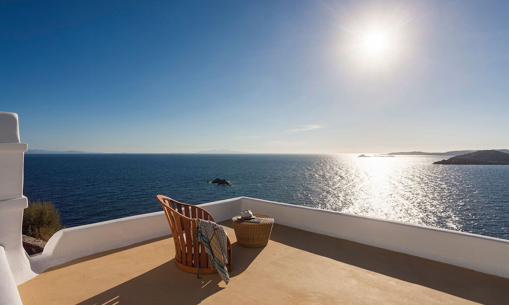 Mykonos Villa Zafira 6 is perched at the edge of a private 11-Villa Estate and enjoys an uninterrupted view of the islands of Delos and Rhenea over a majestic drop to the sea, offering the picture-perfect Mykonos sunset. Villa Zafira 6 boasts an outdoor BBQ and an outdoor dining area overlooking the sea & another dining & lounging area (sunny & shady all day long) in front of the 82m2 infinity pool that flows off into the Aegean horizon- and you are still less than a two-minute walk to the sea (still within the estate). Villa Zafira 6 has a main entrance (on the pool level) that opens into the dining room area on the left and the kitchen to the right, further on is the extended sitting area where the view to the sea is breath taking. On the upper level is a Master bedroom with a Super King w/ en-suite bathroom w/ jacuzzi & private balcony that affords an extraordinary view of the neighboring Cycladic islands. On the pool level there is also another Master bedroom with 1King size bed (or 2S’s) with an en-suite bathroom. On the ground level are: 2 bedrooms, each with a King-size beds & a balcony door with direct access to the pool; they share 2 bathrooms. The pool can be heated for a fee. The brilliant white interiors and exteriors and the subtle tasteful decorations reflect the Mykonian-elegance the island is known for, so you can totally immerse yourself in the spirit of the island. The refurbished luxury estate has daily, complimentary maid service-so you don’t lift a finger, 24/7 CCTV monitoring at the periphery of the estate- so unauthorized people are detectable, Netflix- to quench your thirst for relaxed adventure, flat-screen TVs- so everyone can watch, back-up generators- to face the frequent local electric shortages, a desalination plant- so you can ignore the frequent local water shortages, and a 24/7 gate-access control. The pool can be heated for a fee.