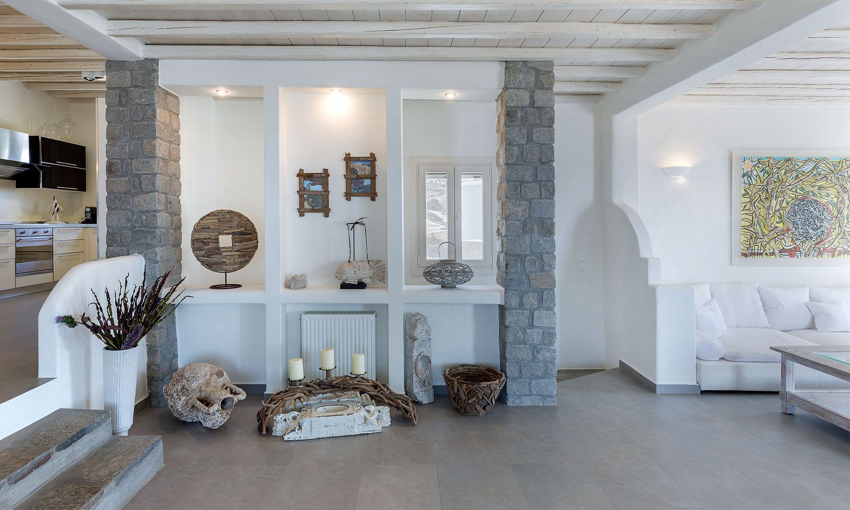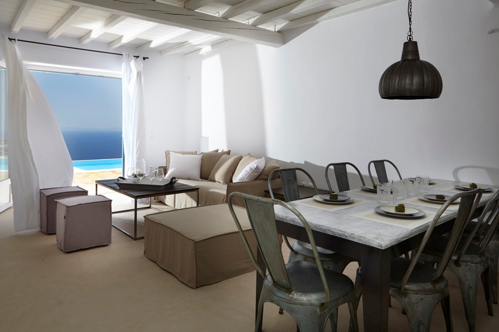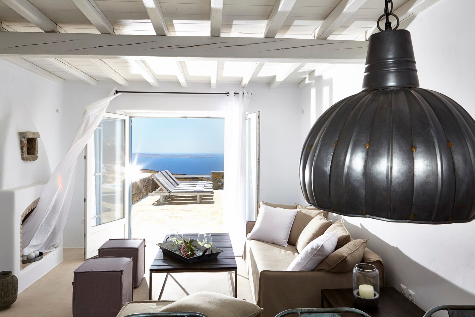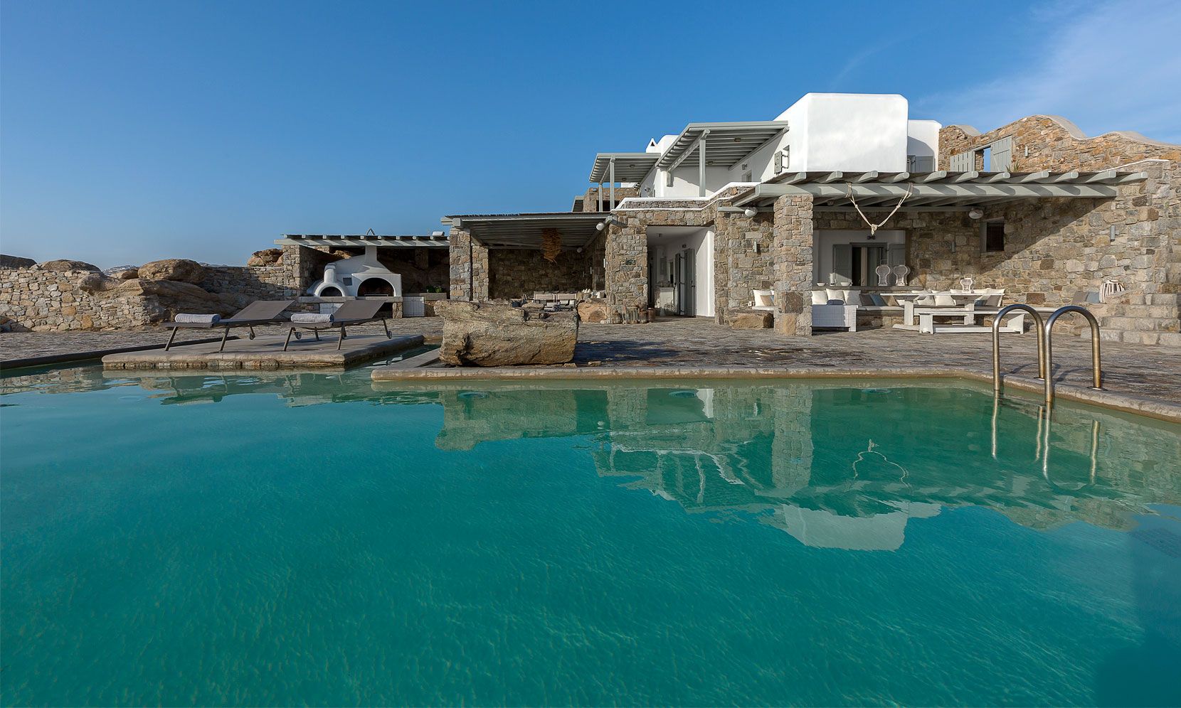 Enjoy the quietness and the superb view by getting sun kissed in the pool or reading a book in the shaded pergola. Relax in the huge outdoor area in the cozy sofas and loungers. The distinguished Greek architects that created the villa took care of your privacy. You can plunge into the sea through a flight of stairs. The modern design of wood and stone merges with the Cycladic architecture. Art lovers will be thrilled with the great wall paintings as well.