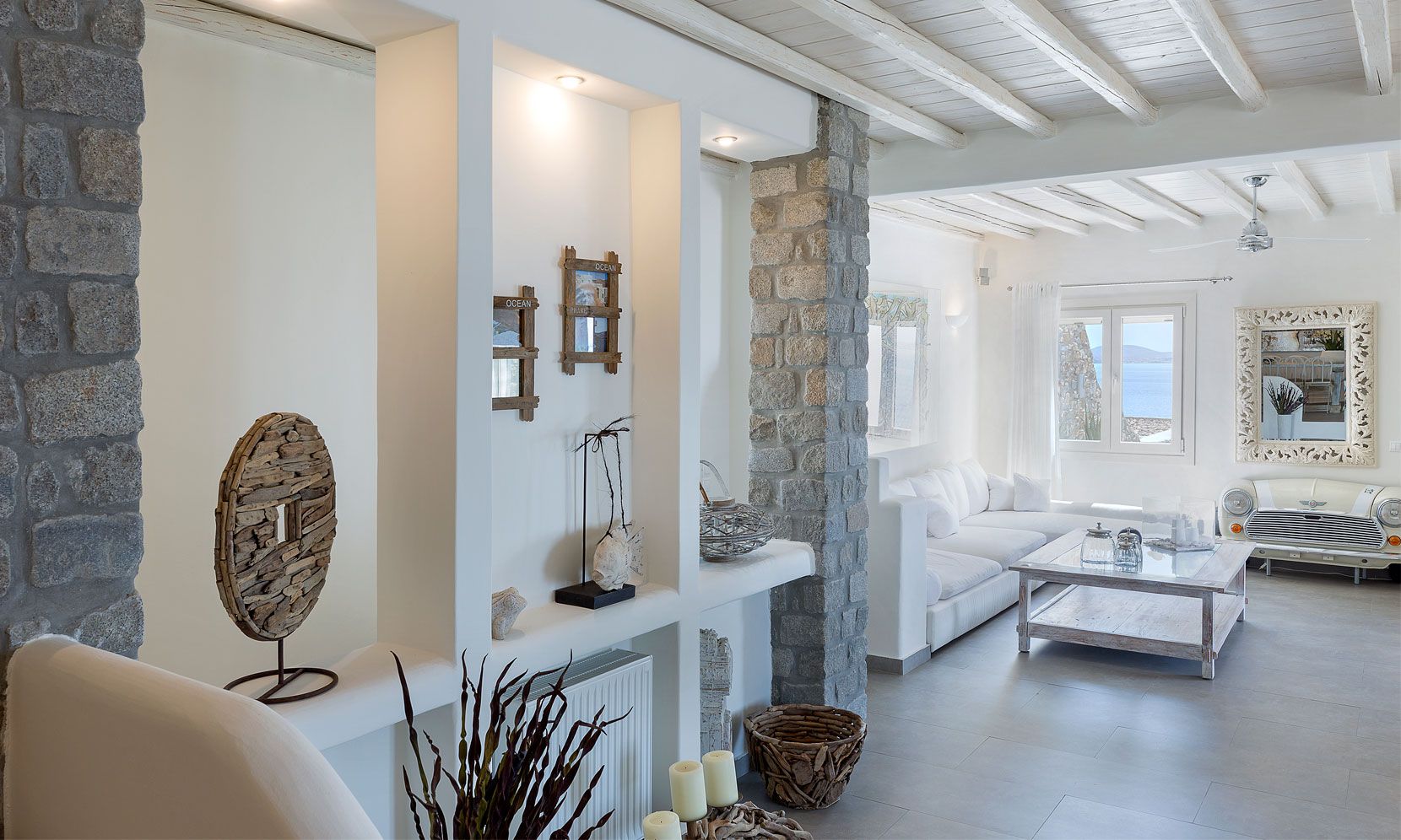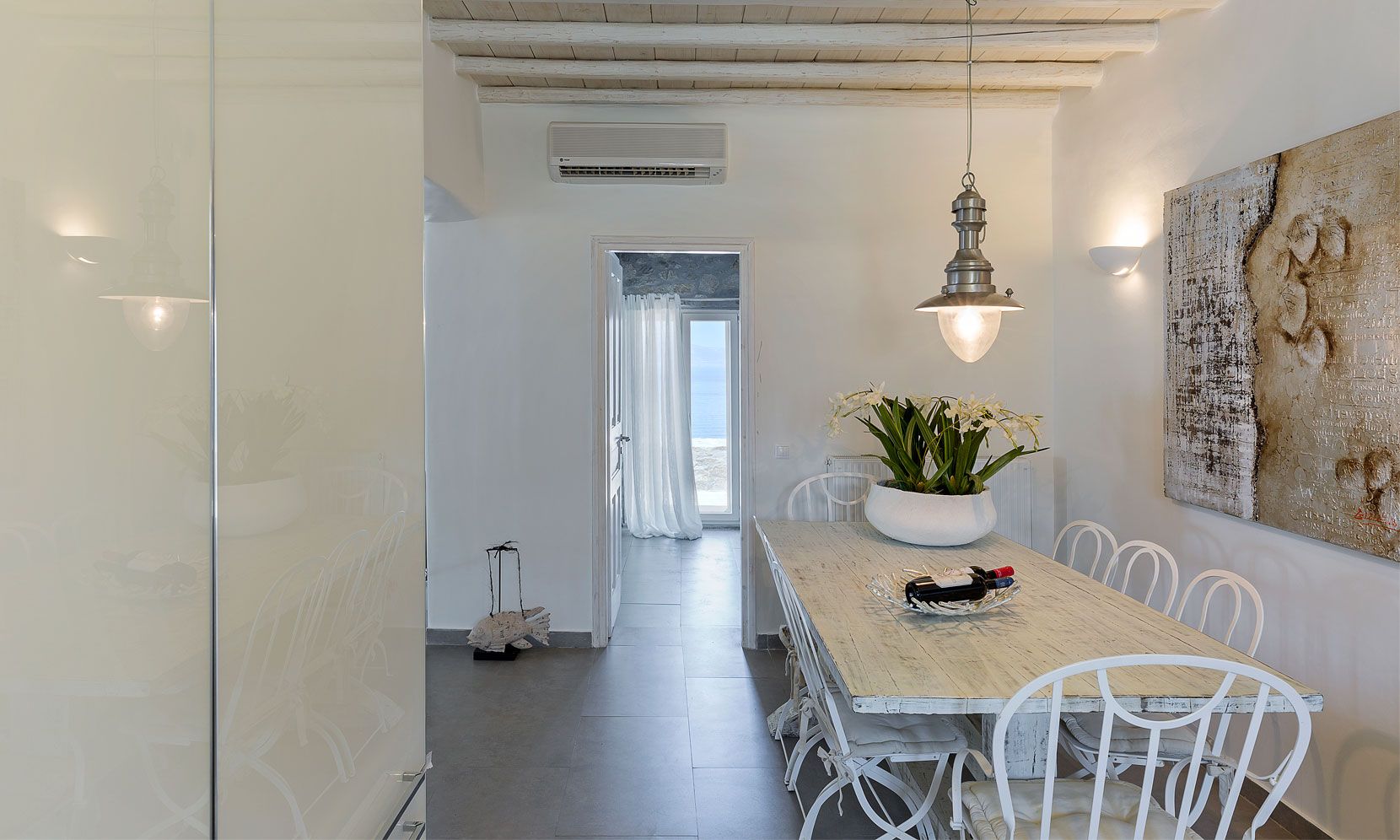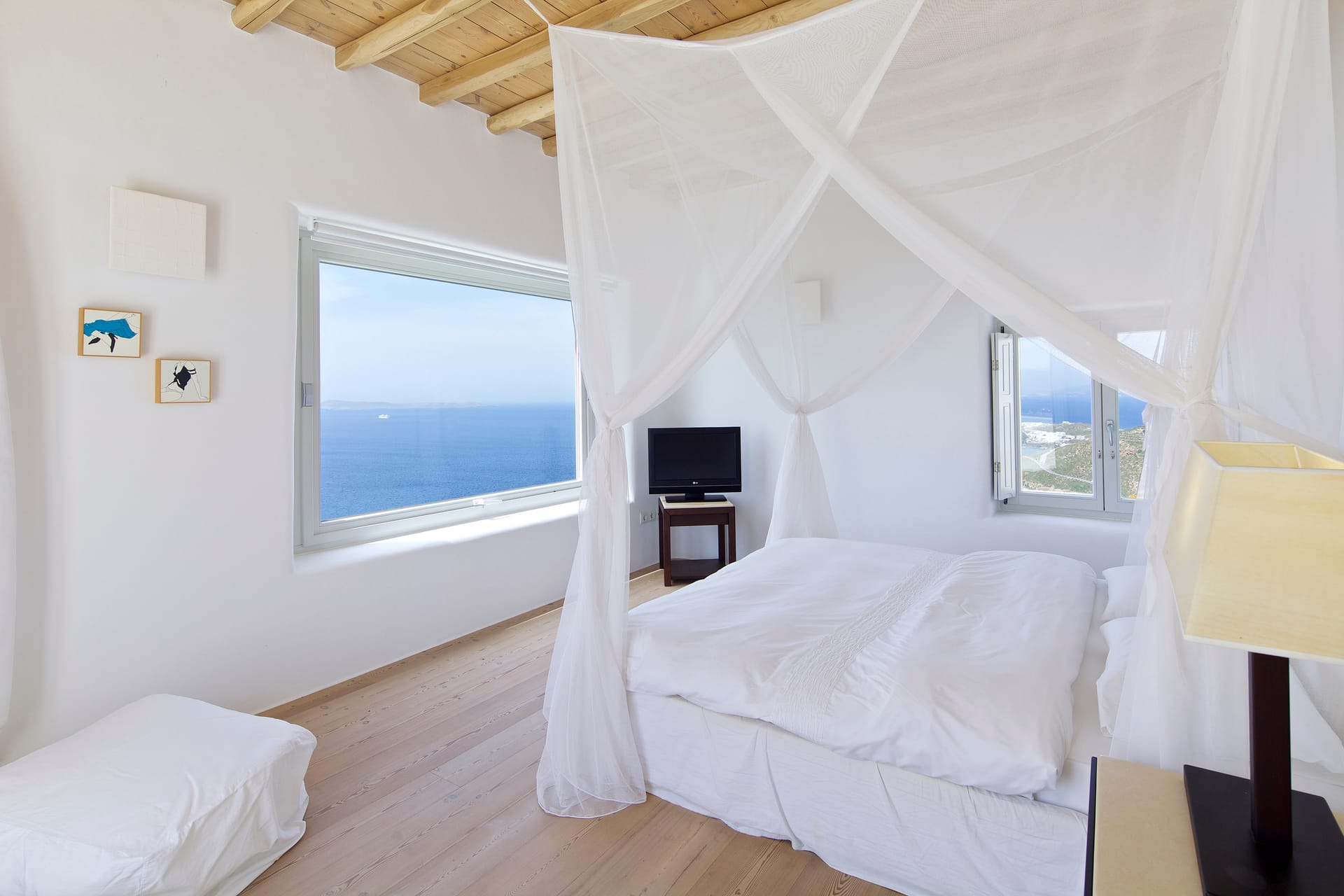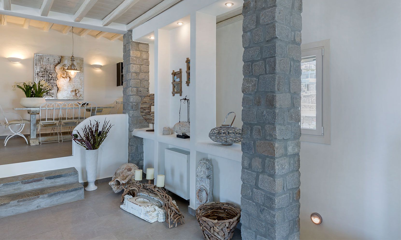 Enjoy the quietness and the superb view by getting sun kissed in the pool or reading a book in the shaded pergola. Relax in the huge outdoor area in the cozy sofas and loungers. The distinguished Greek architects that created the villa took care of your privacy. You can plunge into the sea through a flight of stairs. The modern design of wood and stone merges with the Cycladic architecture. Art lovers will be thrilled with the great wall paintings as well.