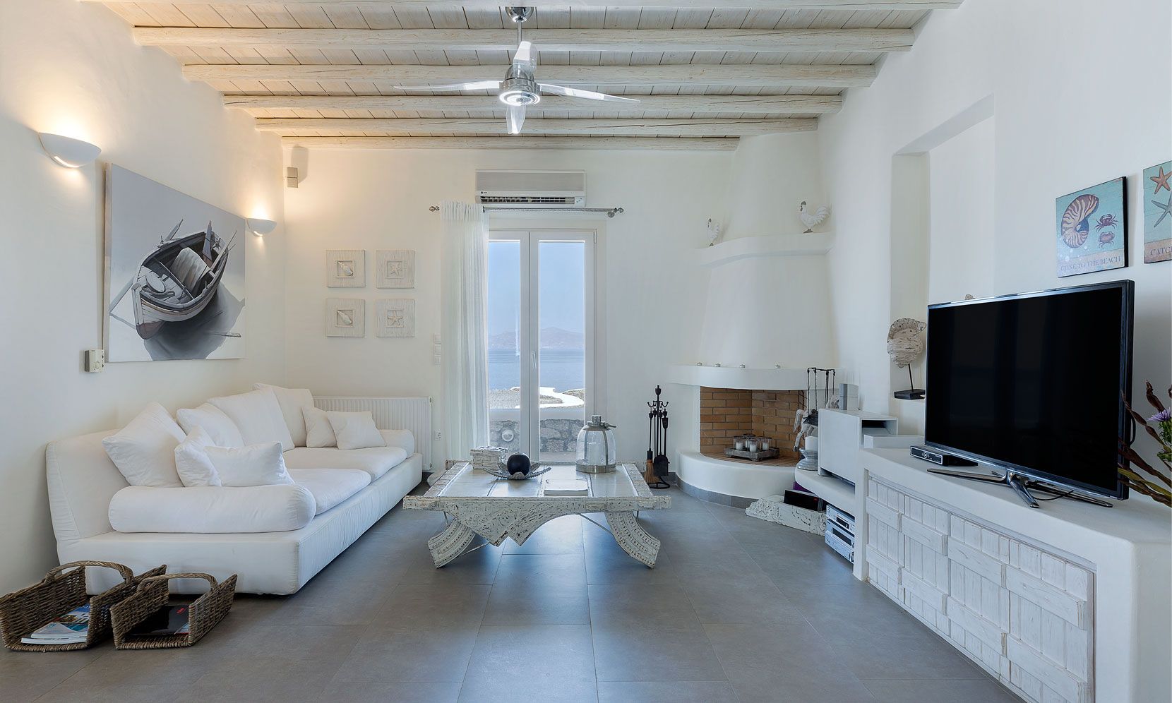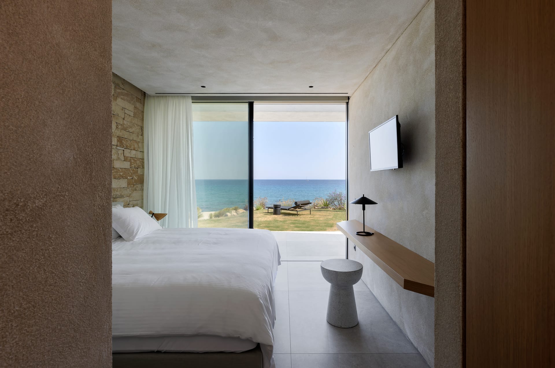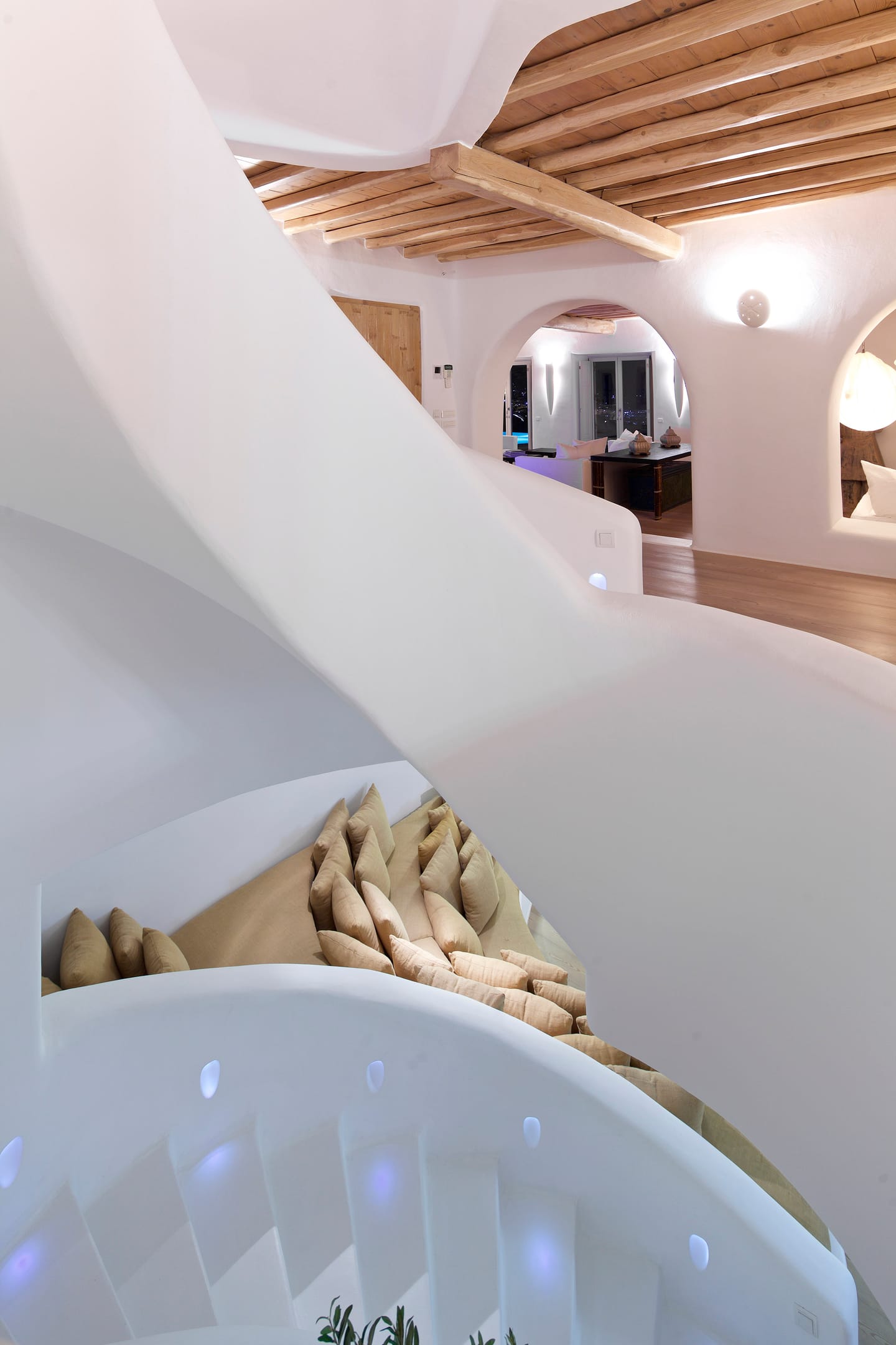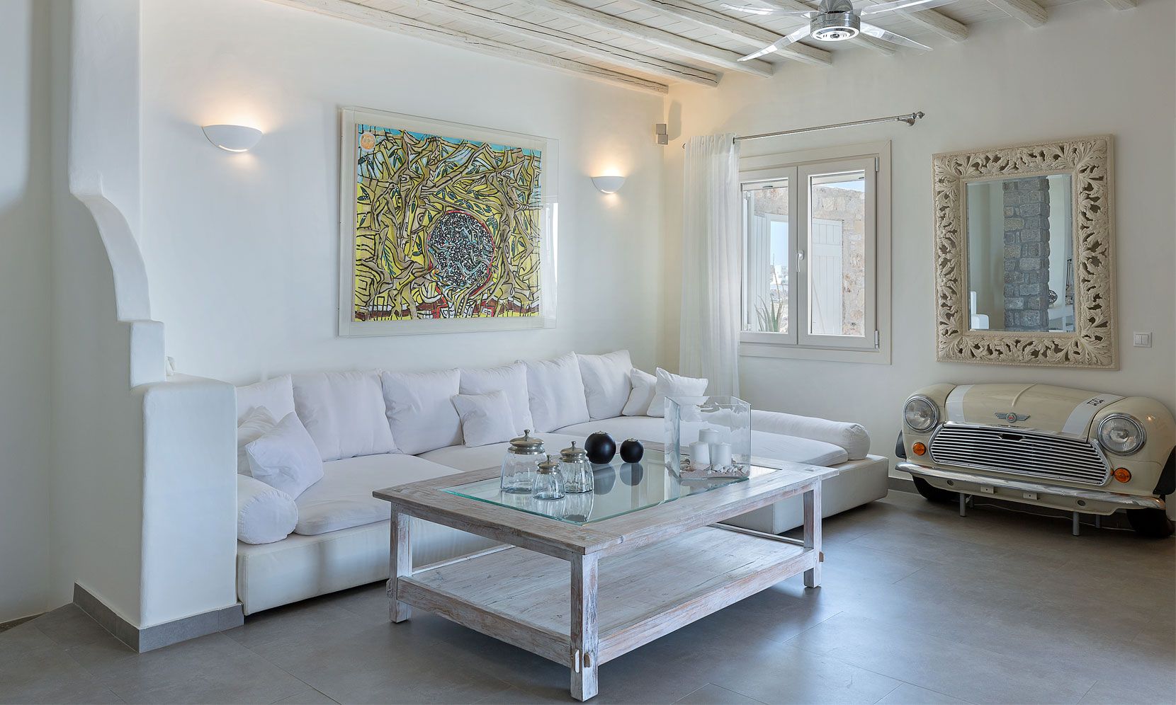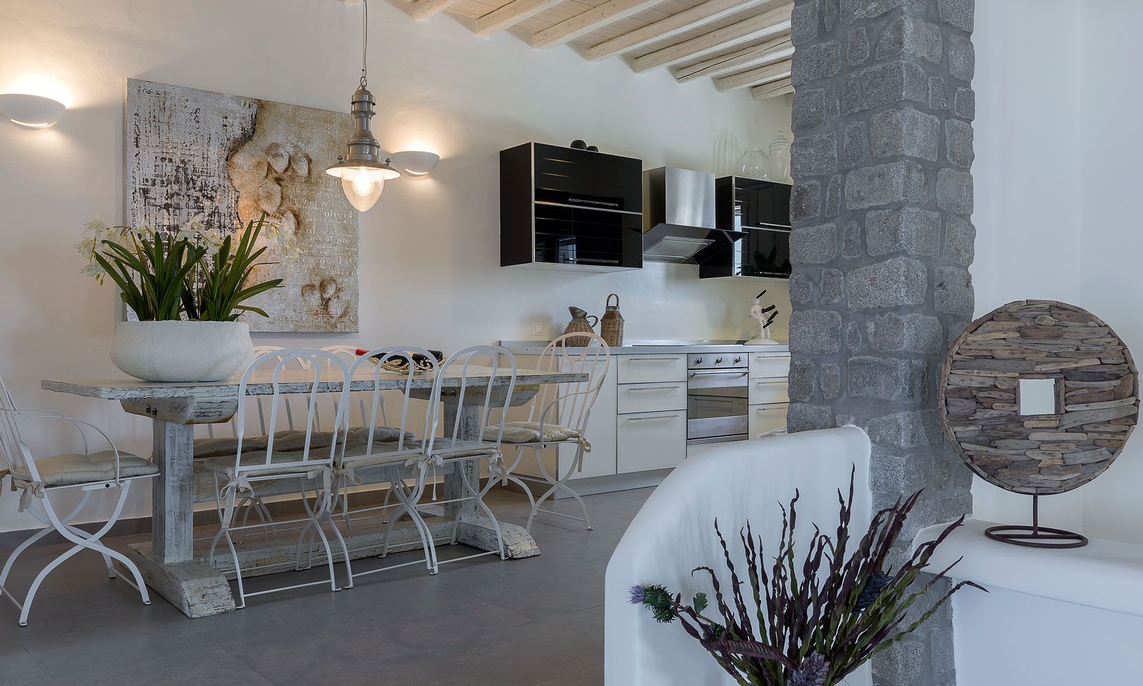 Enjoy the quietness and the superb view by getting sun kissed in the pool or reading a book in the shaded pergola. Relax in the huge outdoor area in the cozy sofas and loungers. The distinguished Greek architects that created the villa took care of your privacy. You can plunge into the sea through a flight of stairs. The modern design of wood and stone merges with the Cycladic architecture. Art lovers will be thrilled with the great wall paintings as well.