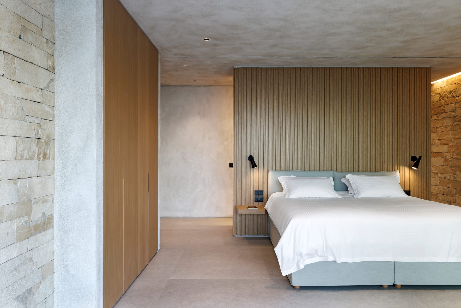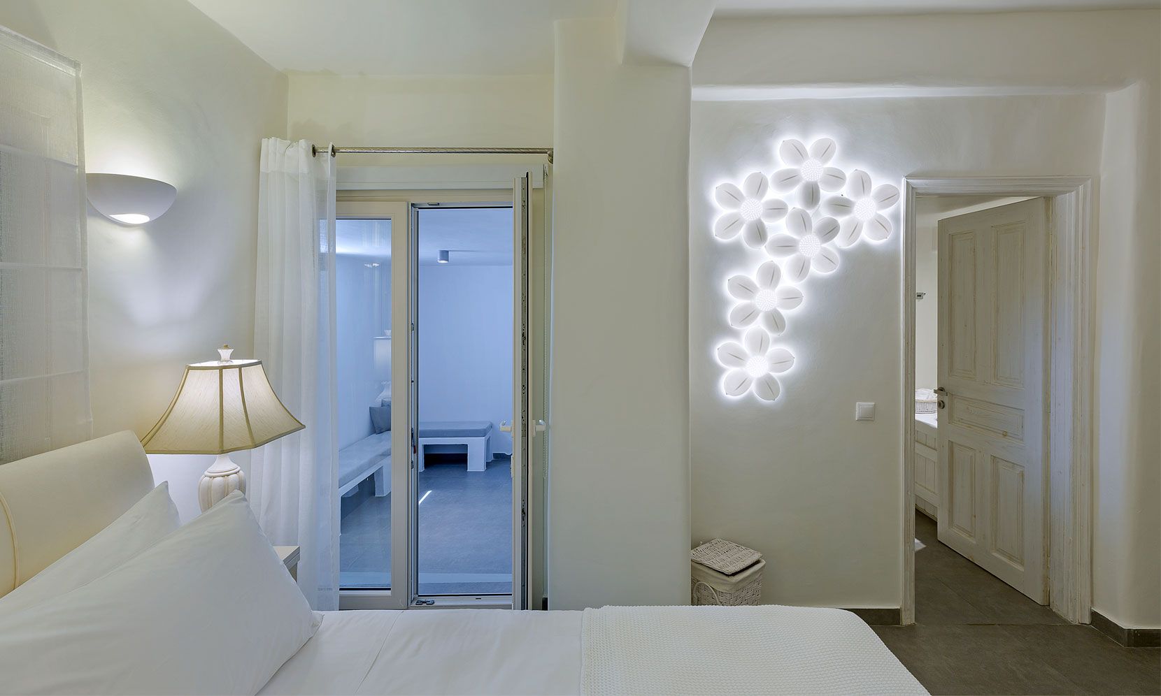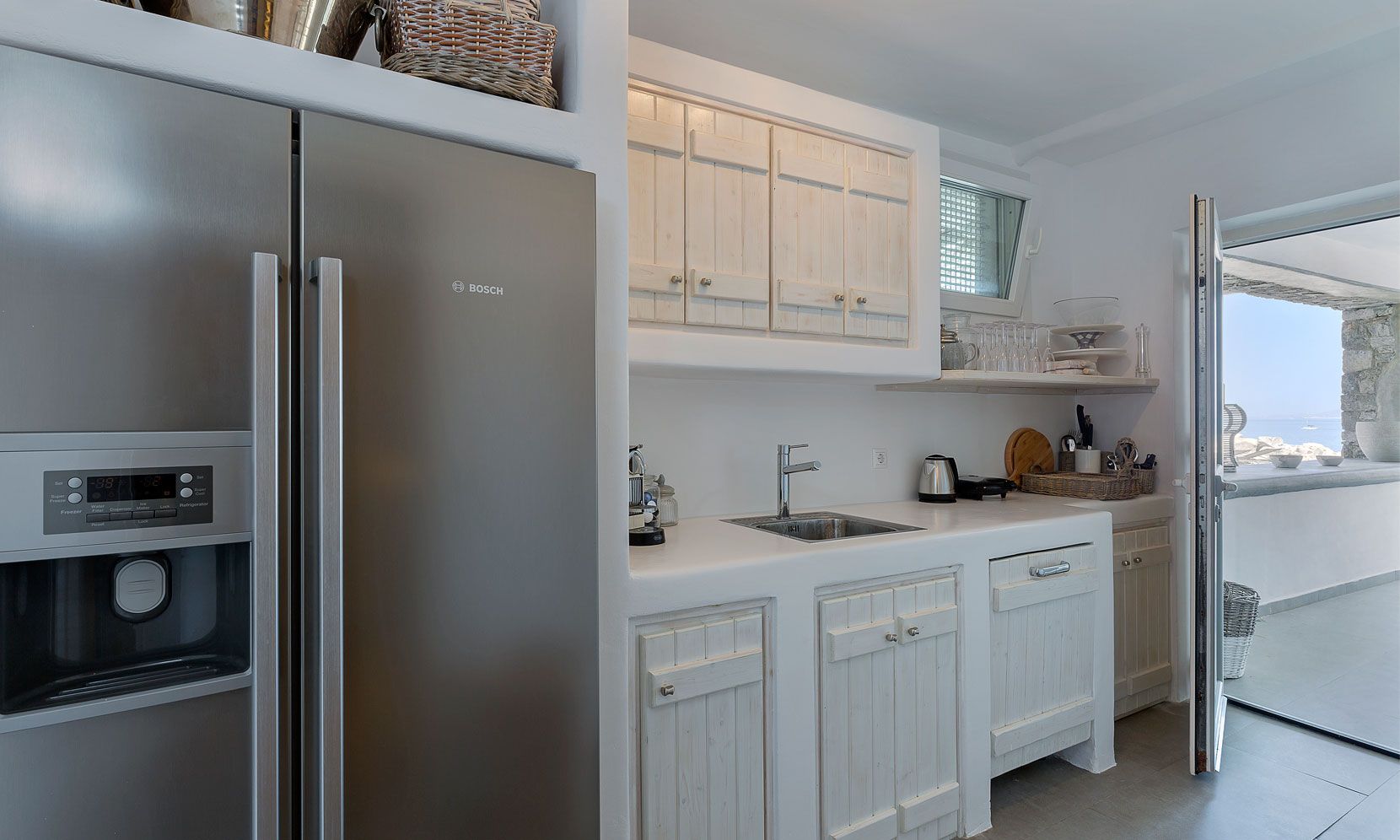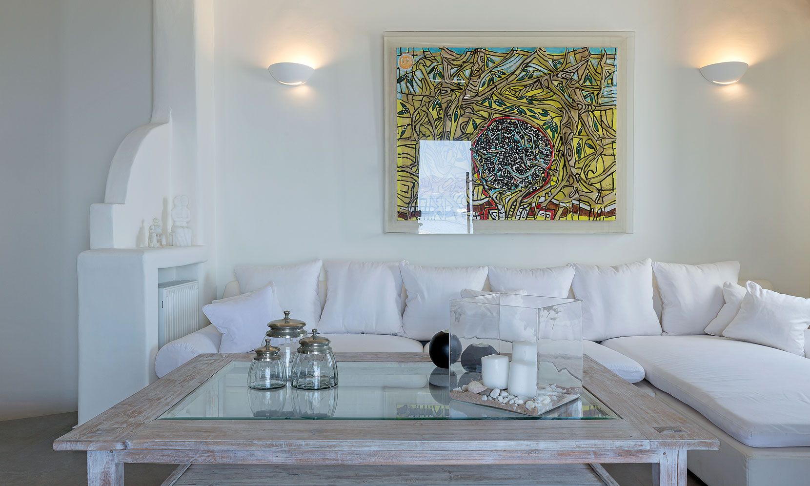 Enjoy the quietness and the superb view by getting sun kissed in the pool or reading a book in the shaded pergola. Relax in the huge outdoor area in the cozy sofas and loungers. The distinguished Greek architects that created the villa took care of your privacy. You can plunge into the sea through a flight of stairs. The modern design of wood and stone merges with the Cycladic architecture. Art lovers will be thrilled with the great wall paintings as well.