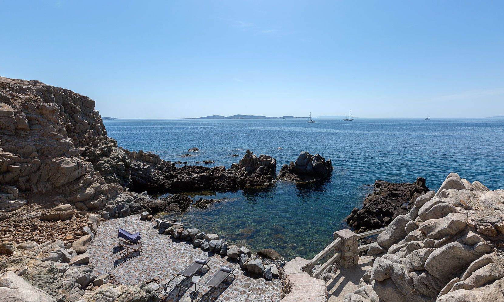 Access to the sea from platform with sunbeds