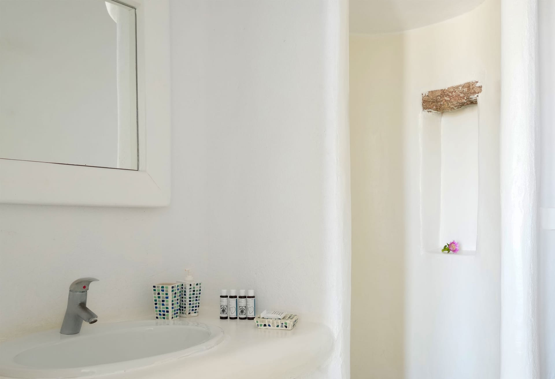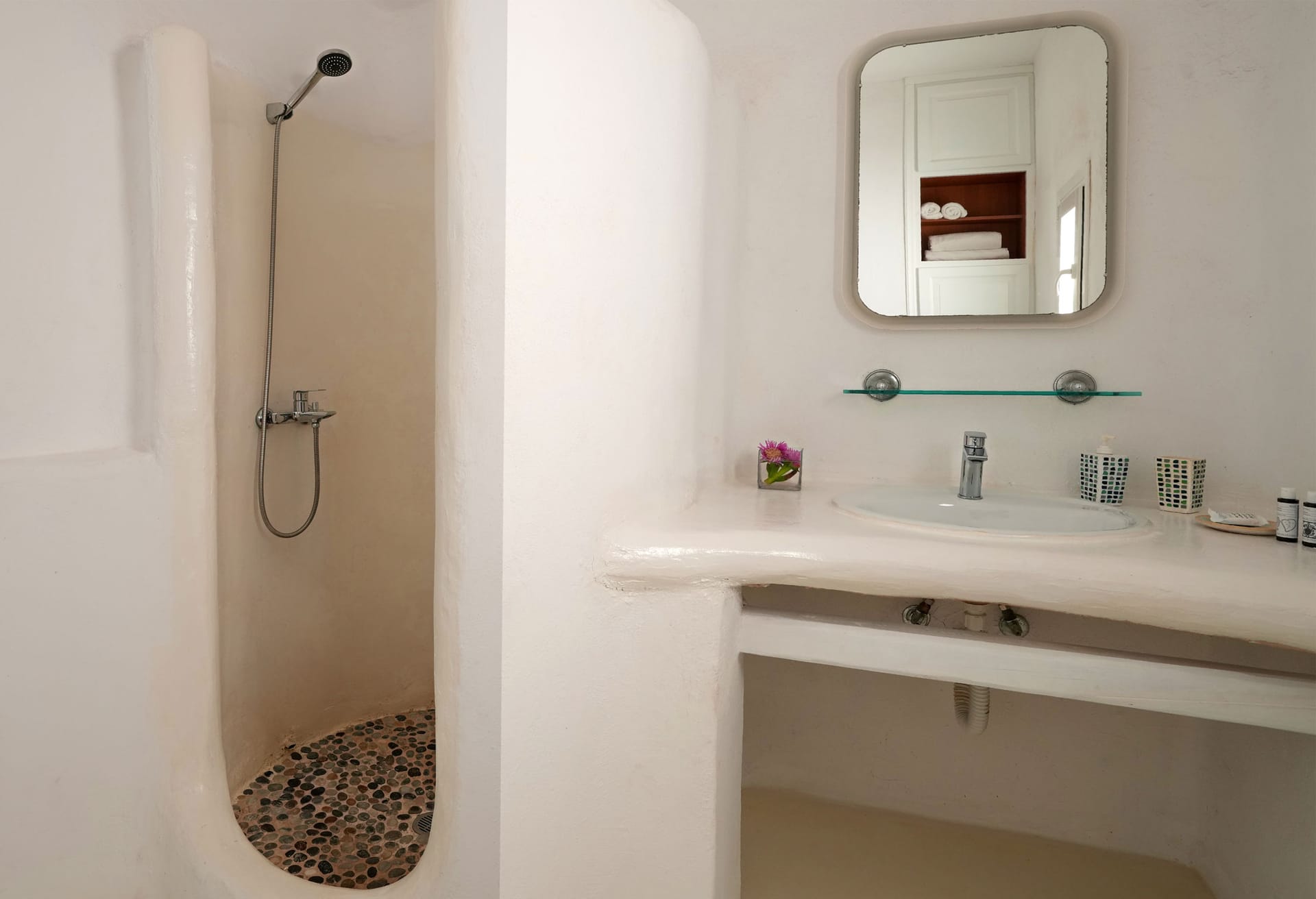 Mykonos Villa’s Zephyrus Two interior is specially designed in order to keep the bedrooms separated from the living areas. The entrance level consists of an ergonomically designed kitchen and a spacious living room. The decoration and furnishing is a combination of minimal and traditional Cycladic style, with stone built sitting areas and wooden elements.The lower level hosts the three bedrooms of the villa. Each bedroom is equipped with all the modern amenities, including an en-suite bathroom, air-conditioning, TV set and access to the terrace through the staircase that leads to the pool.