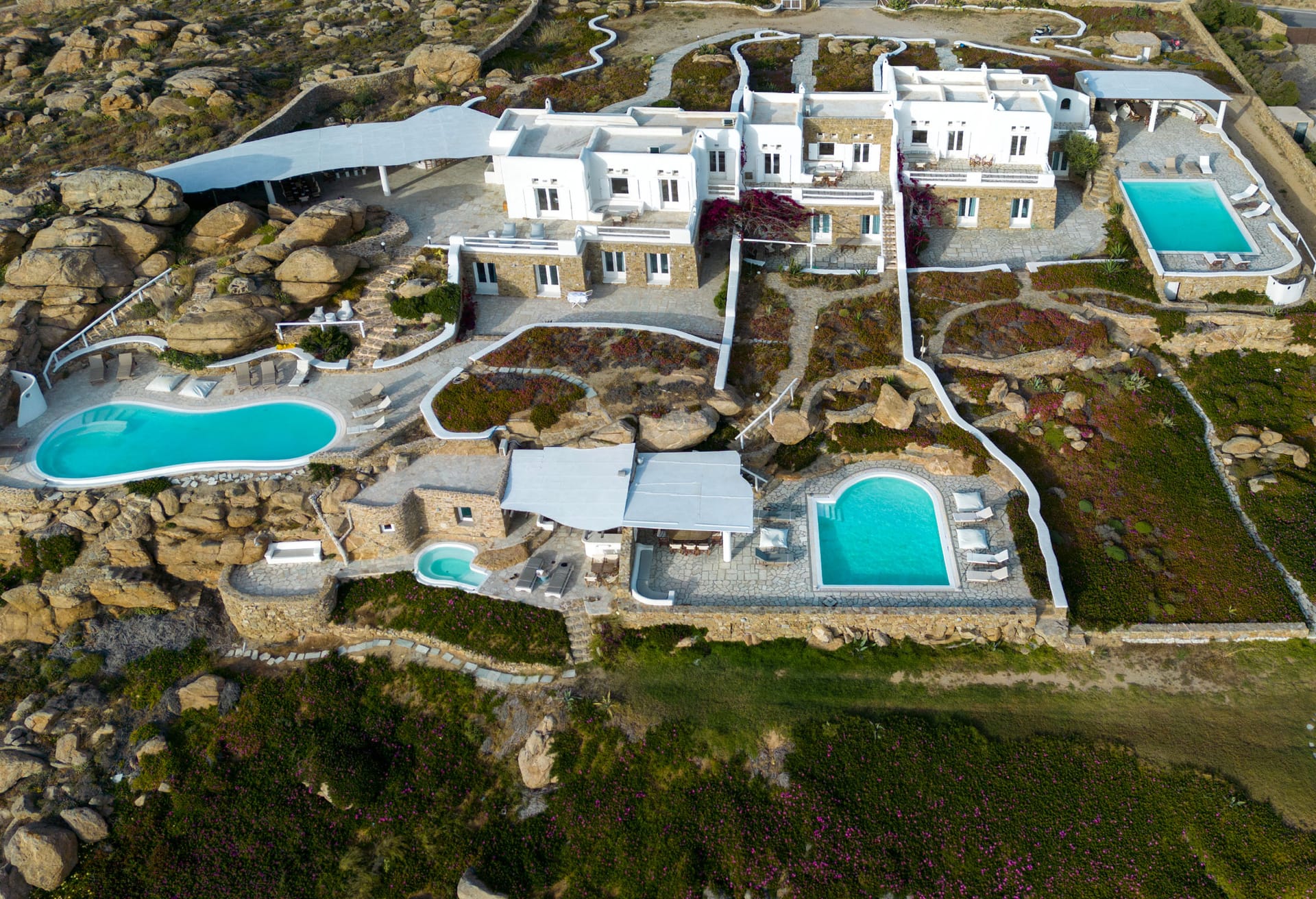 Zephyrus Mykonos Villas complex is a suggestion for a large group of friends or families wishing to spend a holiday together in a pleasant environment without compromising everyone’s own privacy and independence. The privacy and independence that the three villas of the complex offer make each one of them also suitable for smaller groups or families that seek to taste Mykonos summer and Rethink a Mykonos villa experience.