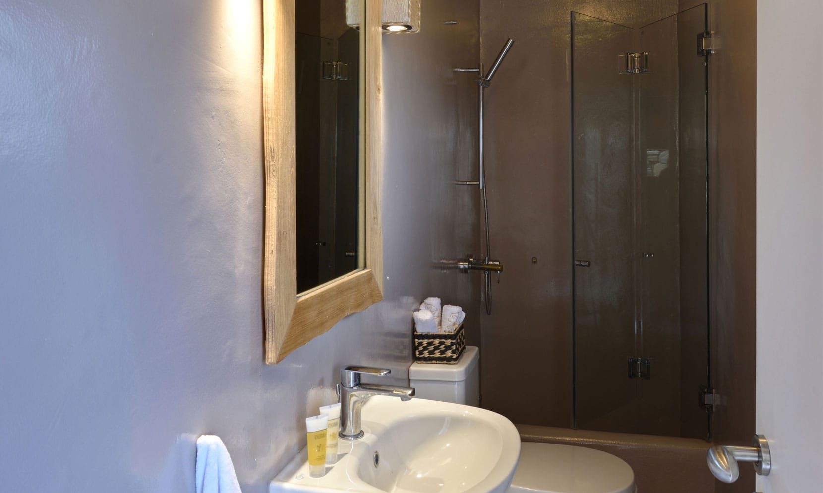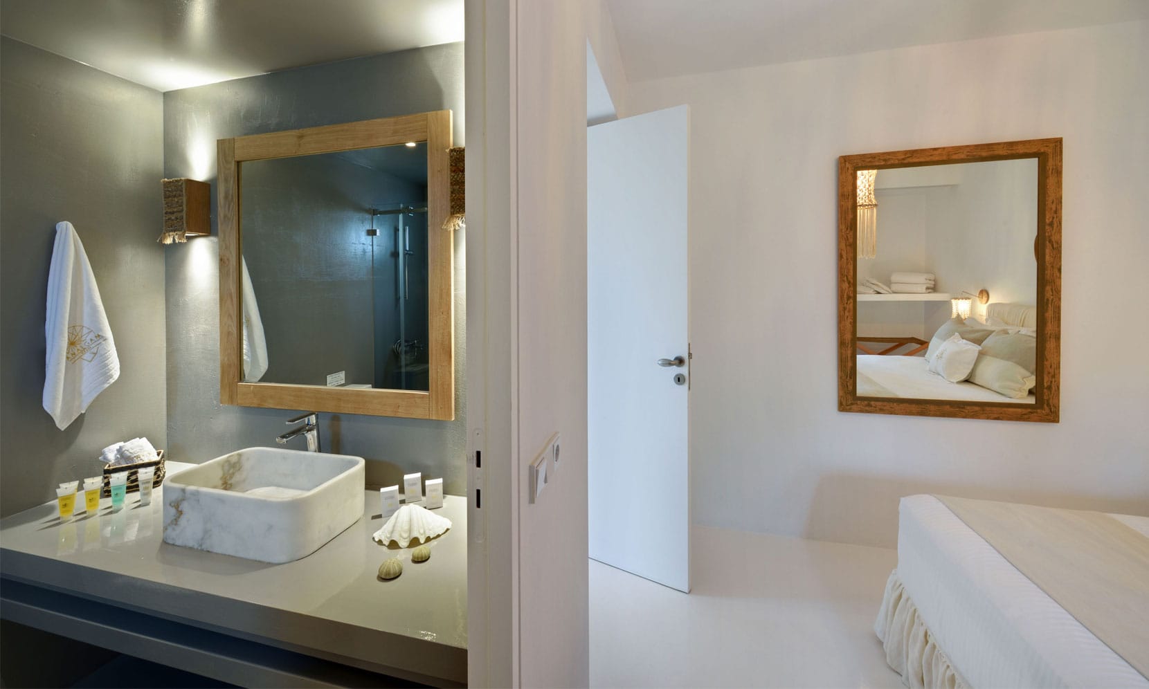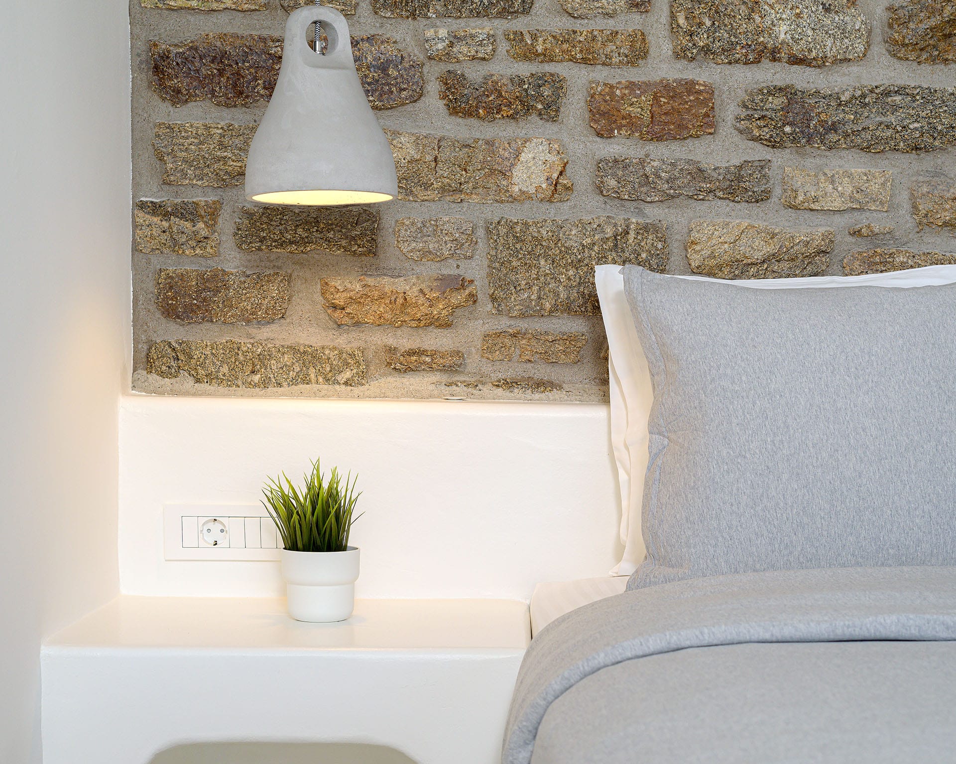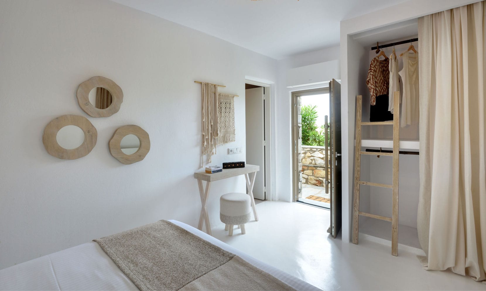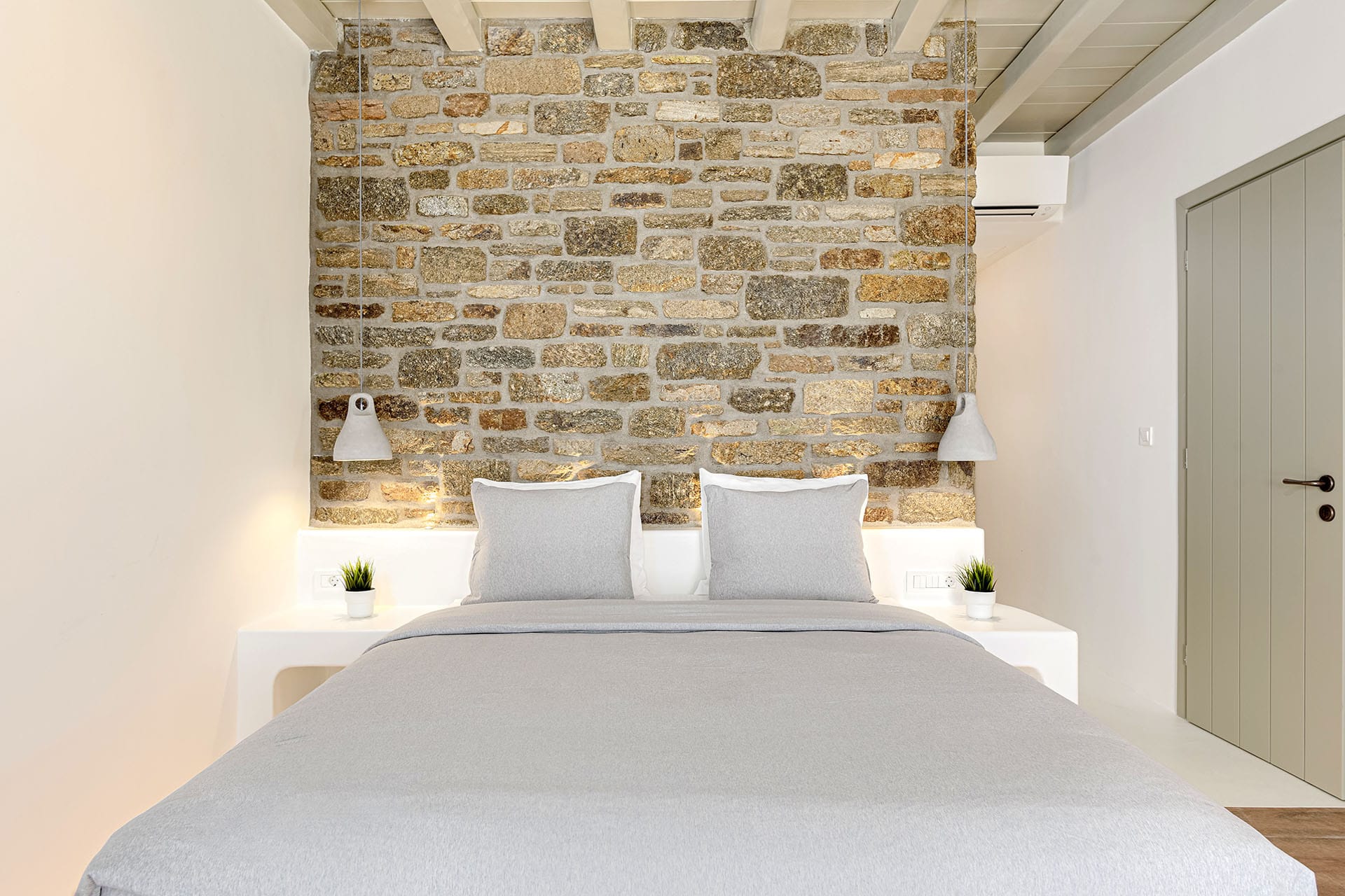 Encircled by the verdurous greenery Paros Villa Ariadne emits a distinctive charm and unique character. The main entrance leads directly to the elegant dining area decorated in natural nuances. Right by the dining area, there is a minimalist, modern living room decorated with comfortable contemporary furnishings, a satellite TV, and a home theater. A patio door exits to the front veranda featuring a dining table and a cozy sitting area where guests can enjoy their breakfast or relish a delicious meal under the shade of the pergola while gazing at the verdant hillcrest and the azure horizon. Another door from the dining area leads to the brilliantly white vast fully equipped kitchen with a dining corner and all the amenities for a truly relaxing stay and moments of true culinary enjoyment. There is also a laundry room on this floor for guests’ further convenience.