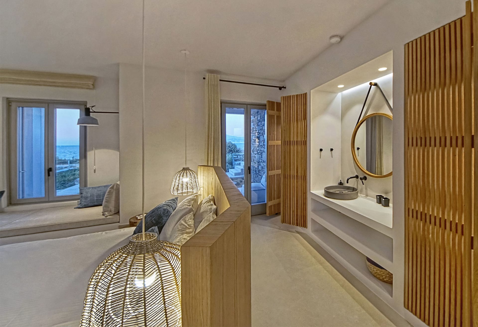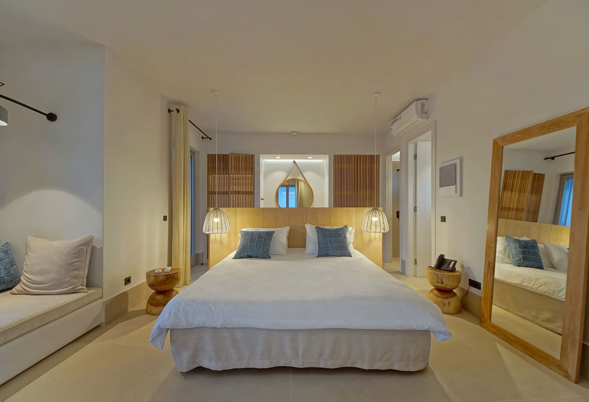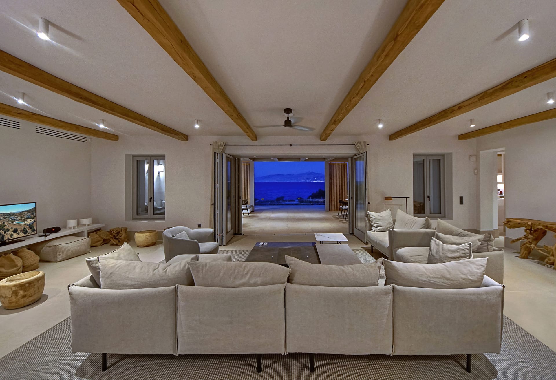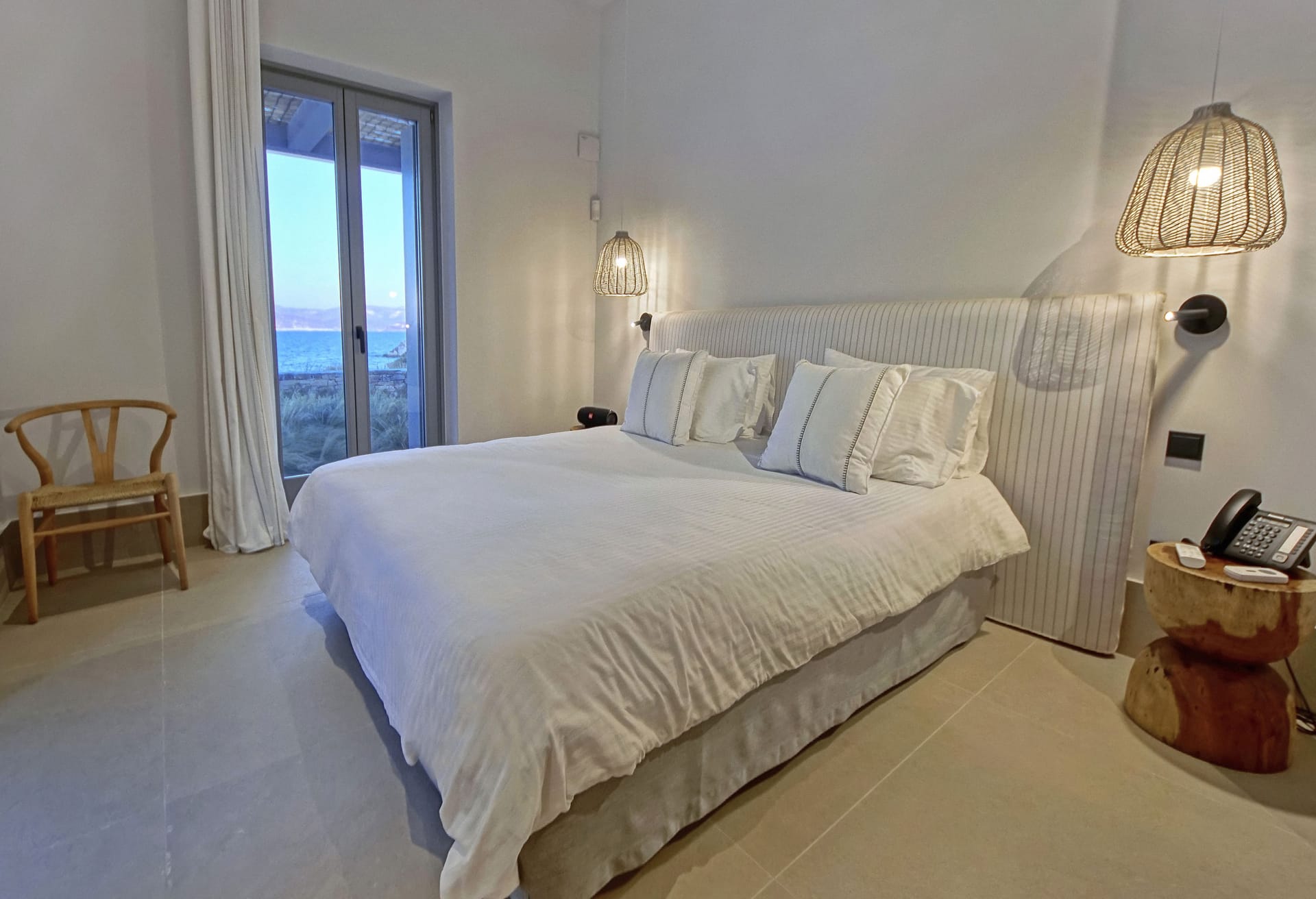 In the interior, dominated by white, the modern esthetics of the Aegean Sea creates the most suitable background for the wooden elements to stand out. The oak beams of the roof, the lighting fixtures, adn the handcrafted decorative items all elevate the overall aesthetics of the building. Designer furniture and fine cotton or linen fabrics come together in a harmonious blend with the bright natural light and the clean surfaces, creating a clear, unpretentious space, interrupted only by the blue color of the sea.