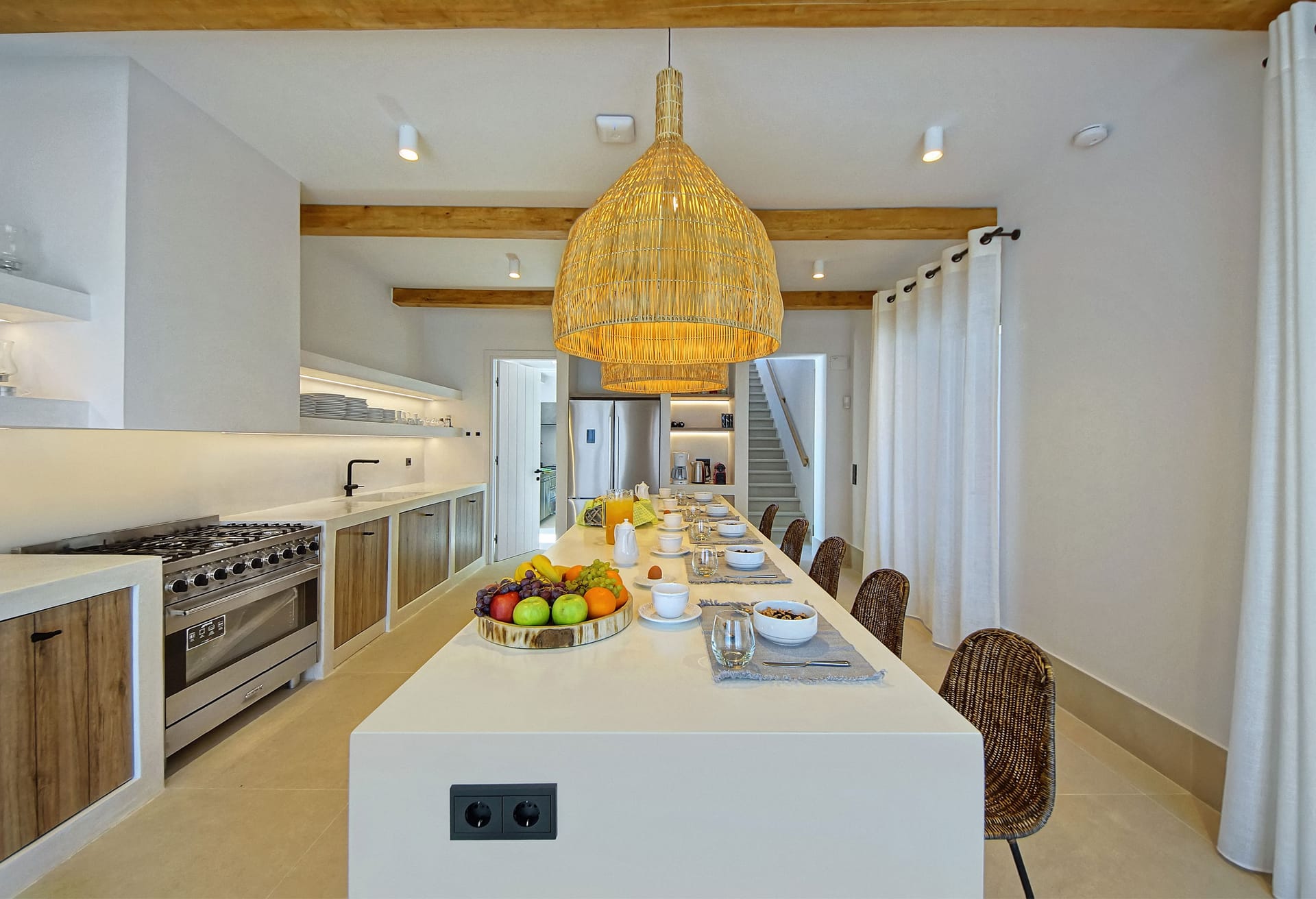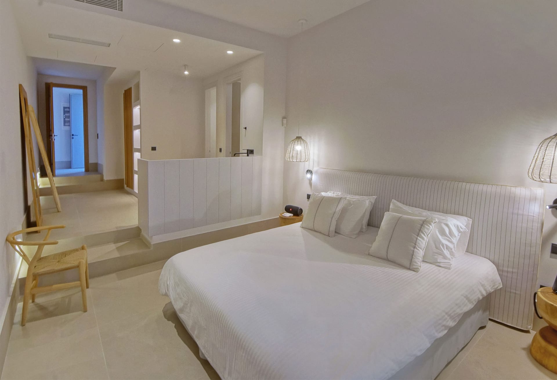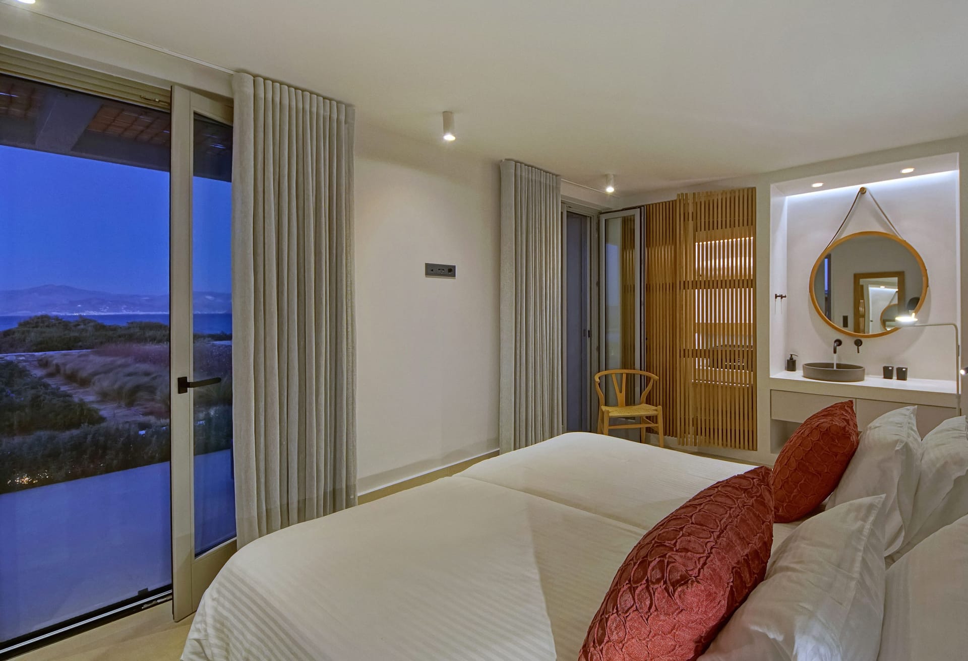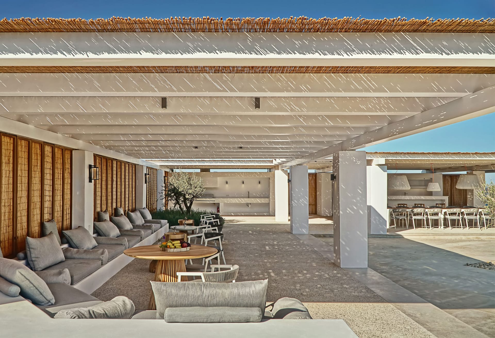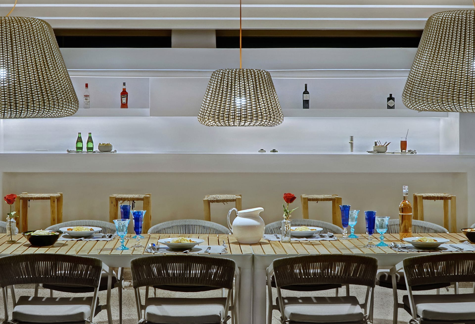 In the interior, dominated by white, the modern esthetics of the Aegean Sea creates the most suitable background for the wooden elements to stand out. The oak beams of the roof, the lighting fixtures, adn the handcrafted decorative items all elevate the overall aesthetics of the building. Designer furniture and fine cotton or linen fabrics come together in a harmonious blend with the bright natural light and the clean surfaces, creating a clear, unpretentious space, interrupted only by the blue color of the sea.