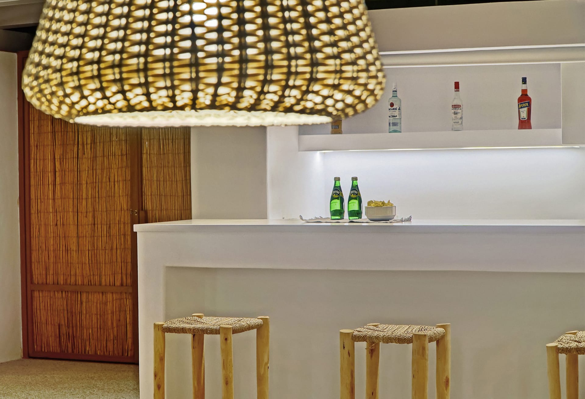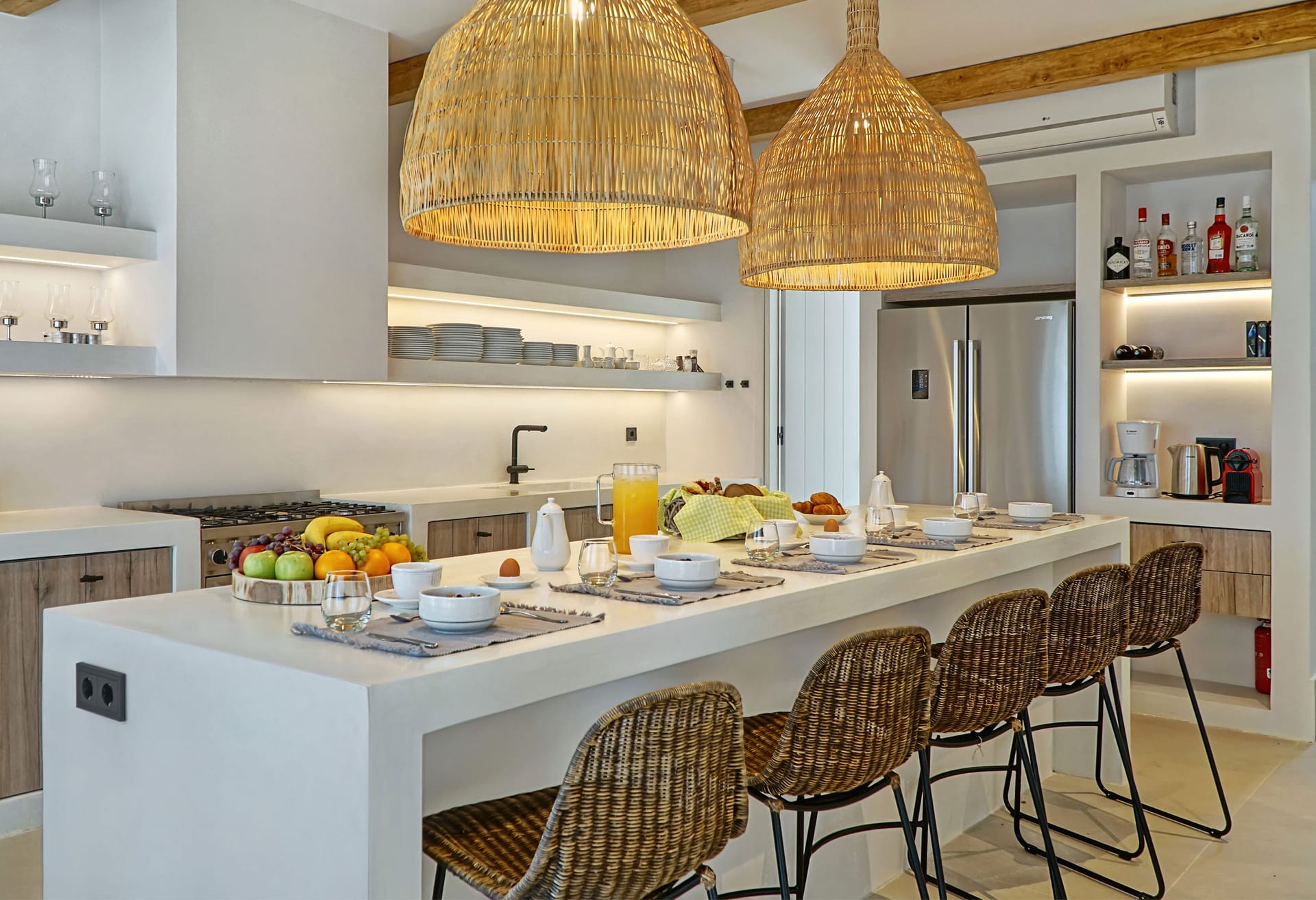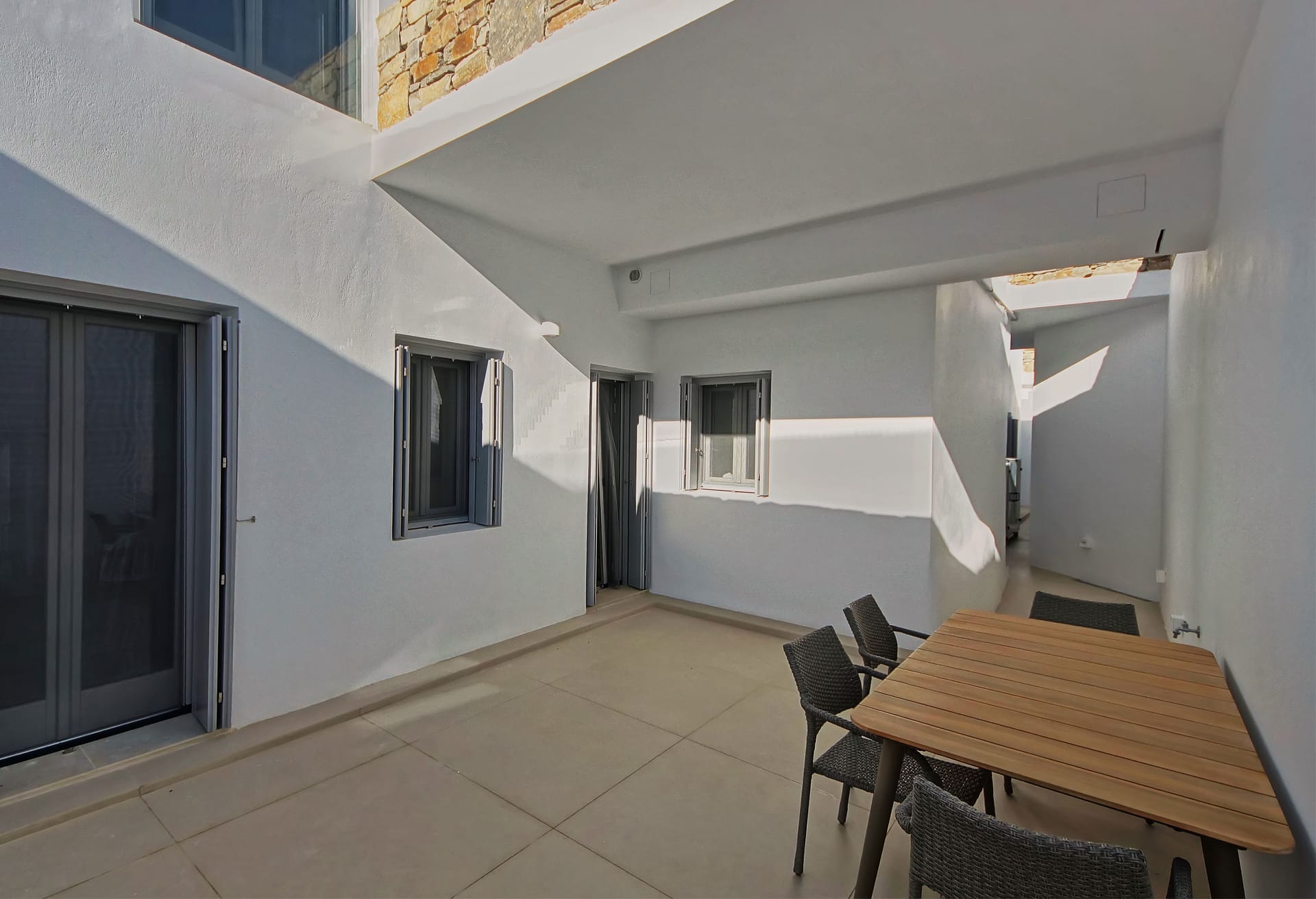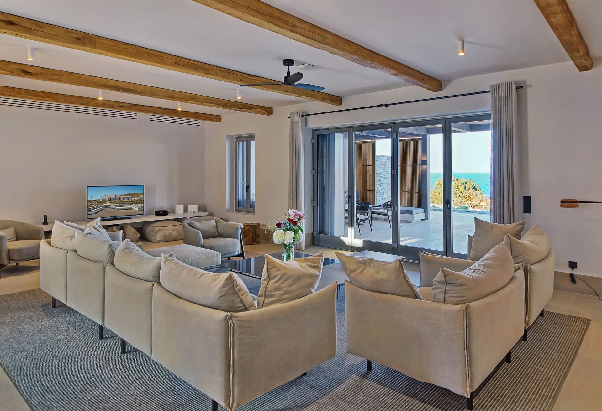 In the interior, dominated by white, the modern esthetics of the Aegean Sea creates the most suitable background for the wooden elements to stand out. The oak beams of the roof, the lighting fixtures, adn the handcrafted decorative items all elevate the overall aesthetics of the building. Designer furniture and fine cotton or linen fabrics come together in a harmonious blend with the bright natural light and the clean surfaces, creating a clear, unpretentious space, interrupted only by the blue color of the sea.