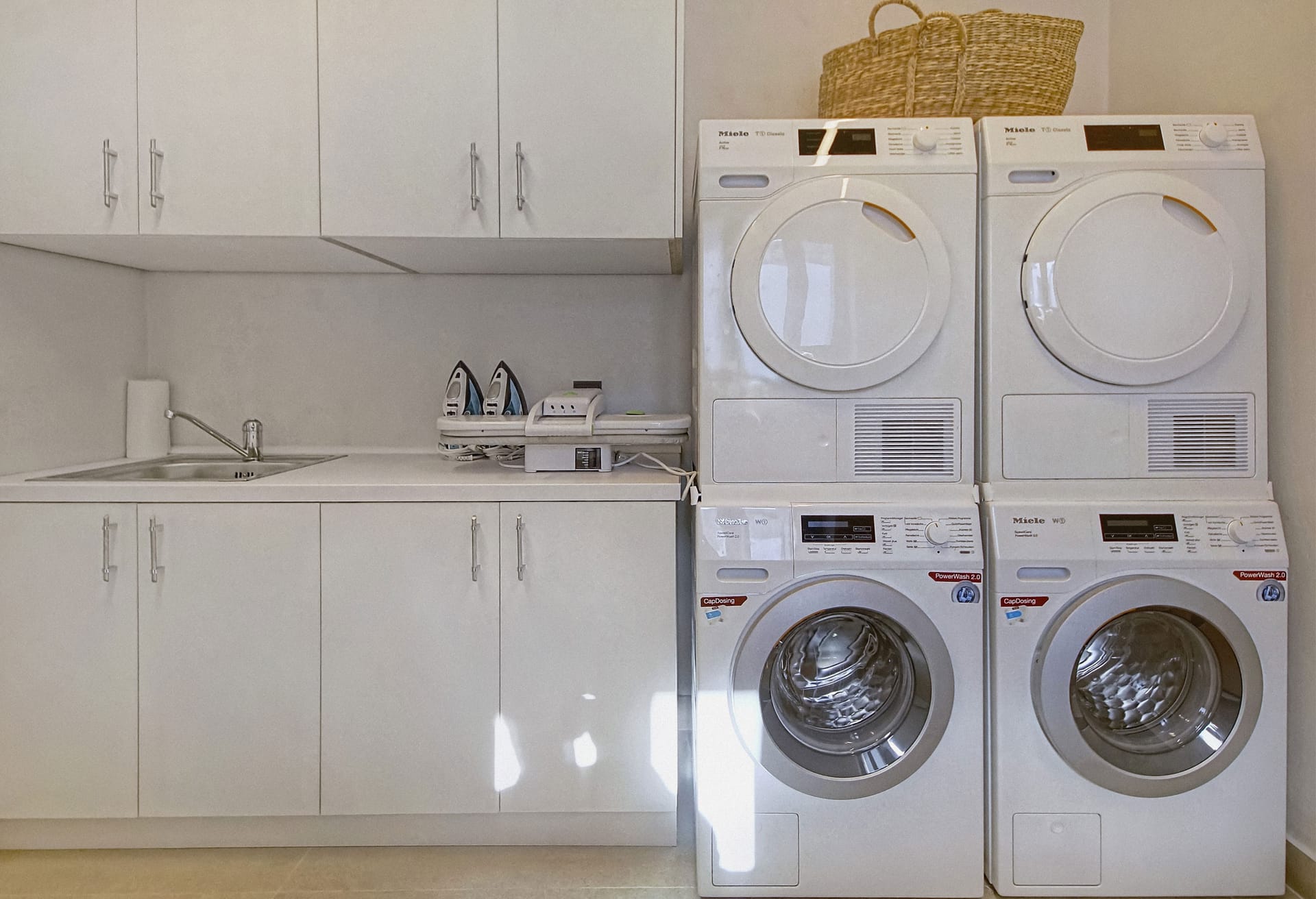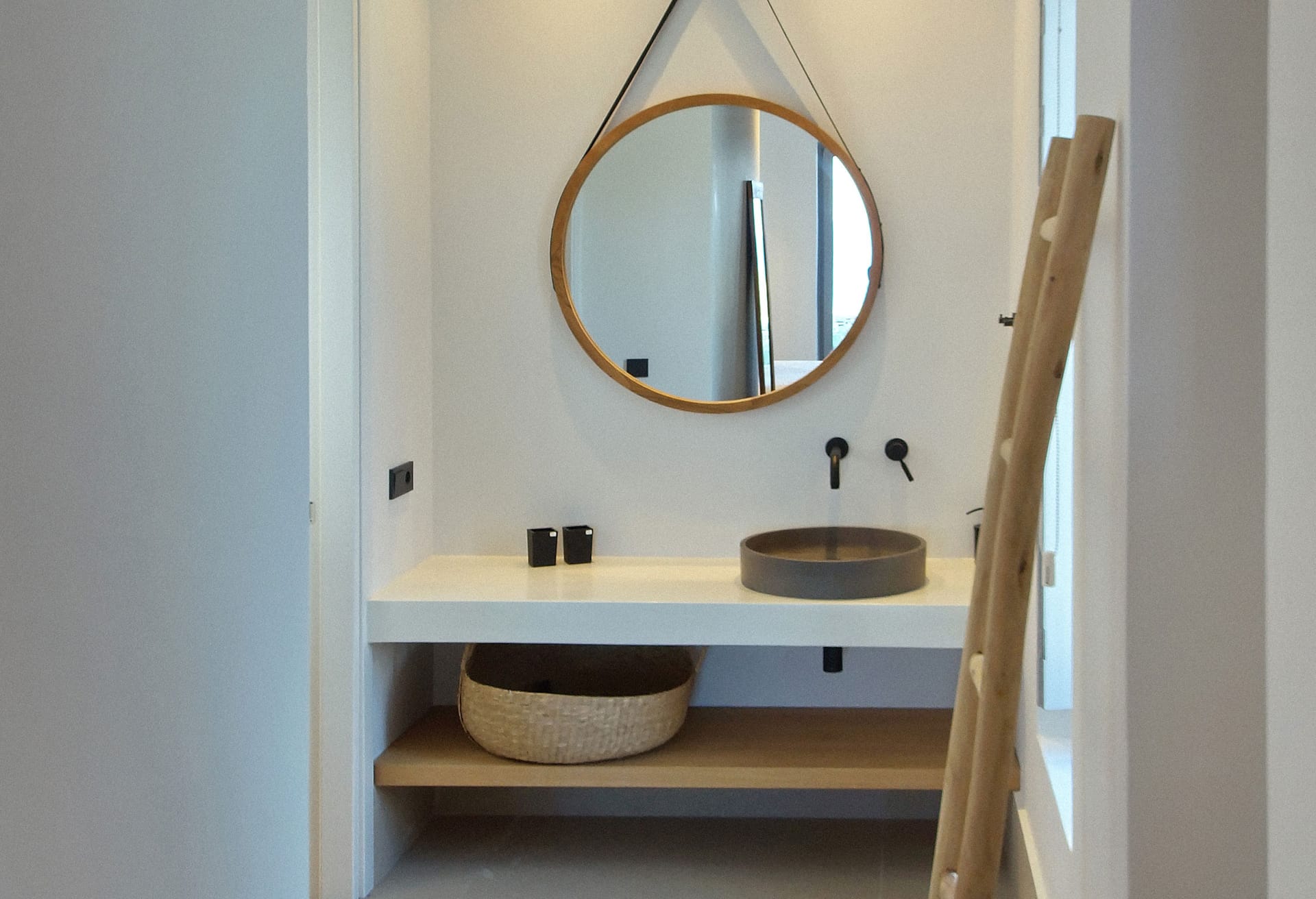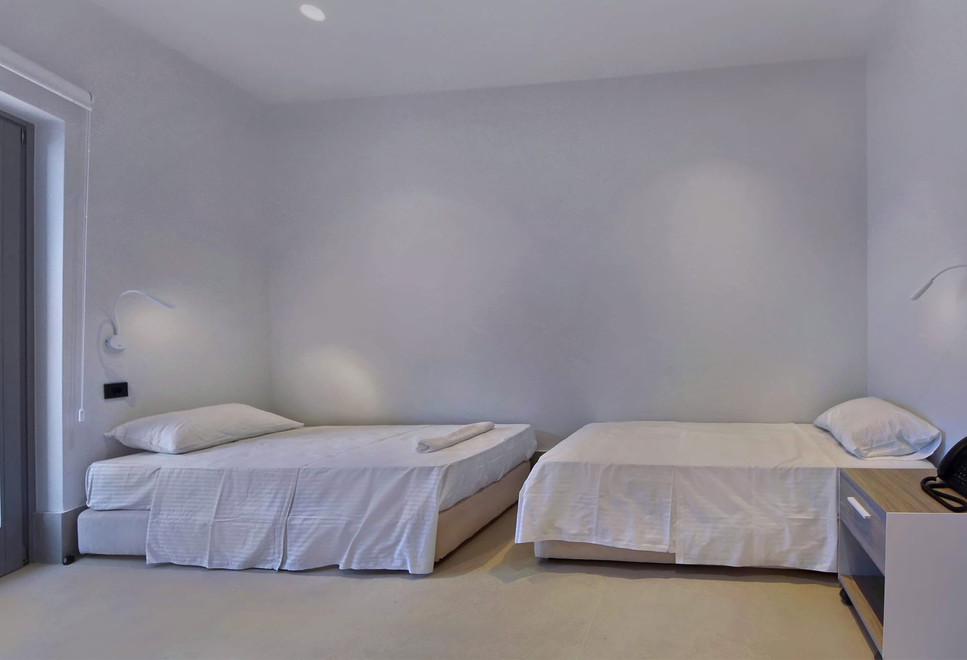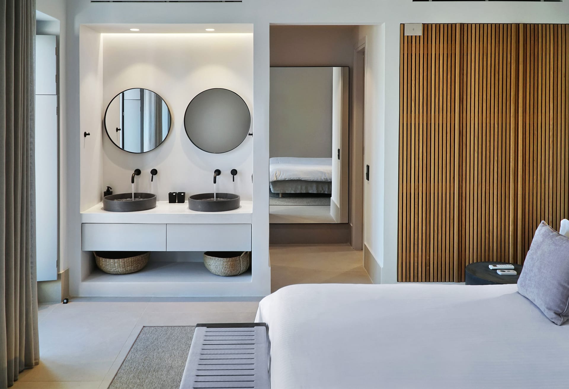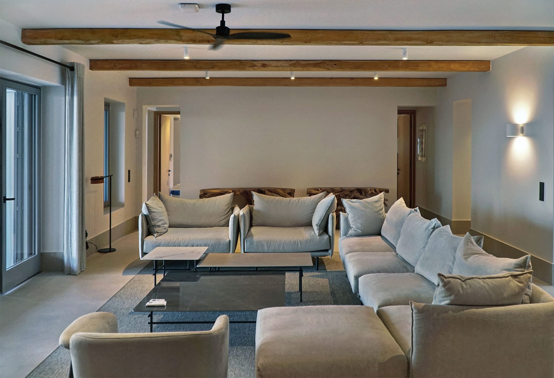 In the interior, dominated by white, the modern esthetics of the Aegean Sea creates the most suitable background for the wooden elements to stand out. The oak beams of the roof, the lighting fixtures, adn the handcrafted decorative items all elevate the overall aesthetics of the building. Designer furniture and fine cotton or linen fabrics come together in a harmonious blend with the bright natural light and the clean surfaces, creating a clear, unpretentious space, interrupted only by the blue color of the sea.