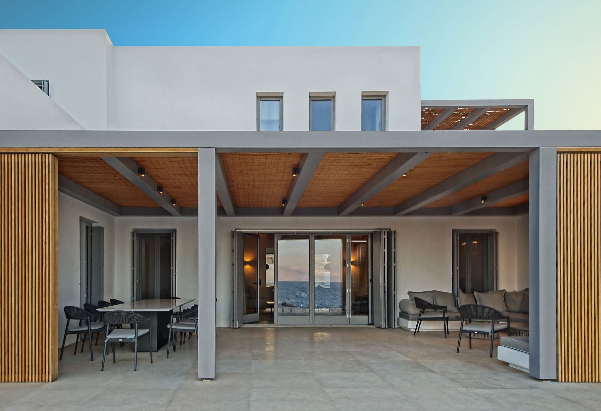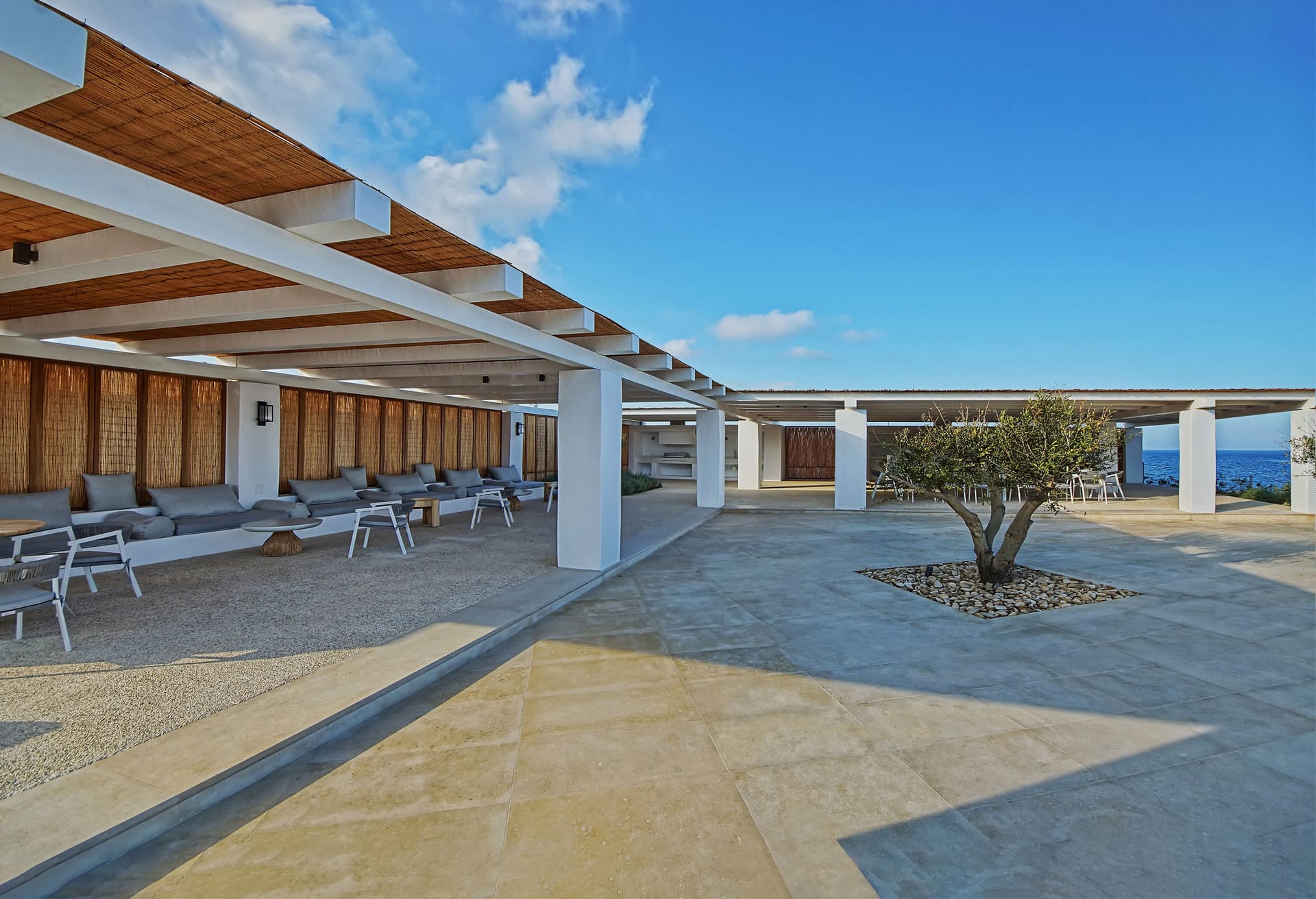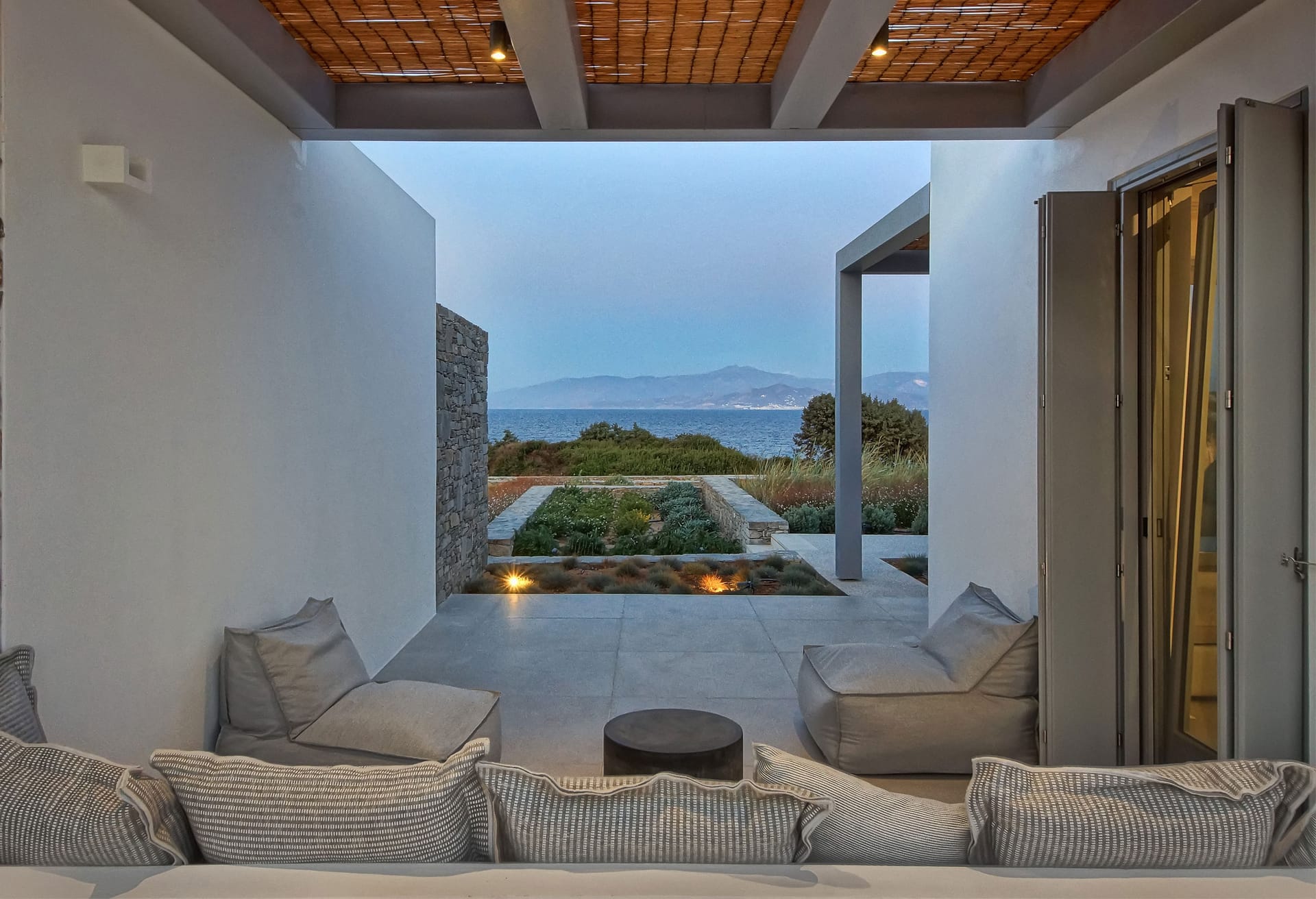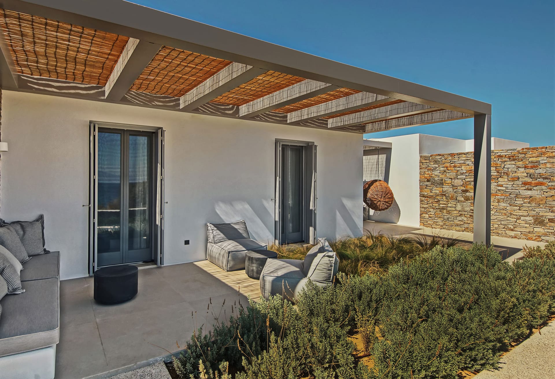The outdoor area provides an immersive sense of serenity, with main material that complement perfectly the natural environment surrounding the villa. The impressive swimming pool covers an area of over 100 sq.m and works as the natural contuation of the sea. The oversized open-air loung overlooking the Aegean, together with the outdoor dining area, well-protected from the strong summer winds of the Mediterranean, as well as all other outdoor corners, are all created in a way to help your open-air gatherings and get-together with guests, at all hours.