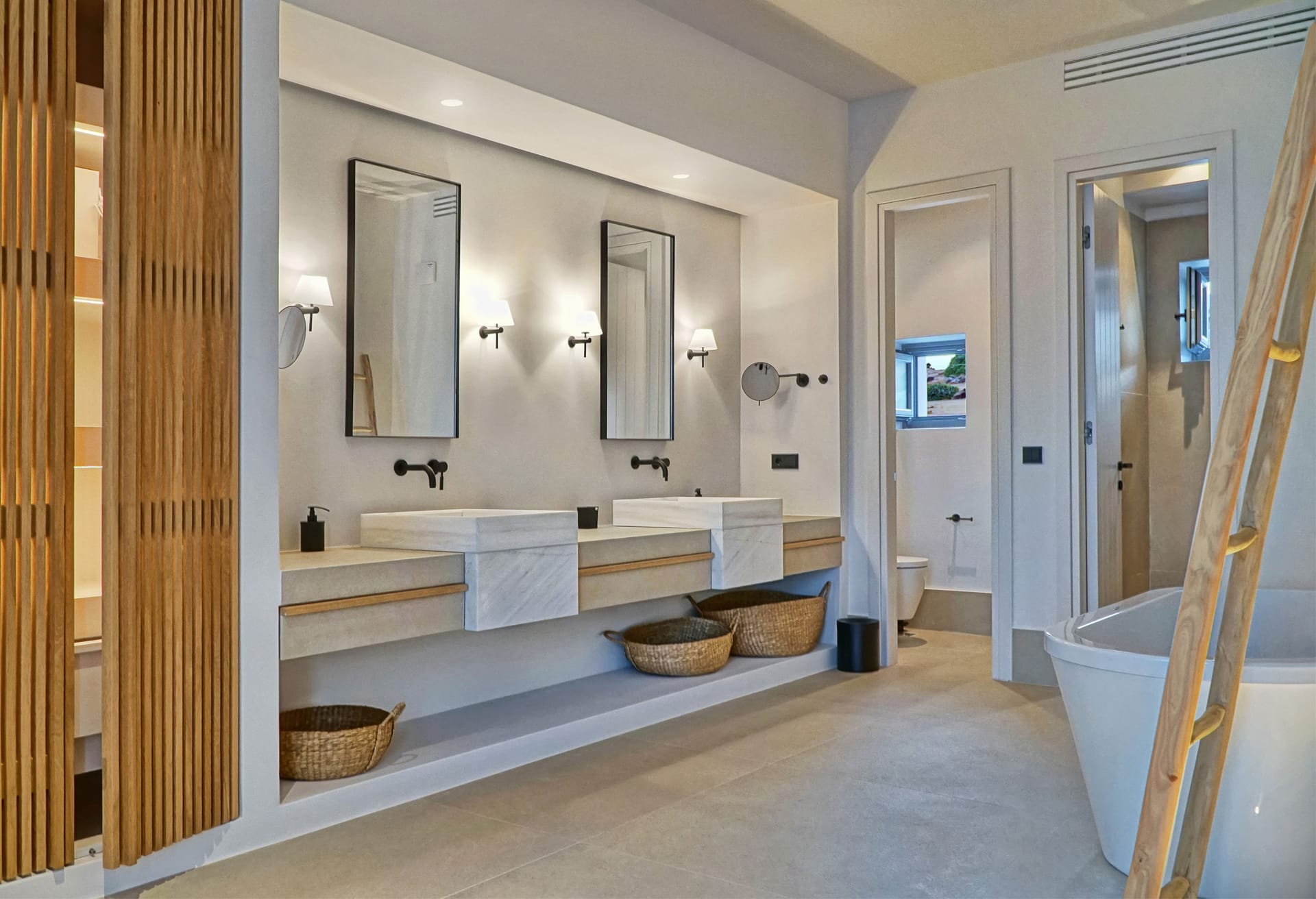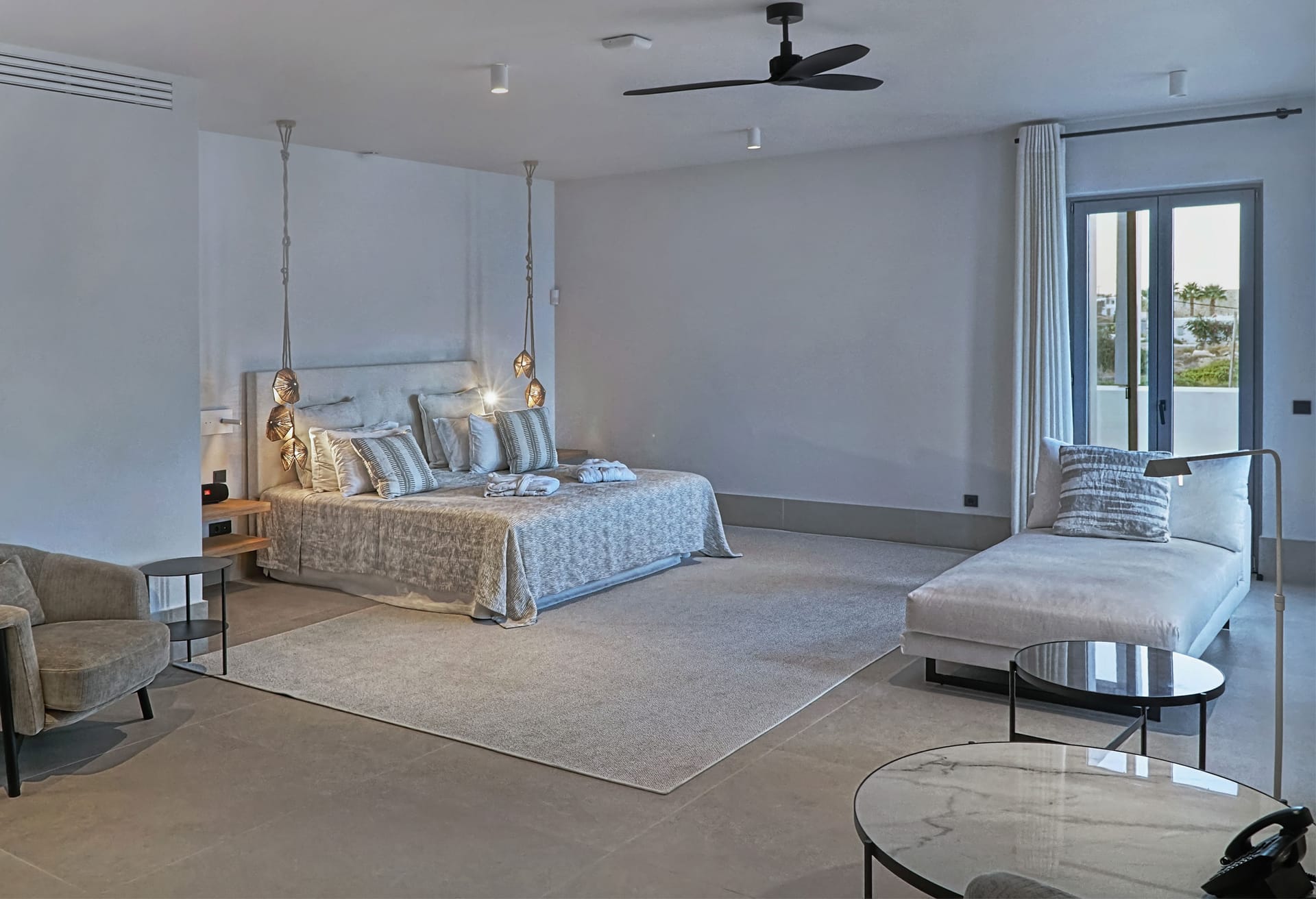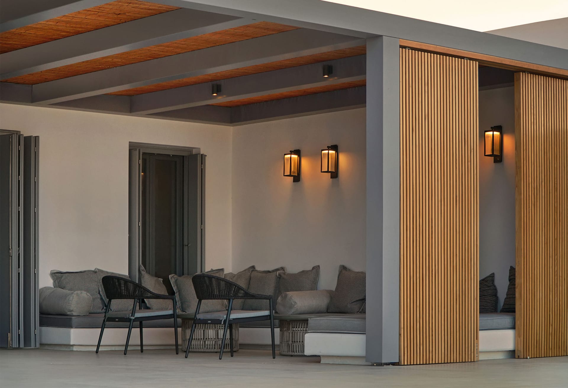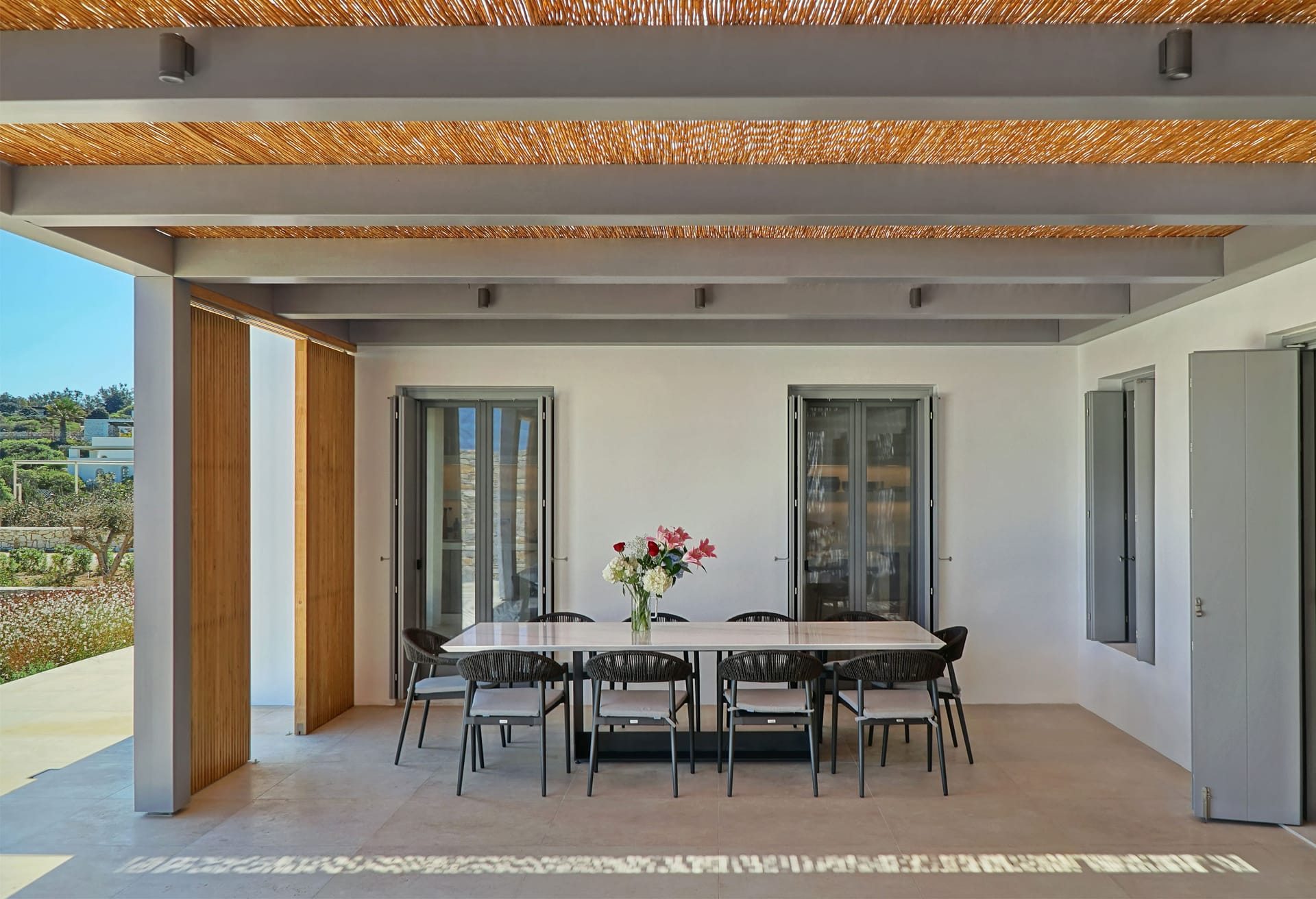 The outdoor area provides an immersive sense of serenity, with main material that complement perfectly the natural environment surrounding the villa. The impressive swimming pool covers an area of over 100 sq.m and works as the natural contuation of the sea. The oversized open-air loung overlooking the Aegean, together with the outdoor dining area, well-protected from the strong summer winds of the Mediterranean, as well as all other outdoor corners, are all created in a way to help your open-air gatherings and get-together with guests, at all hours.
