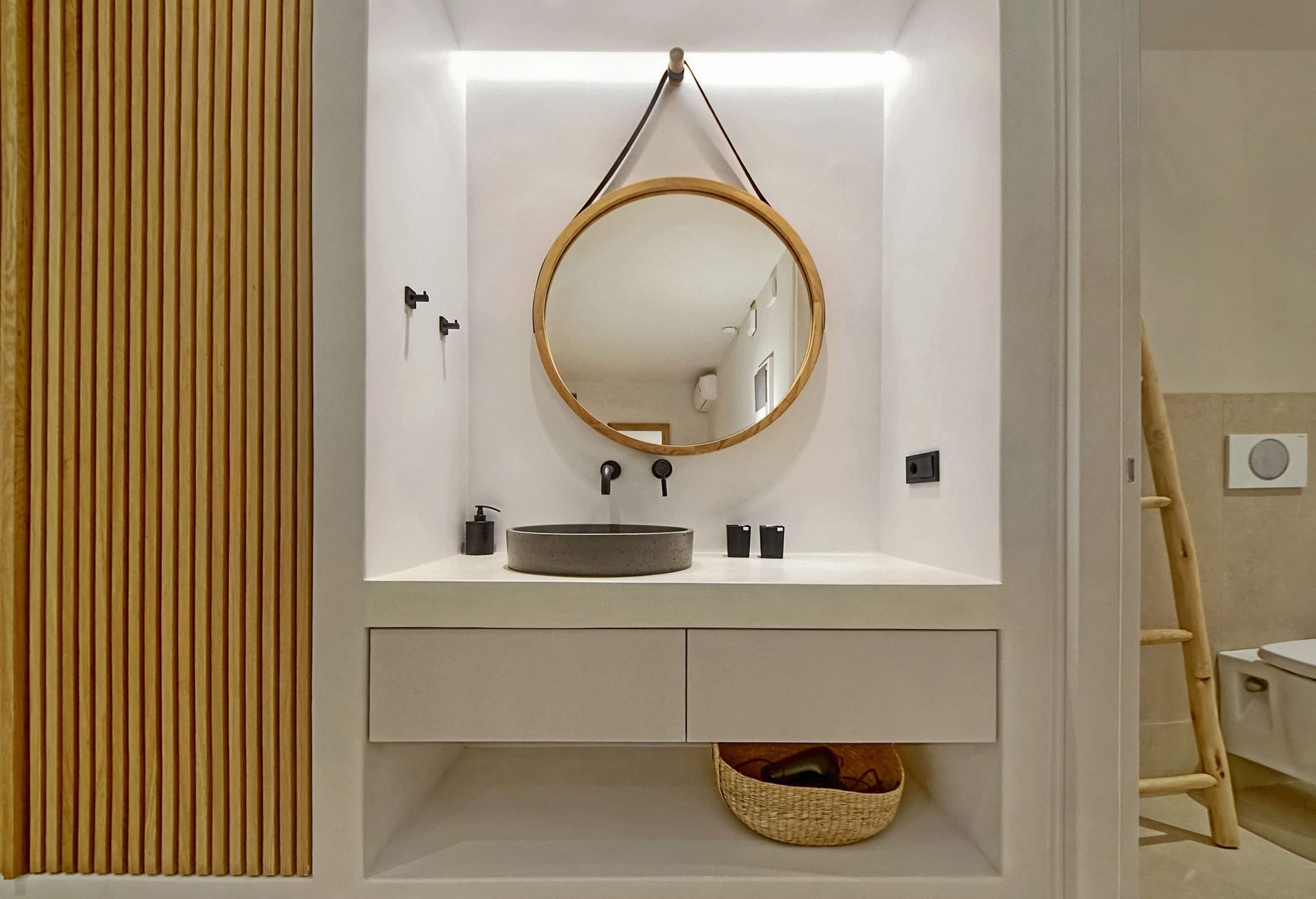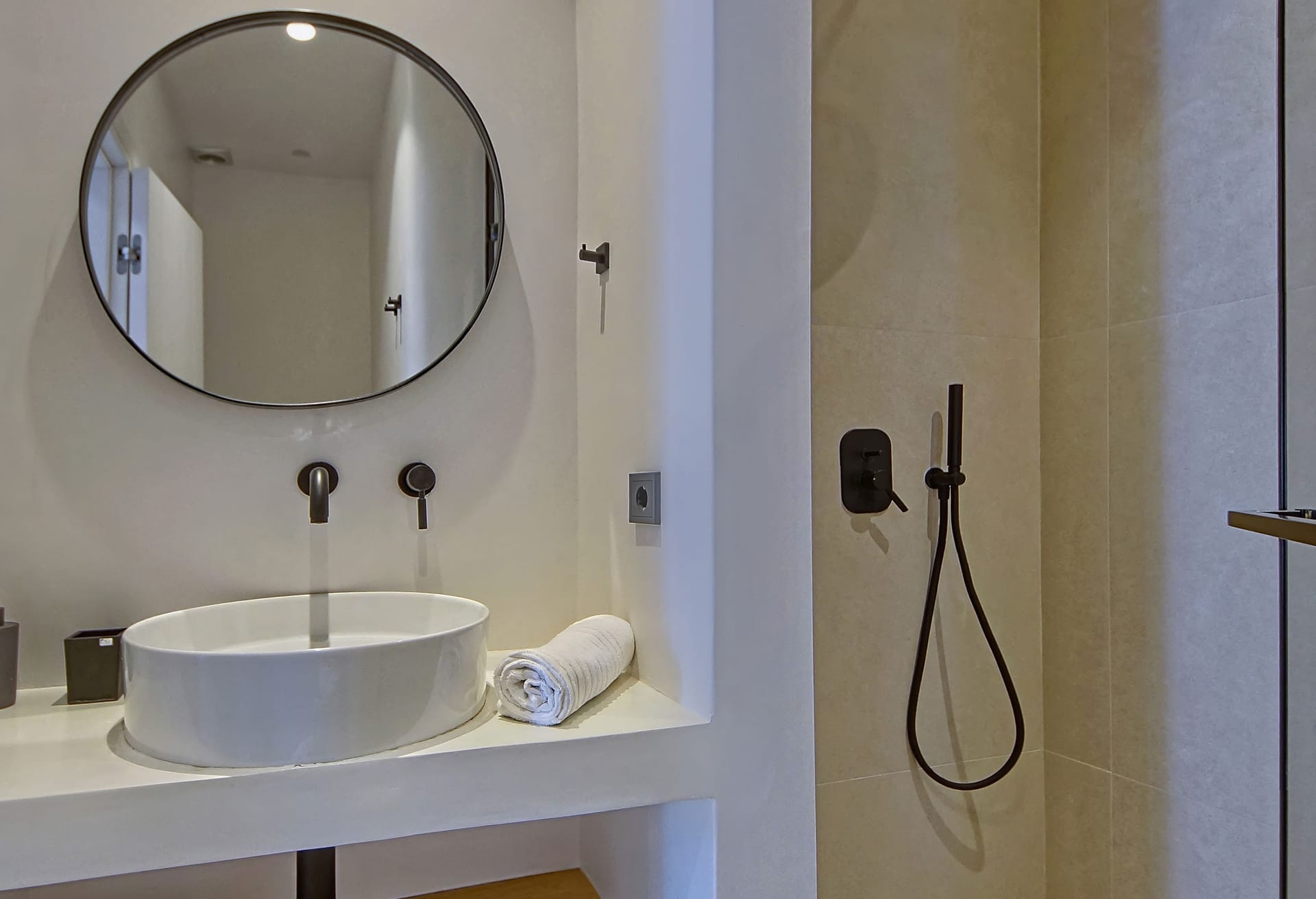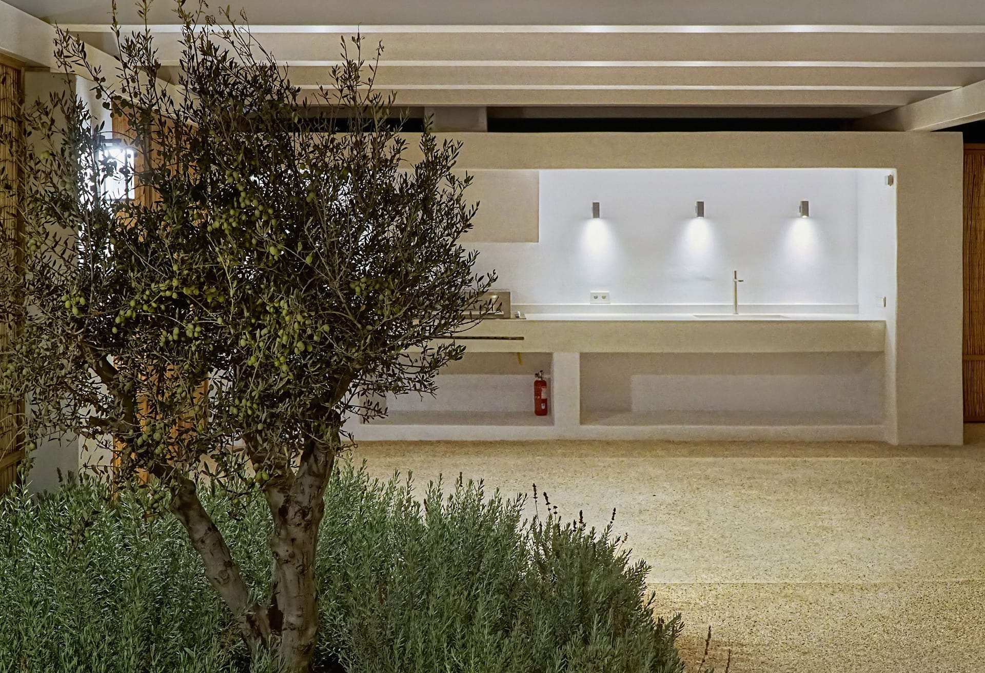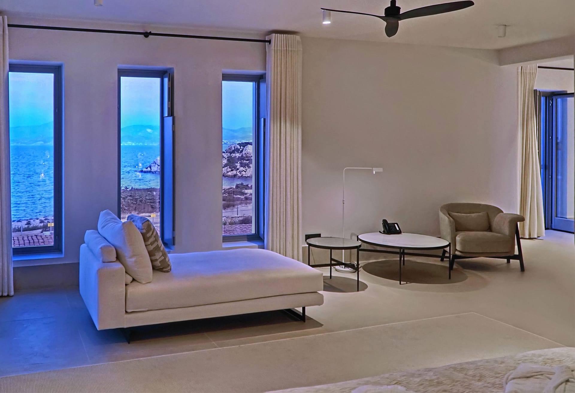 The outdoor area provides an immersive sense of serenity, with main material that complement perfectly the natural environment surrounding the villa. The impressive swimming pool covers an area of over 100 sq.m and works as the natural contuation of the sea. The oversized open-air loung overlooking the Aegean, together with the outdoor dining area, well-protected from the strong summer winds of the Mediterranean, as well as all other outdoor corners, are all created in a way to help your open-air gatherings and get-together with guests, at all hours.