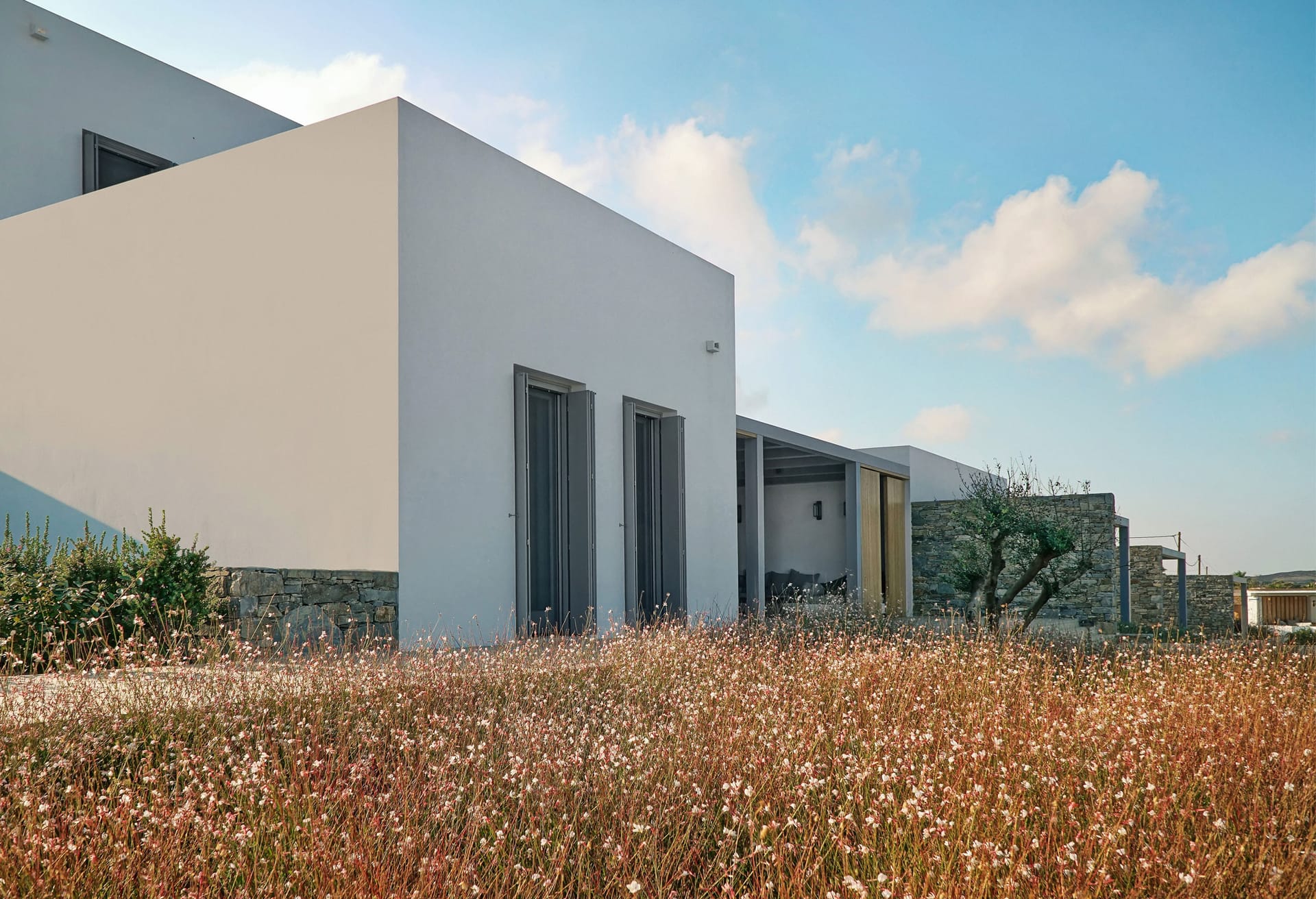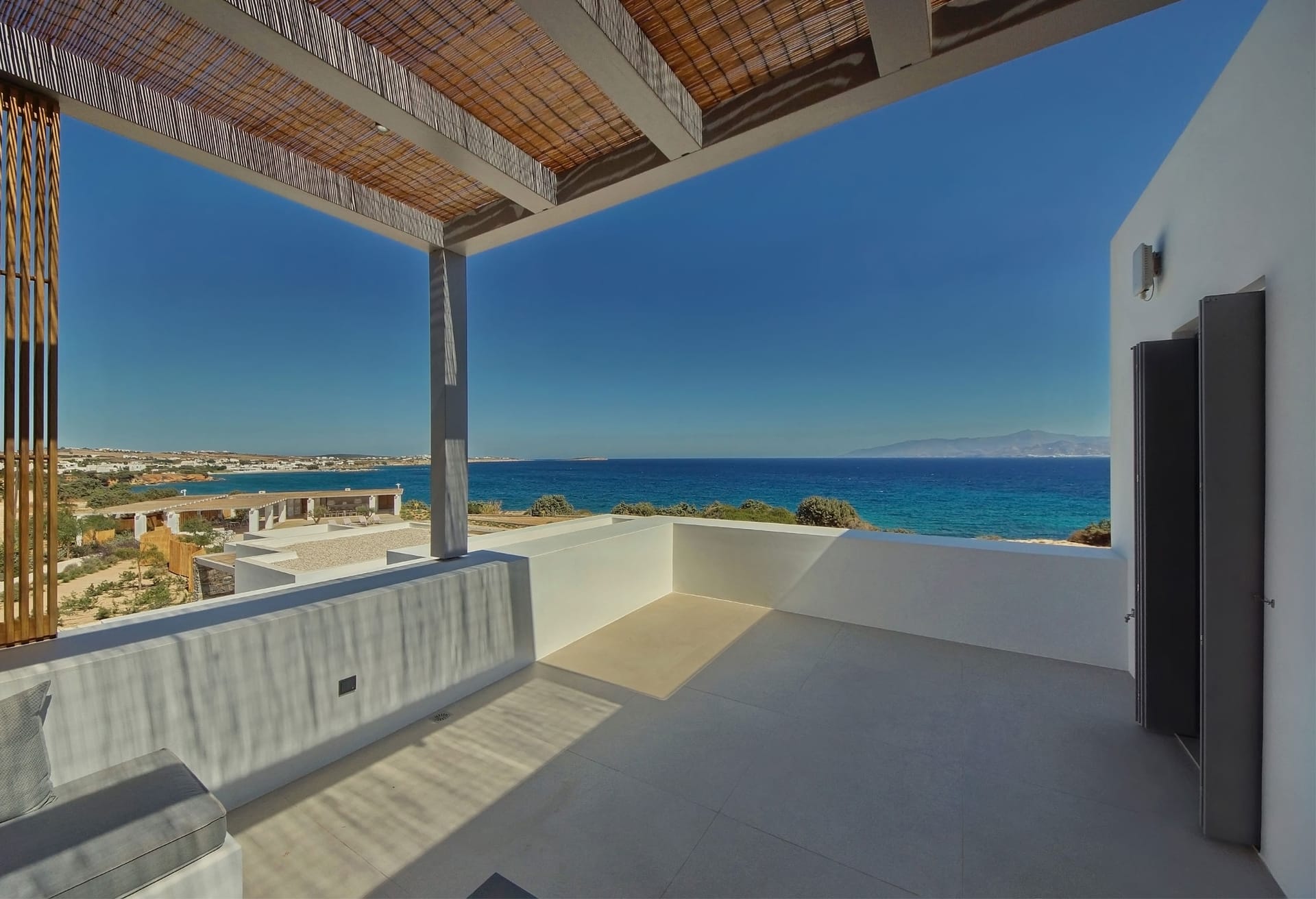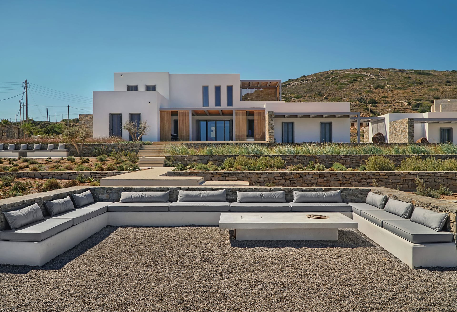 Brand New Summer Villa. In the picturesque village of Ampelas, the perfect setting unfolds against a background where the Cycladic landscape remains untouched. The magical island comes together in a unique combination with the miniman architecture of villa Astir, creating an unpretentiously luxurious environment, engukfed in absolute tranquility. The brand-new summer villa is in total harmony with the wilderness of the landscape. Its privileged location offers a unique sense of privacy, while at the same time the minimal design, characterized by austere, clean lines, together with the unobstructed view to the sea, can effortlessly relax its visitors.