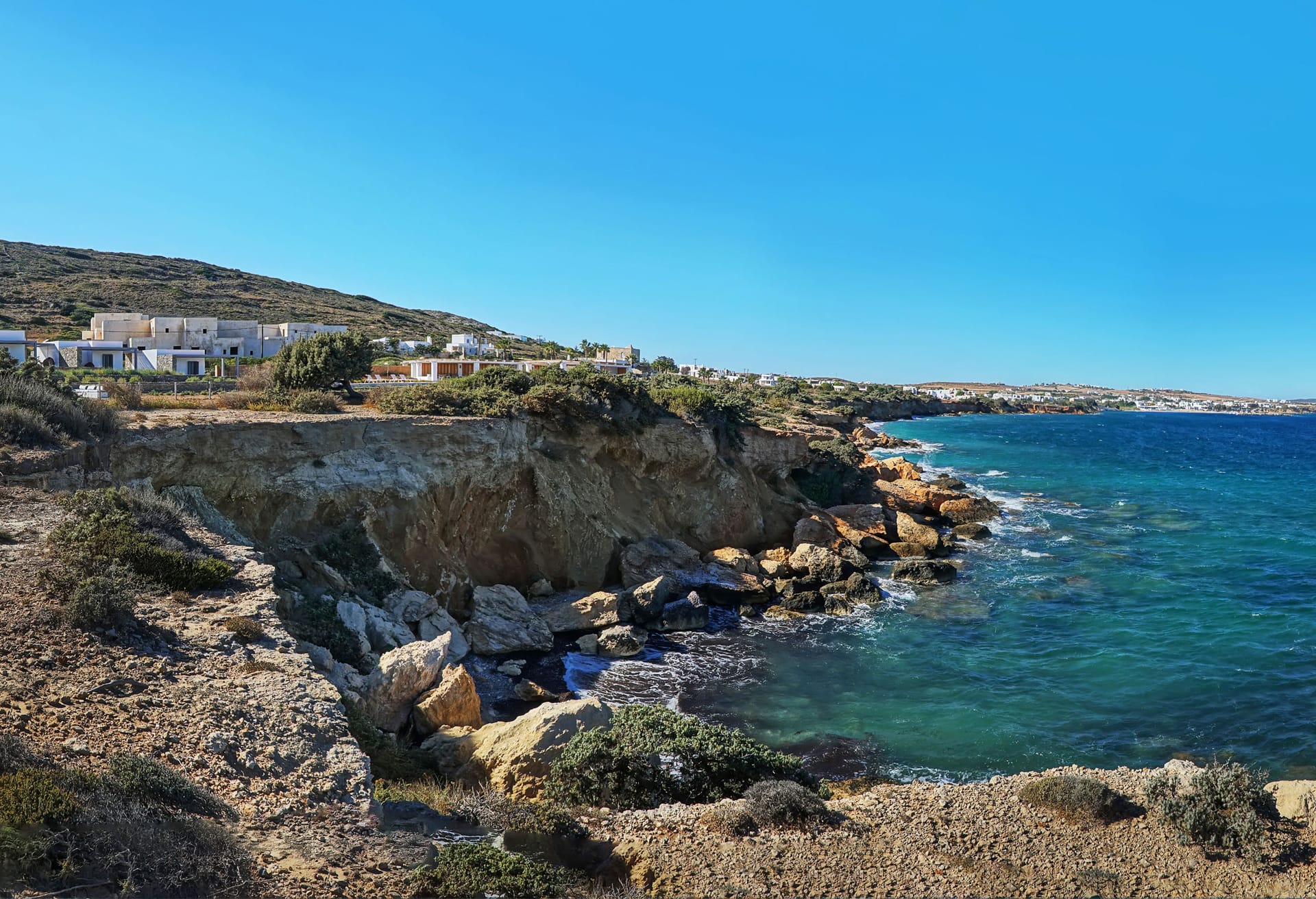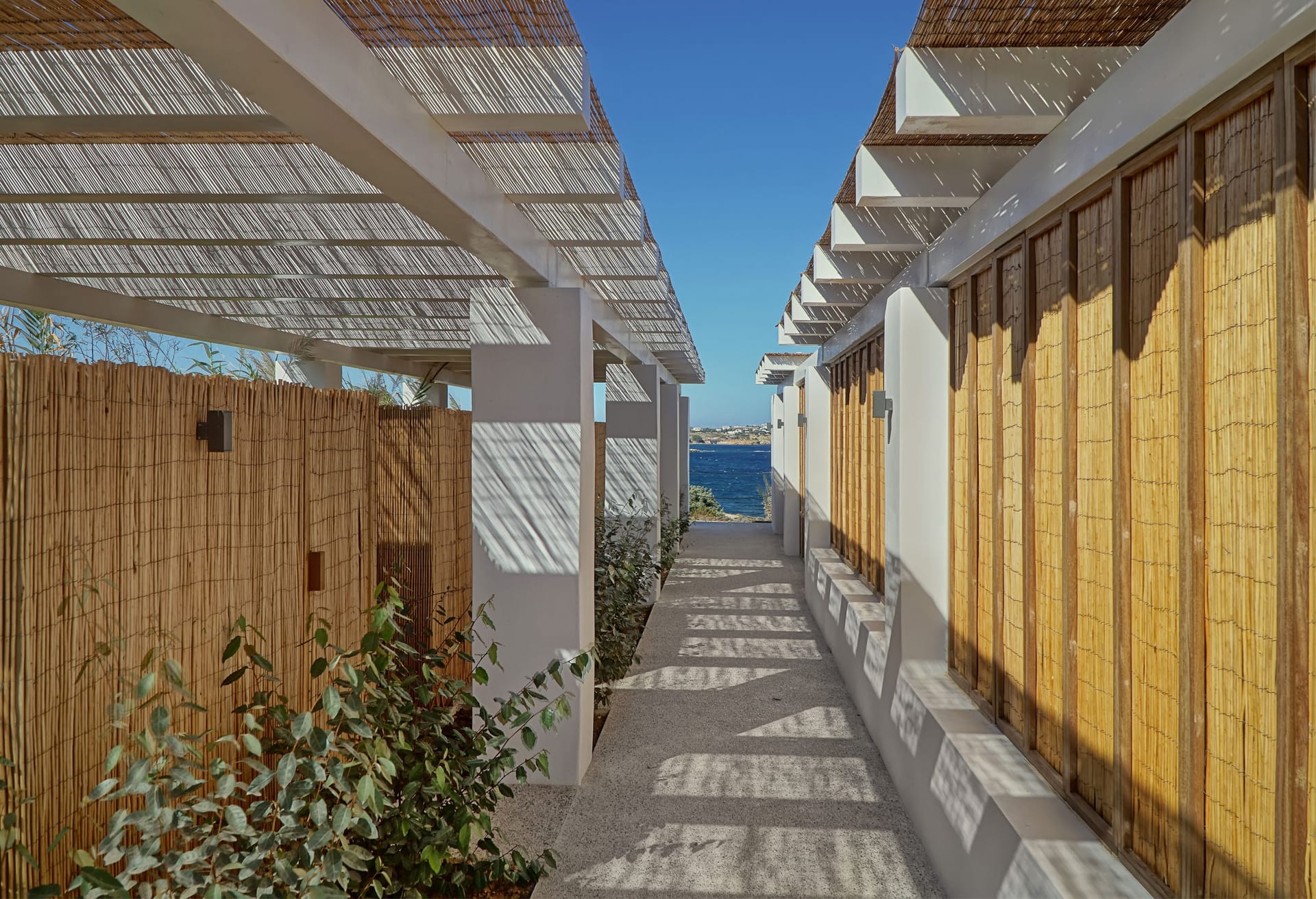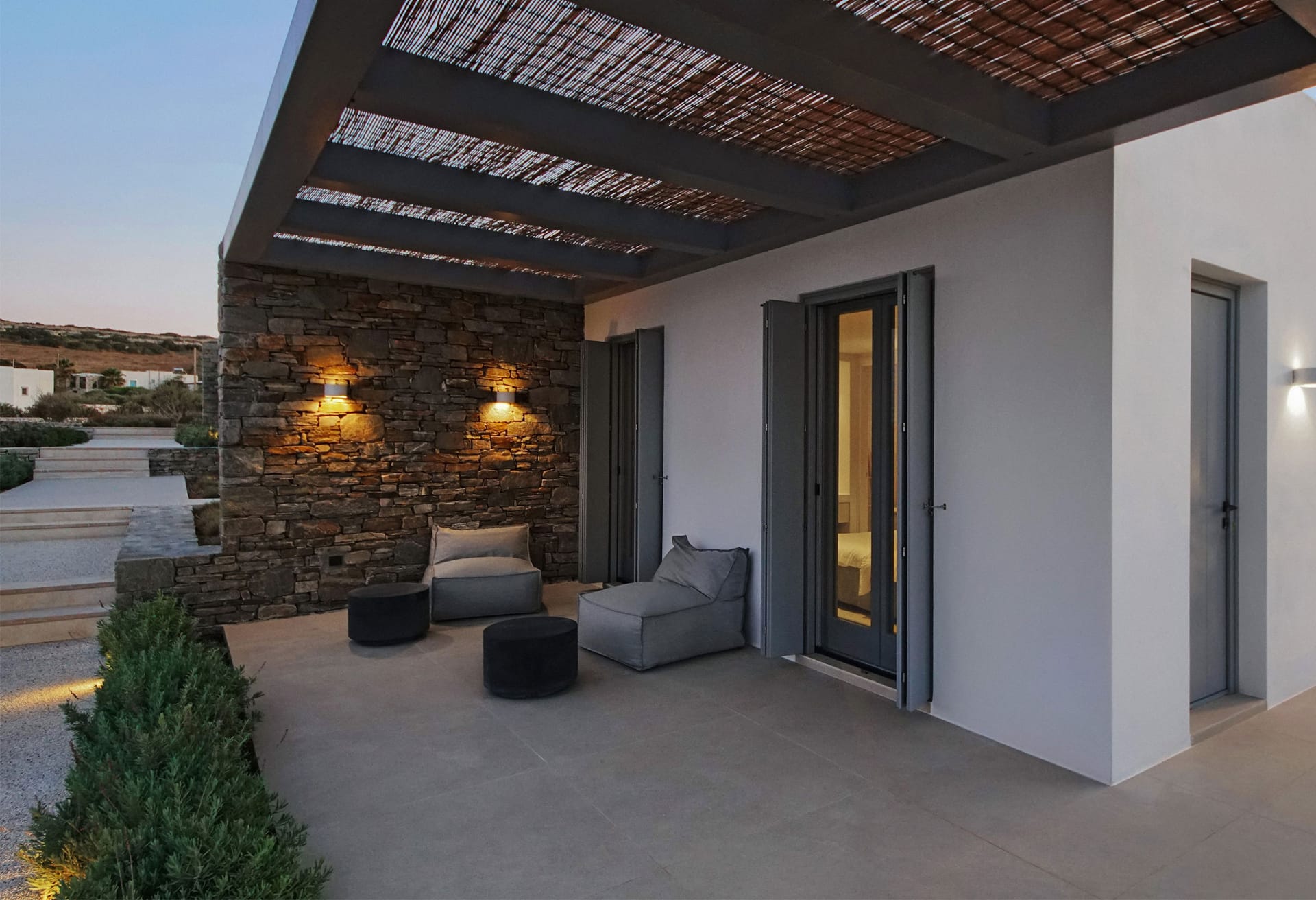 Brand New Summer Villa. In the picturesque village of Ampelas, the perfect setting unfolds against a background where the Cycladic landscape remains untouched. The magical island comes together in a unique combination with the miniman architecture of villa Astir, creating an unpretentiously luxurious environment, engukfed in absolute tranquility. The brand-new summer villa is in total harmony with the wilderness of the landscape. Its privileged location offers a unique sense of privacy, while at the same time the minimal design, characterized by austere, clean lines, together with the unobstructed view to the sea, can effortlessly relax its visitors.
