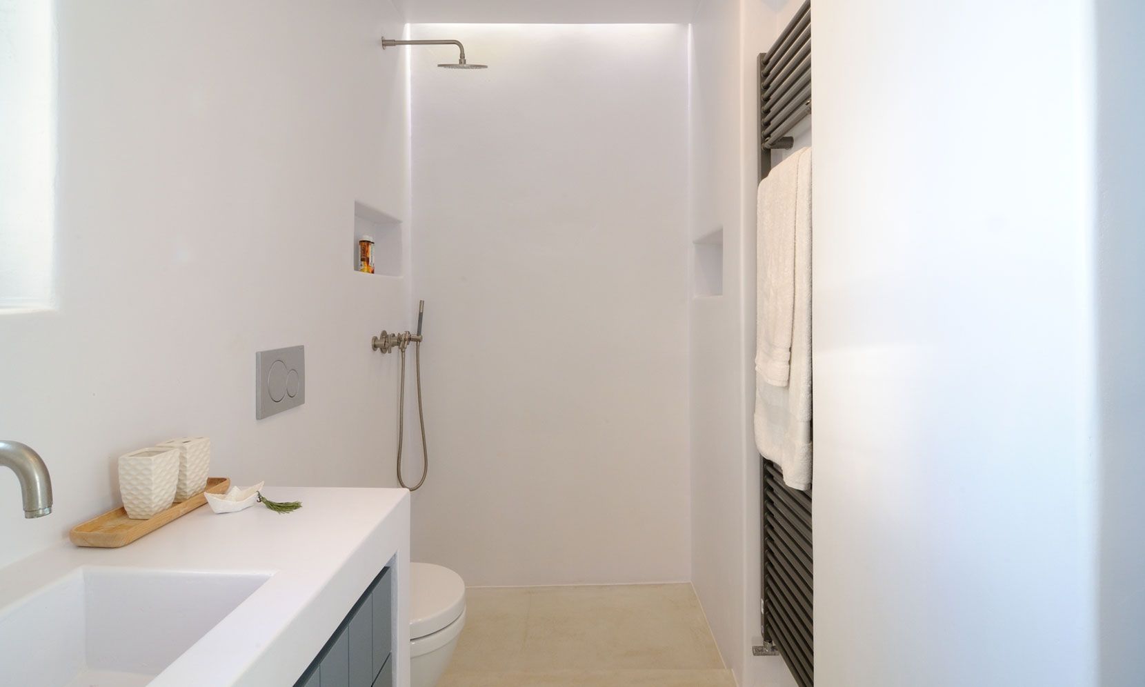 The front door of Paros Villa Ianthe leads to the spacious and charmingly furnished open plan living room and dining area with stunning views to the indigo sea as well as the kitchen. On this floor there is also a double bedroom with en-suite bathroom with shower decorated in white and blue nuances giving a navy feel to the atmosphere and a fully equipped kitchen for culinary delights.