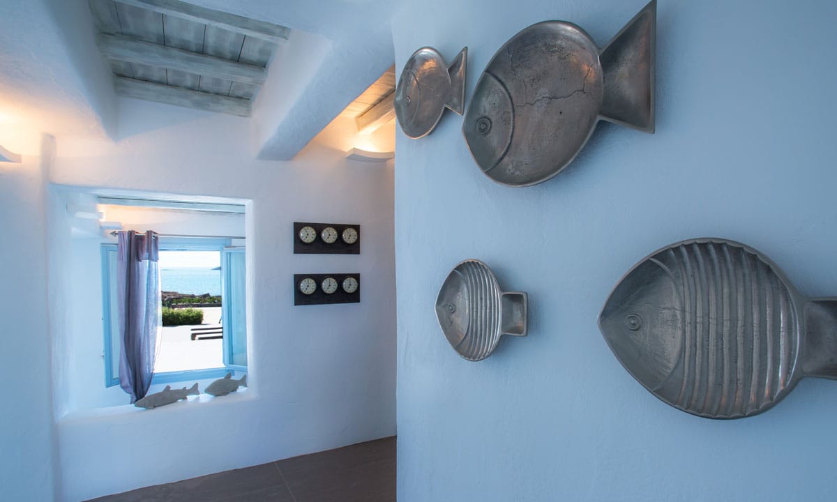 From its upper-level bedroom balconies, one can enjoy the breathtaking sunset views of the Aegean Sea. A ceramic-tiled patio, located at pool level, offers the ideal setting for al-fresco dining. Located in the fashionable Golden Beach area, the villa offers quiet and relaxed surroundings.