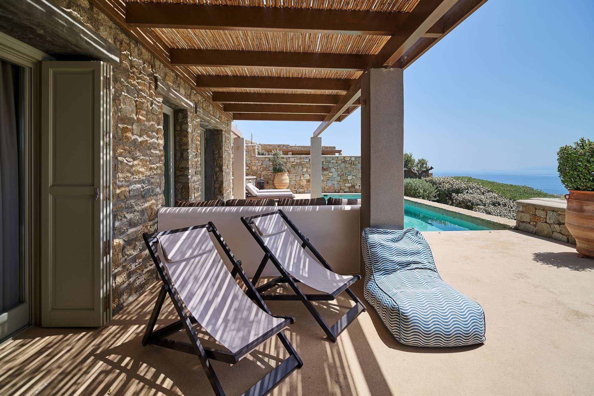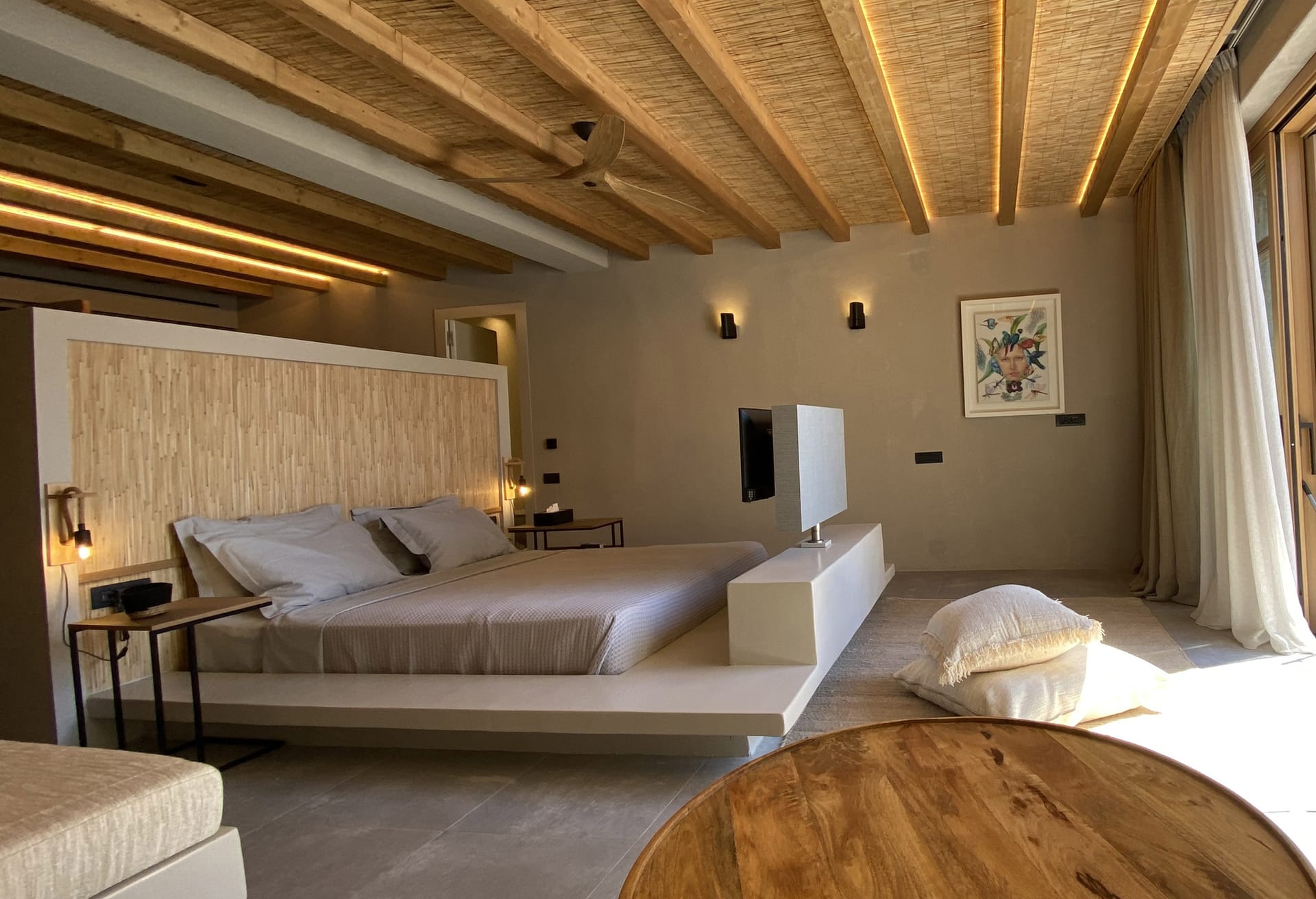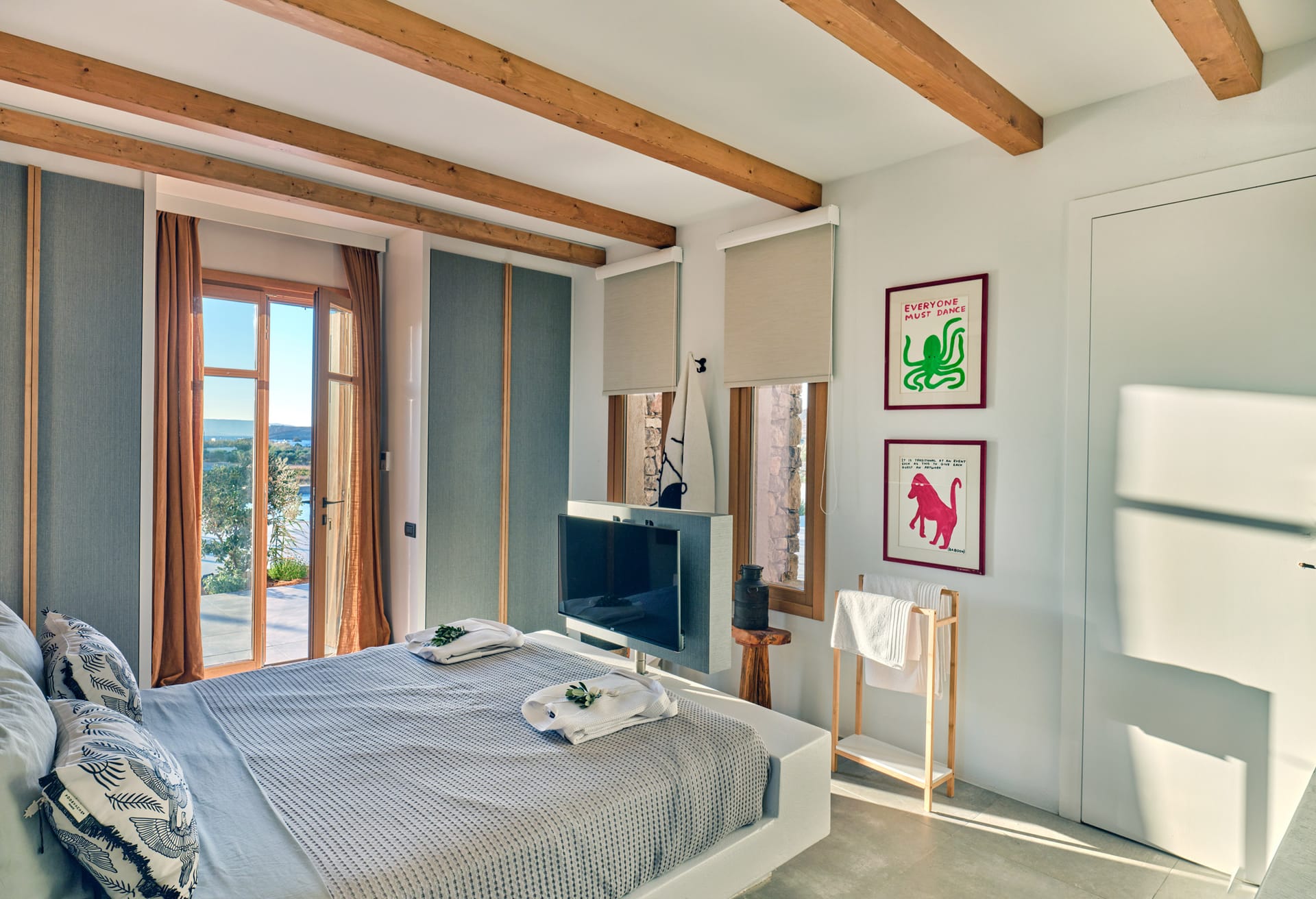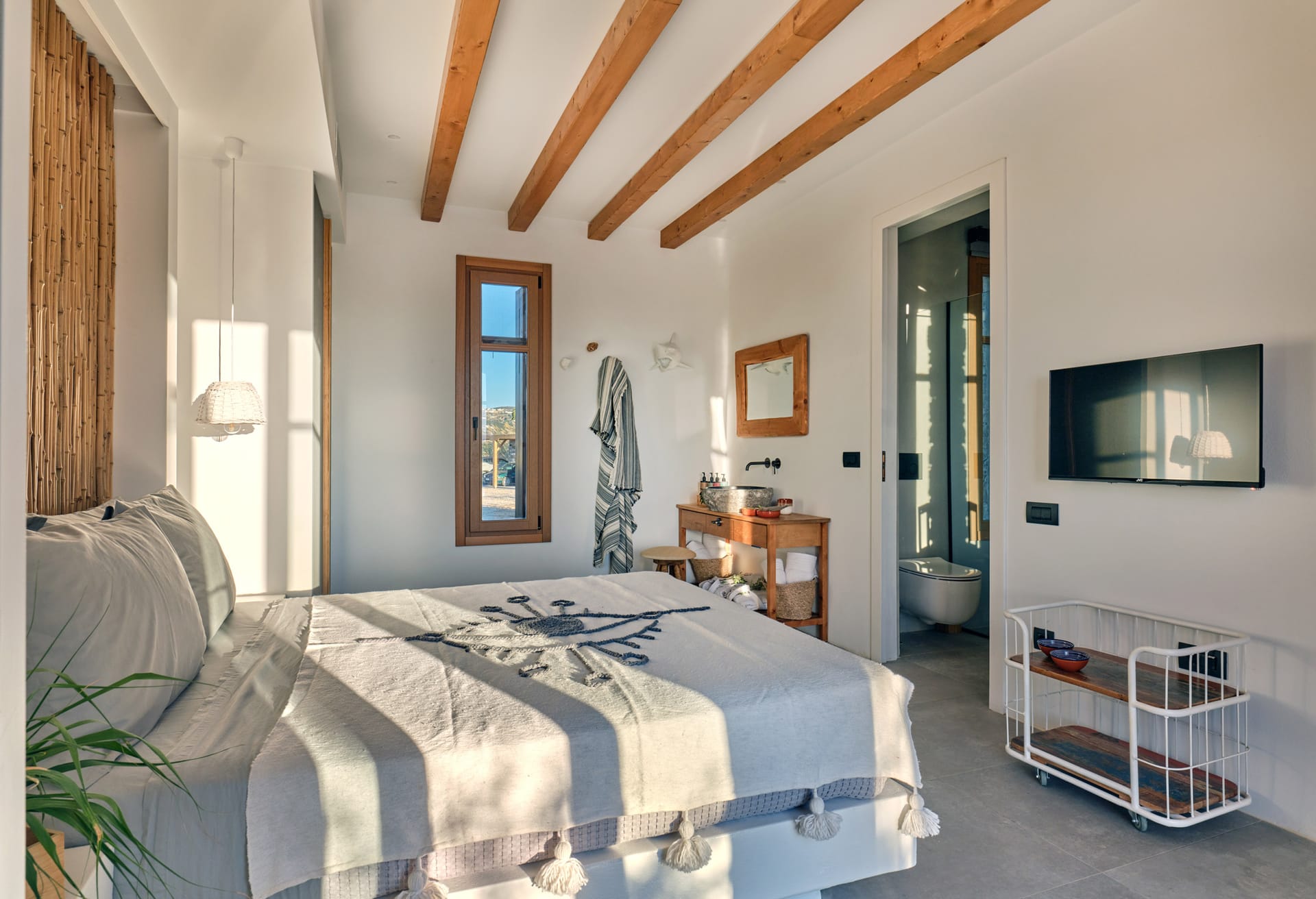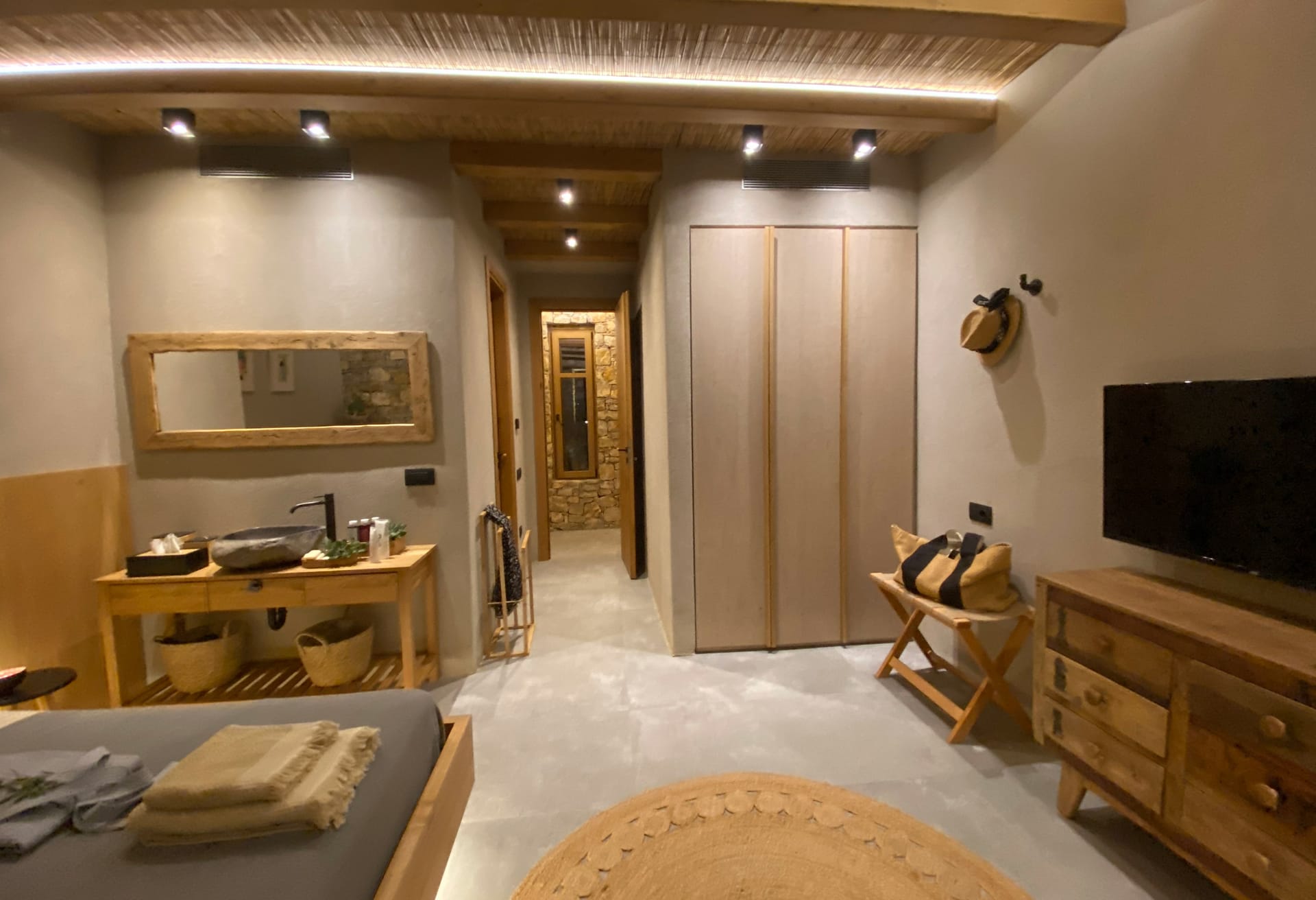 A private pool with a breathtaking view is available, and guests are also close to one of the best sandy beaches on the island (5 minutes away). In addition, there is a well-equipped in-house private gym and a yoga and meditation area on the terrace with a heated jacuzzi. The heating and cooling systems in the farmhouse can be adjusted independently, making it a pleasant retreat no matter the season.