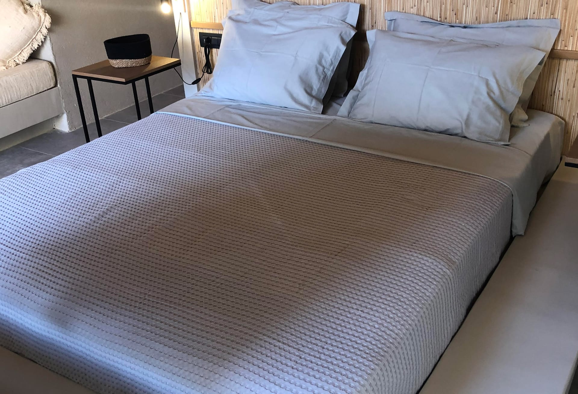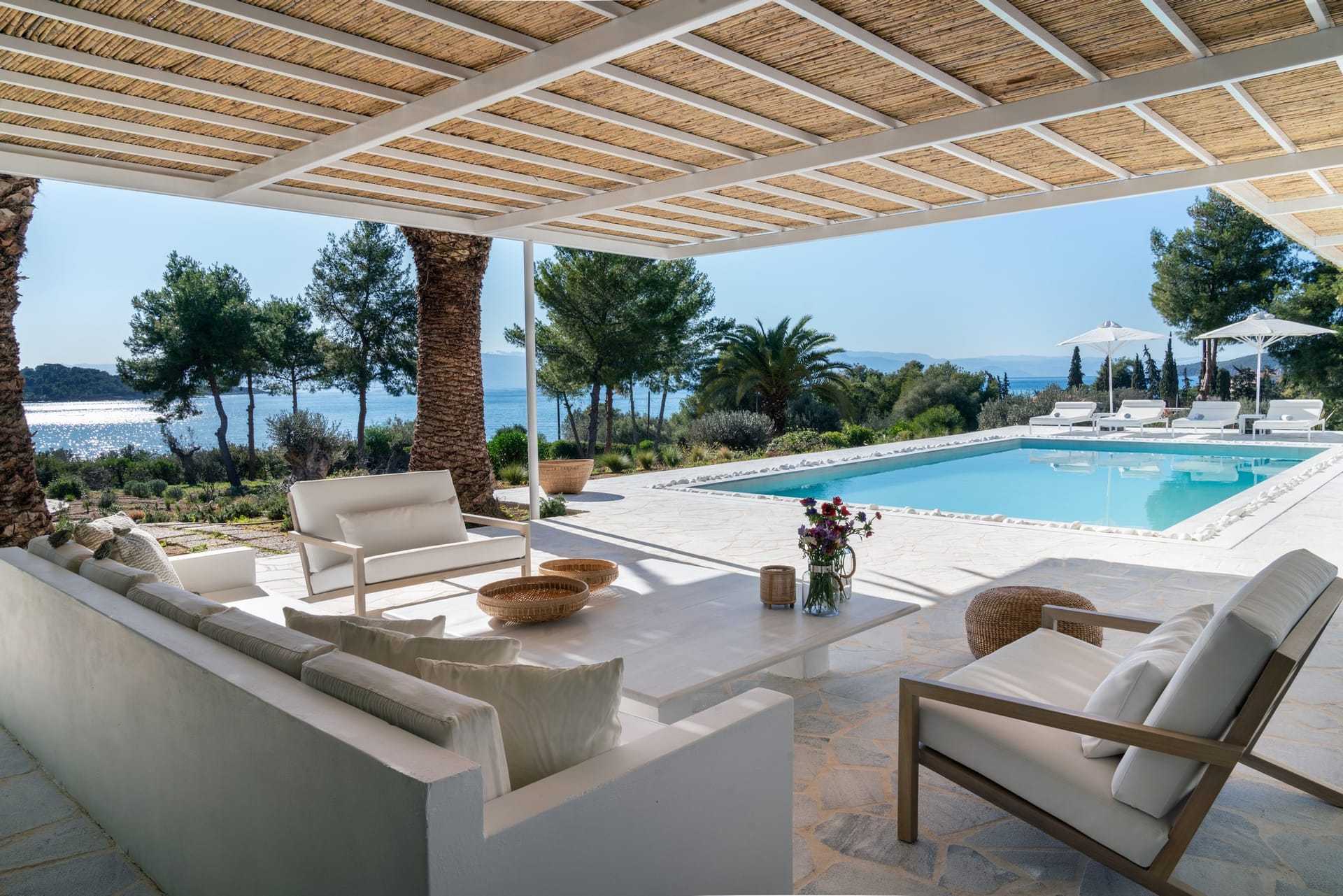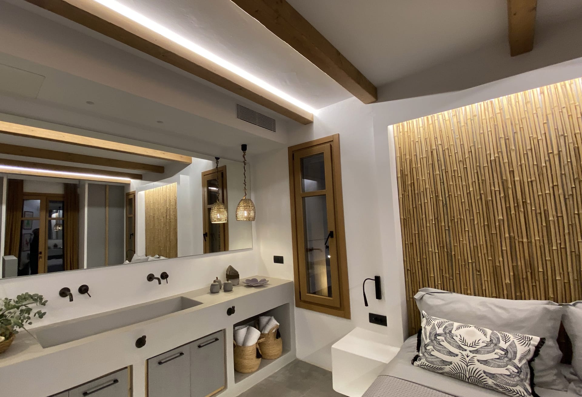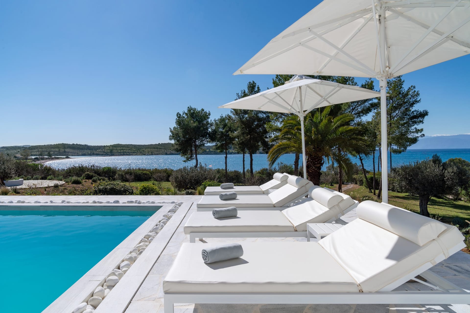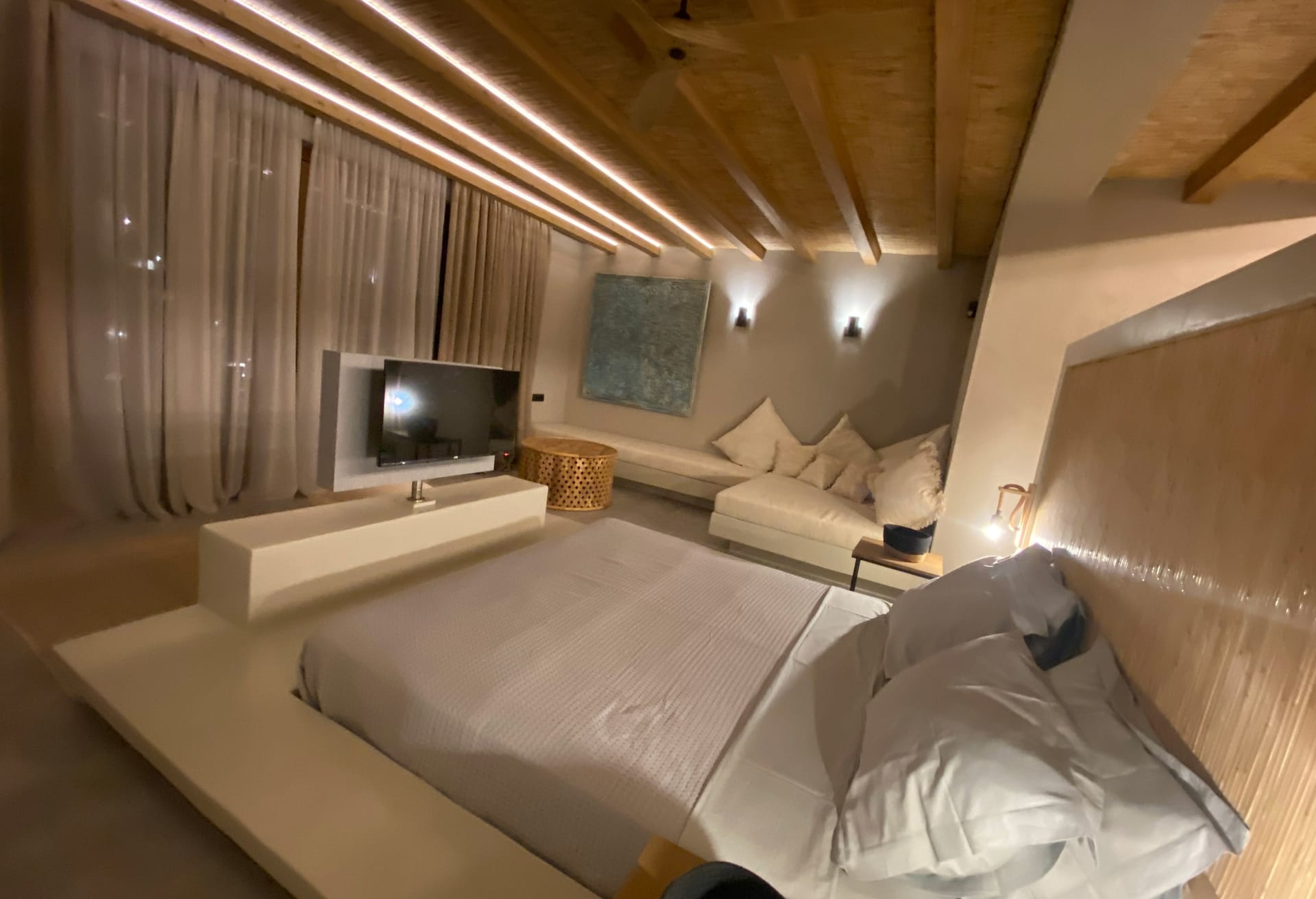 A private pool with a breathtaking view is available, and guests are also close to one of the best sandy beaches on the island (5 minutes away). In addition, there is a well-equipped in-house private gym and a yoga and meditation area on the terrace with a heated jacuzzi. The heating and cooling systems in the farmhouse can be adjusted independently, making it a pleasant retreat no matter the season.