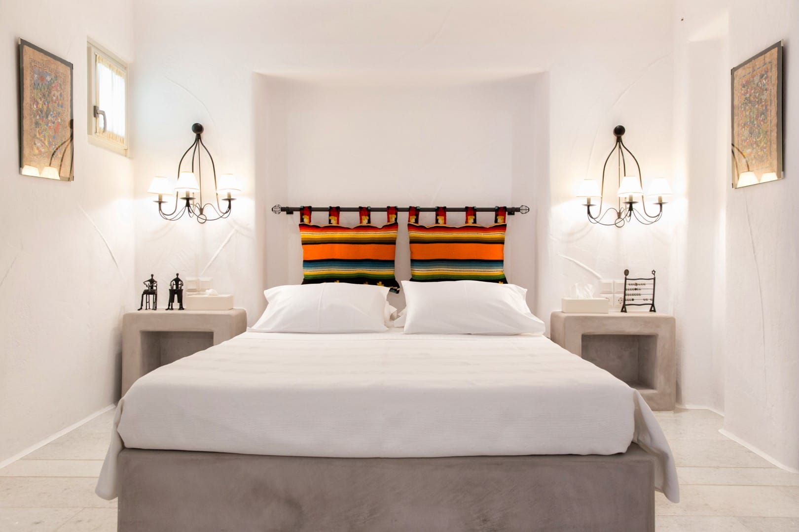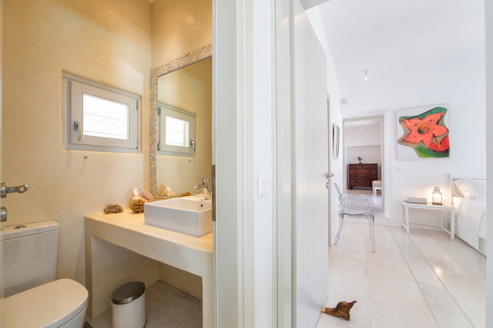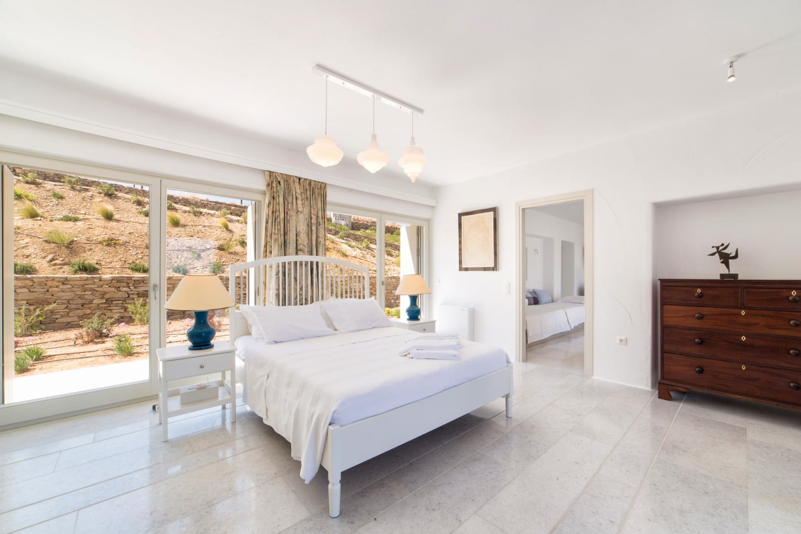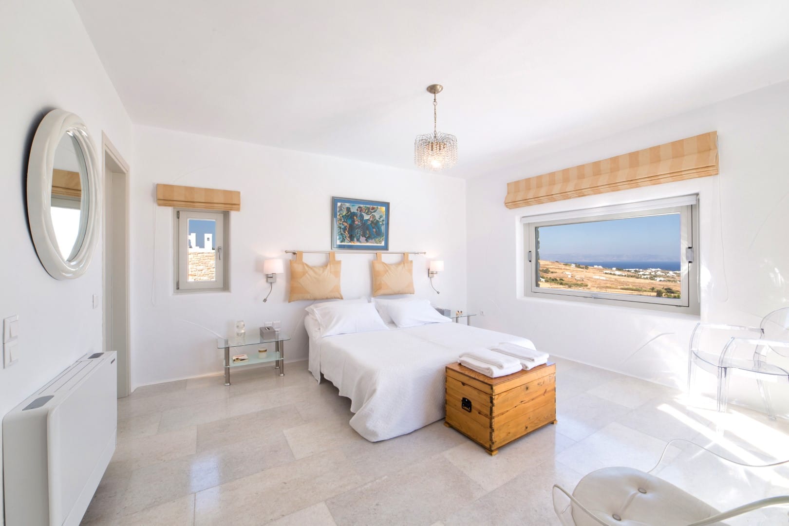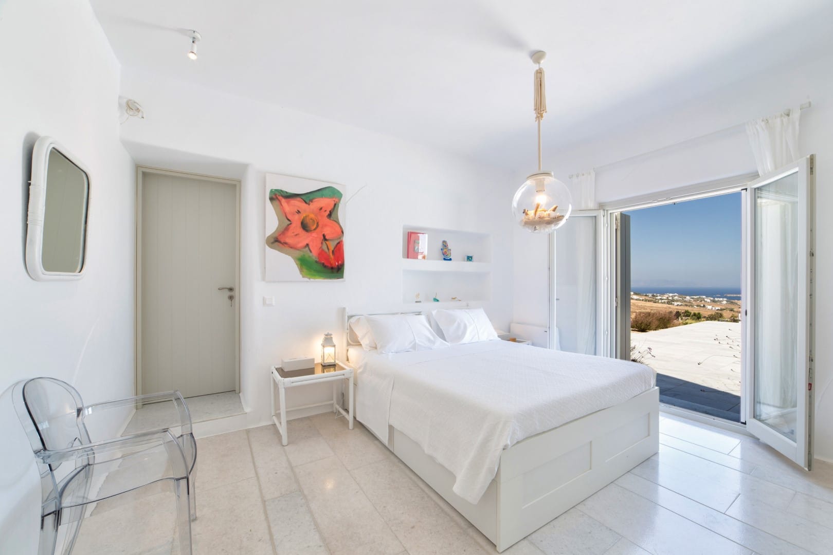 Bathed in natural light, Villa Posidon’s modern, airy interiors contrast beautifully with the timeless Cycladic landscape. Built in 2016 across three levels, the home’s whitewashed walls, curated furnishings, and artistic details reflect a harmonious aesthetic. Whether you’re lounging by the pool, enjoying a barbecue under the stars, or sipping coffee on the private balcony, Villa Posidon surrounds you with elegance and calm at every turn.