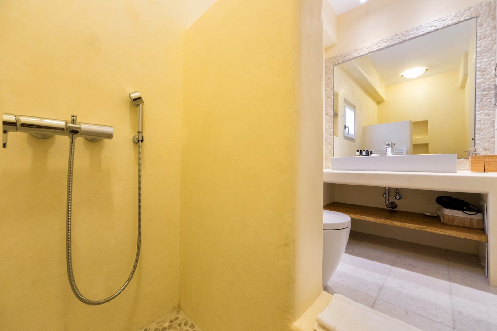 The upper floor is dedicated to the master bedroom, complete with a private balcony and panoramic views of the Aegean. Meanwhile, the lower level hosts a spacious guest suite with a double bed, its own bathroom, a cozy sofa, and direct access to the pool area, making it ideal for those seeking additional privacy.