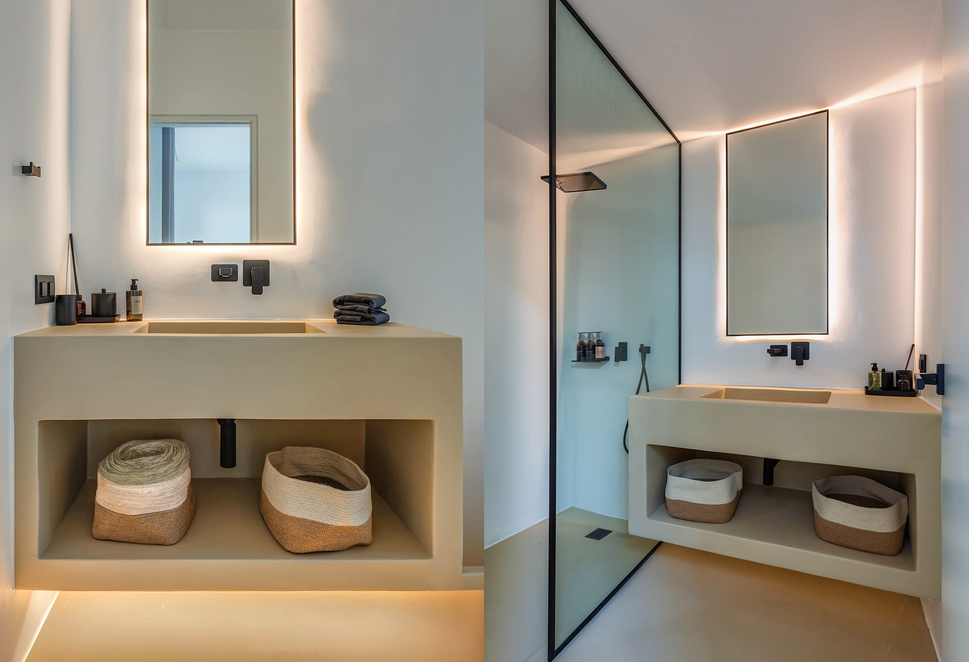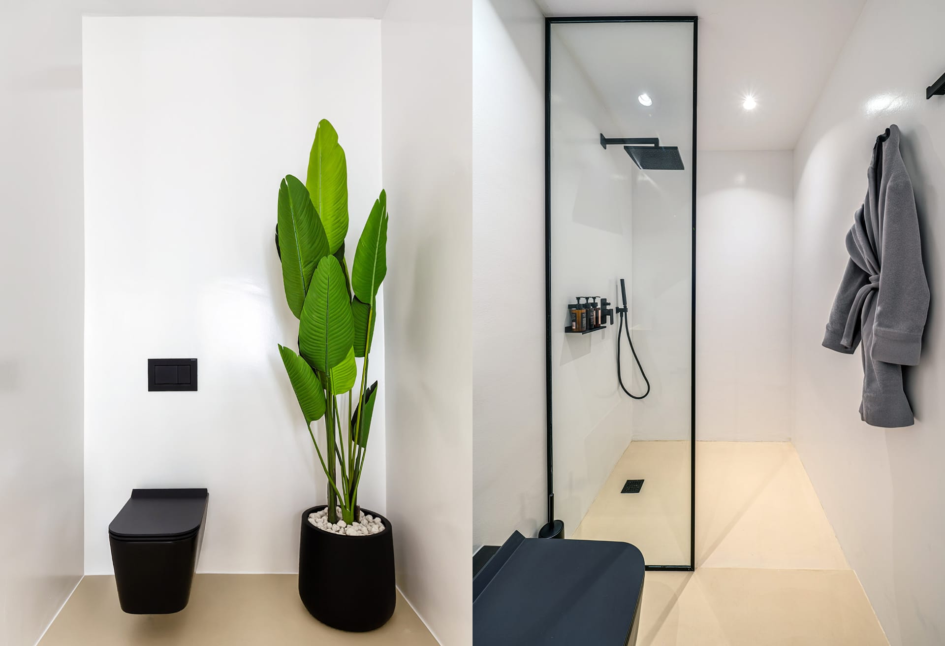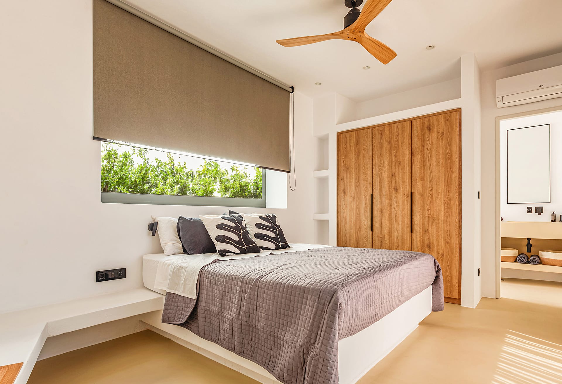The architecture embraces a bold, contemporary style that has recently gained wide acclaim, with the residence sculpted directly into the natural rock. Clean geometric lines and a minimalist aesthetic define the structure, blending harmoniously with the landscape. Outdoors, the striking infinity pool immediately draws attention, featuring a sloping, irregular edge designed to evoke the feel of a natural lagoon. Adjacent to the pool, a refined outdoor dining area can be shaded as needed by an electrically operated awning, creating the perfect setting for relaxed alfresco meals.