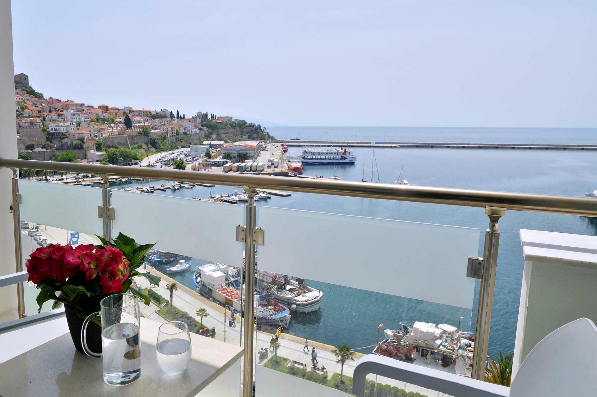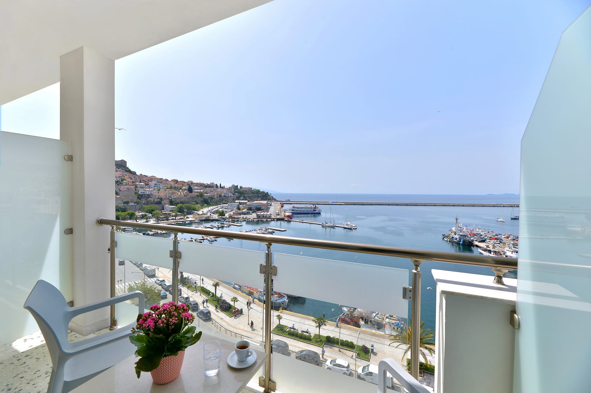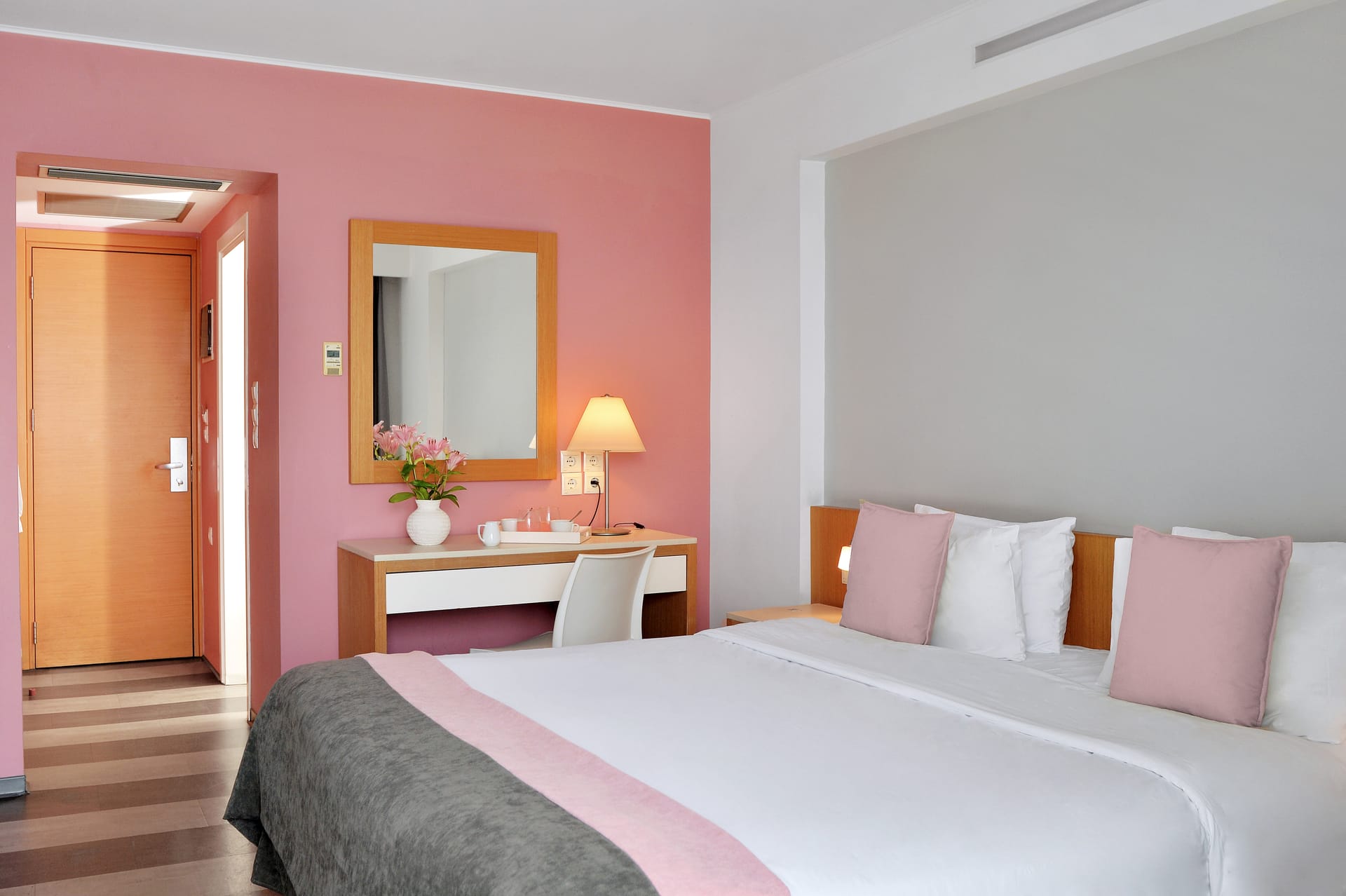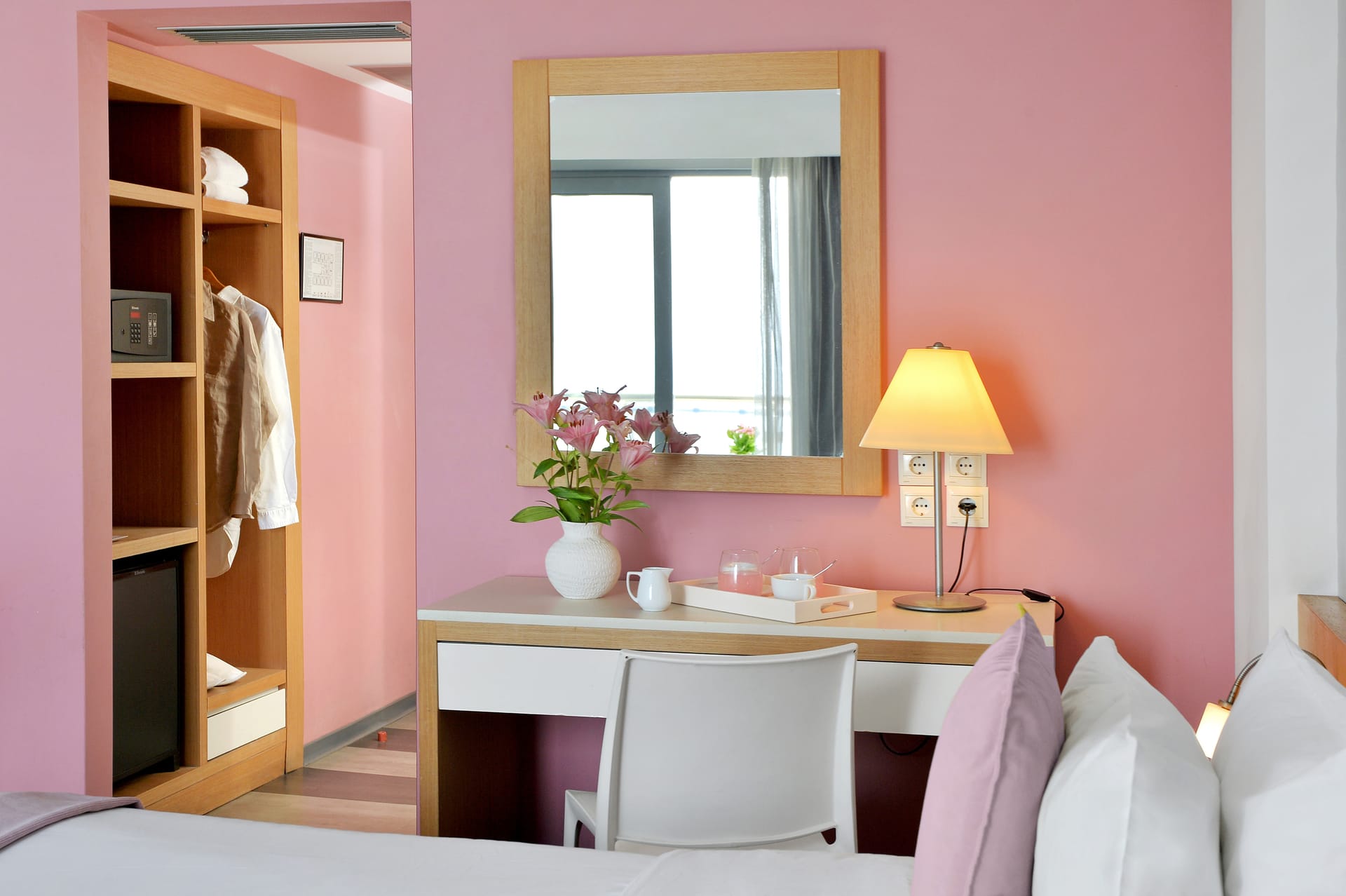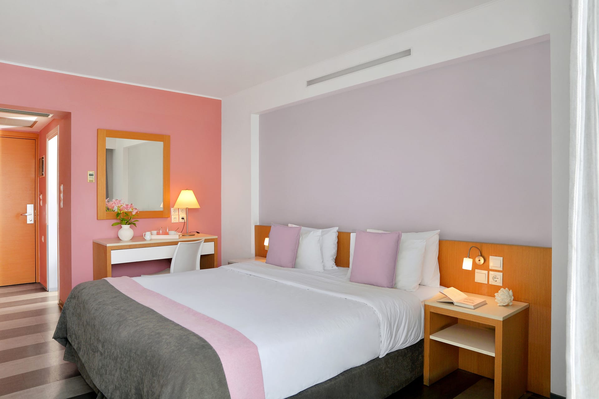 Double room with sea view of 21,50 s.m., features: Free wireless Internet, Magnetic security lock, Air condition Electronic safe deposit, Flat LCD TV, Tea & coffeee facilities, Mini fridge, Free mineral water, Trouser press / Ironing board, Hair dryer, Wake up call service, Laundry service, Room service.