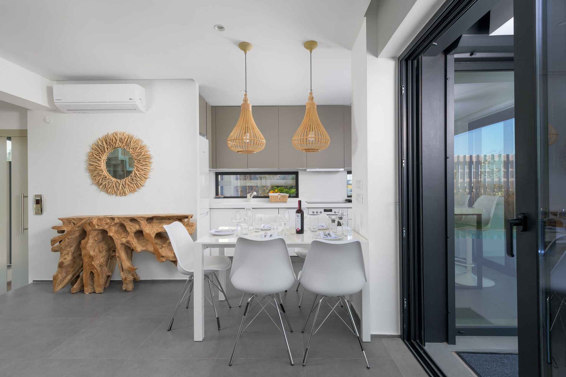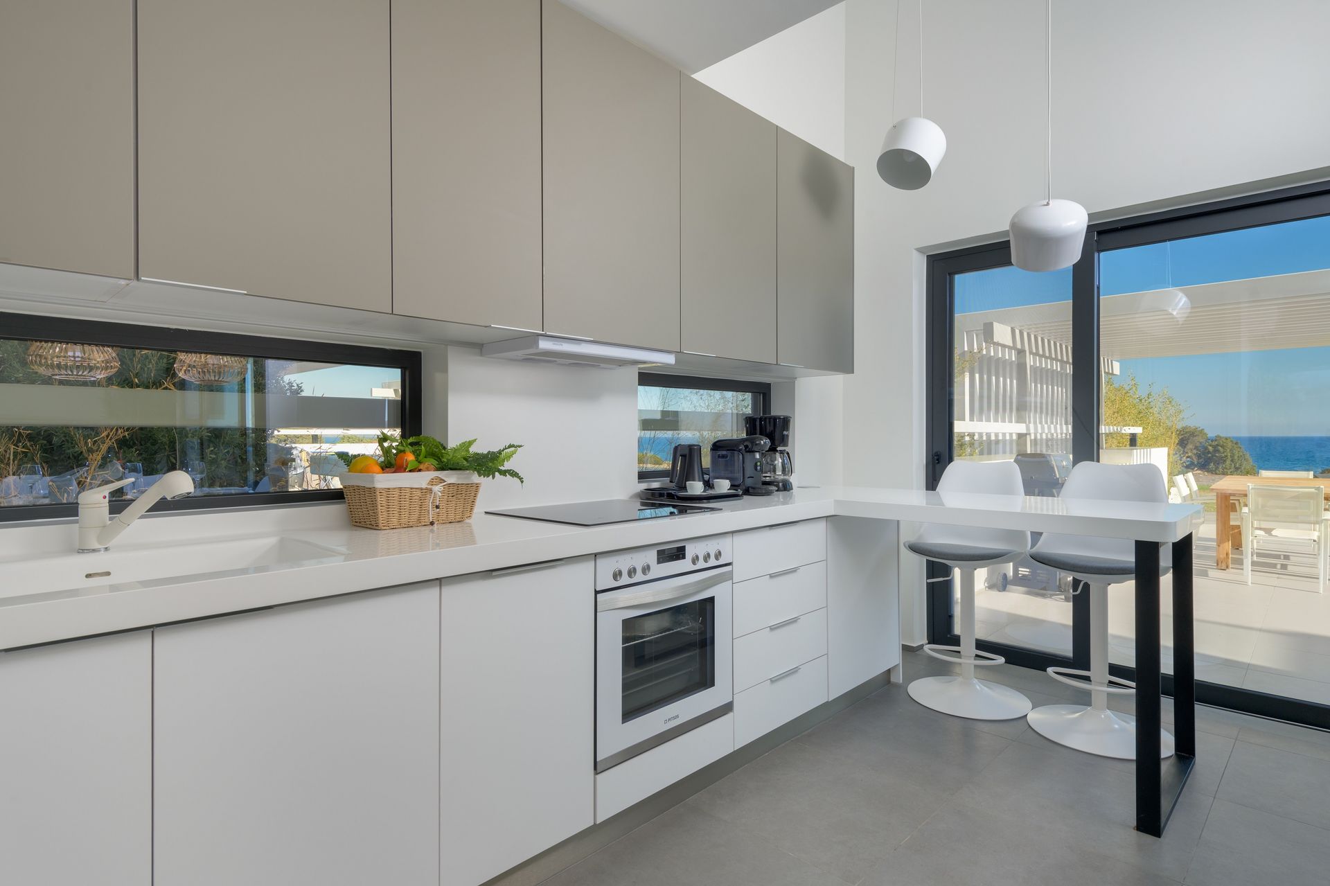 The villa includes a fully equipped kitchen, ideal for preparing delicious meals and exploring local Greek ingredients. The dining area showcases a divine design, complemented by a beautifully decorated and comfortable living room. Here, guests can enjoy a screen TV with satellite channels and admire the stunning view of the swimming pool and the breathtaking sea through the large windows. Free Wi-Fi is available throughout the property.