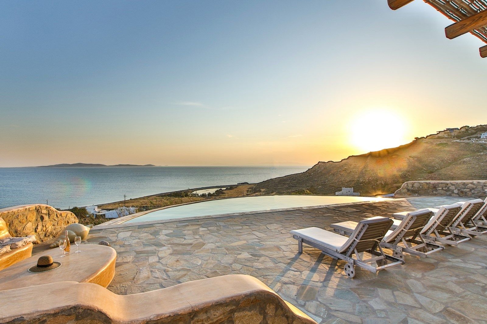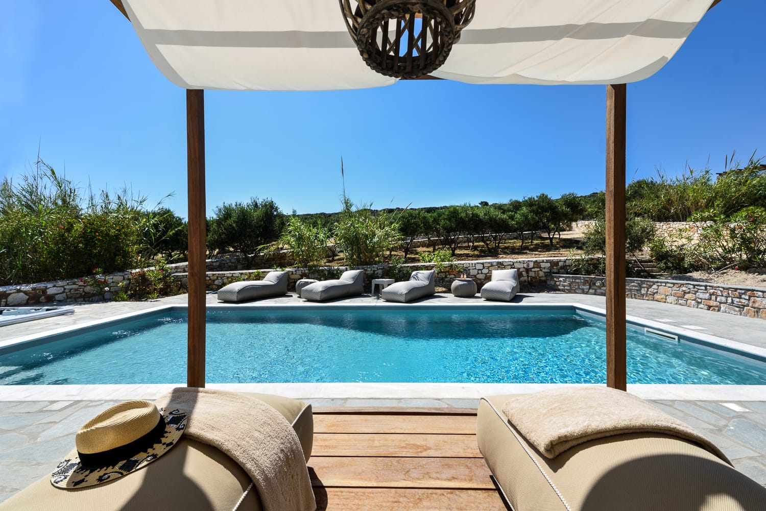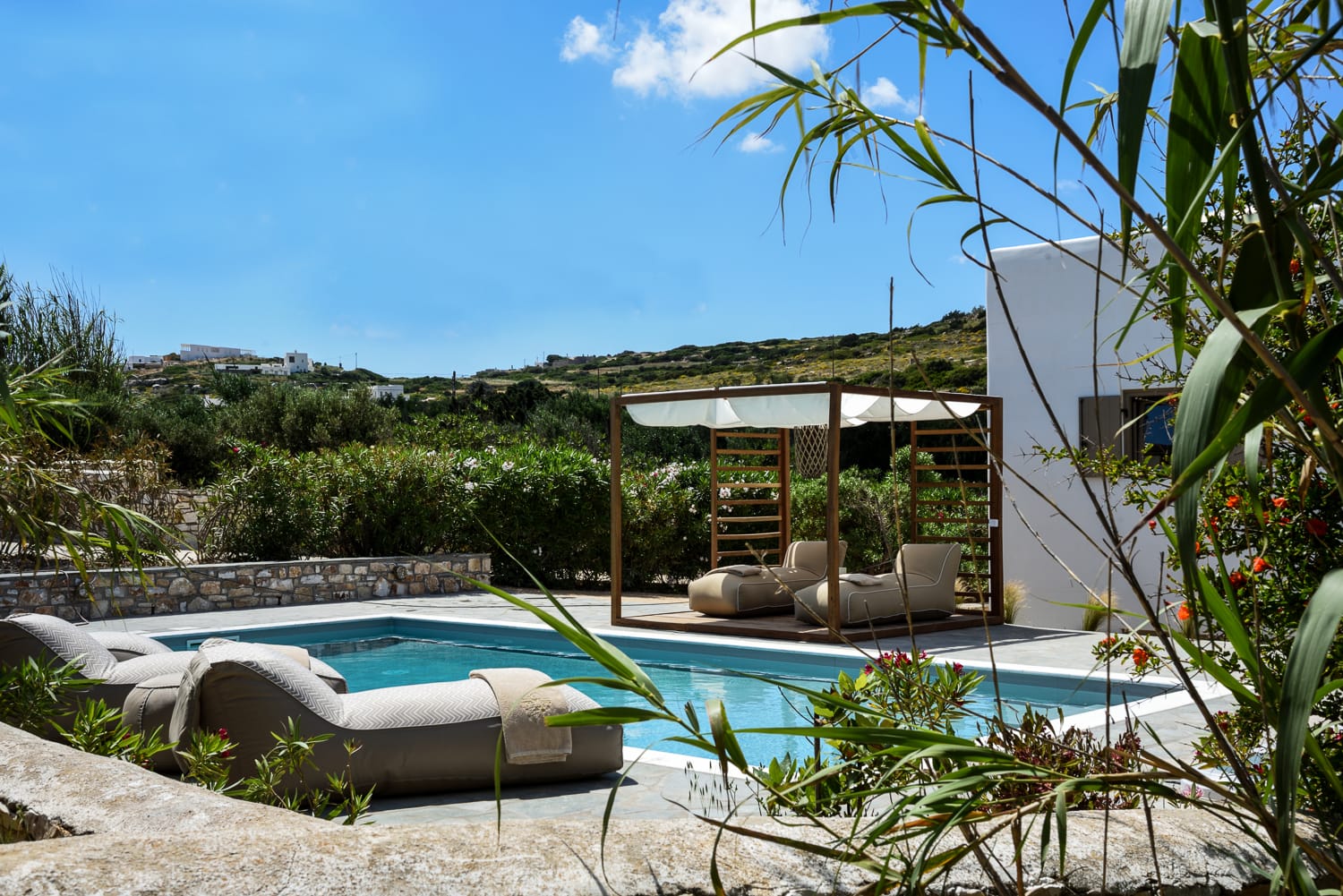 The outdoor spaces are thoughtfully arranged for relaxation and entertainment, offering two private non-heated swimming pools, shaded lounges, sunbeds, and dining areas where guests can enjoy the stunning views of the Aegean Sea and the Akrotiri peninsula. Additionally, the suite and both villas include private heated plunge pools—one outdoors and two indoors—enhancing the luxurious experience.
