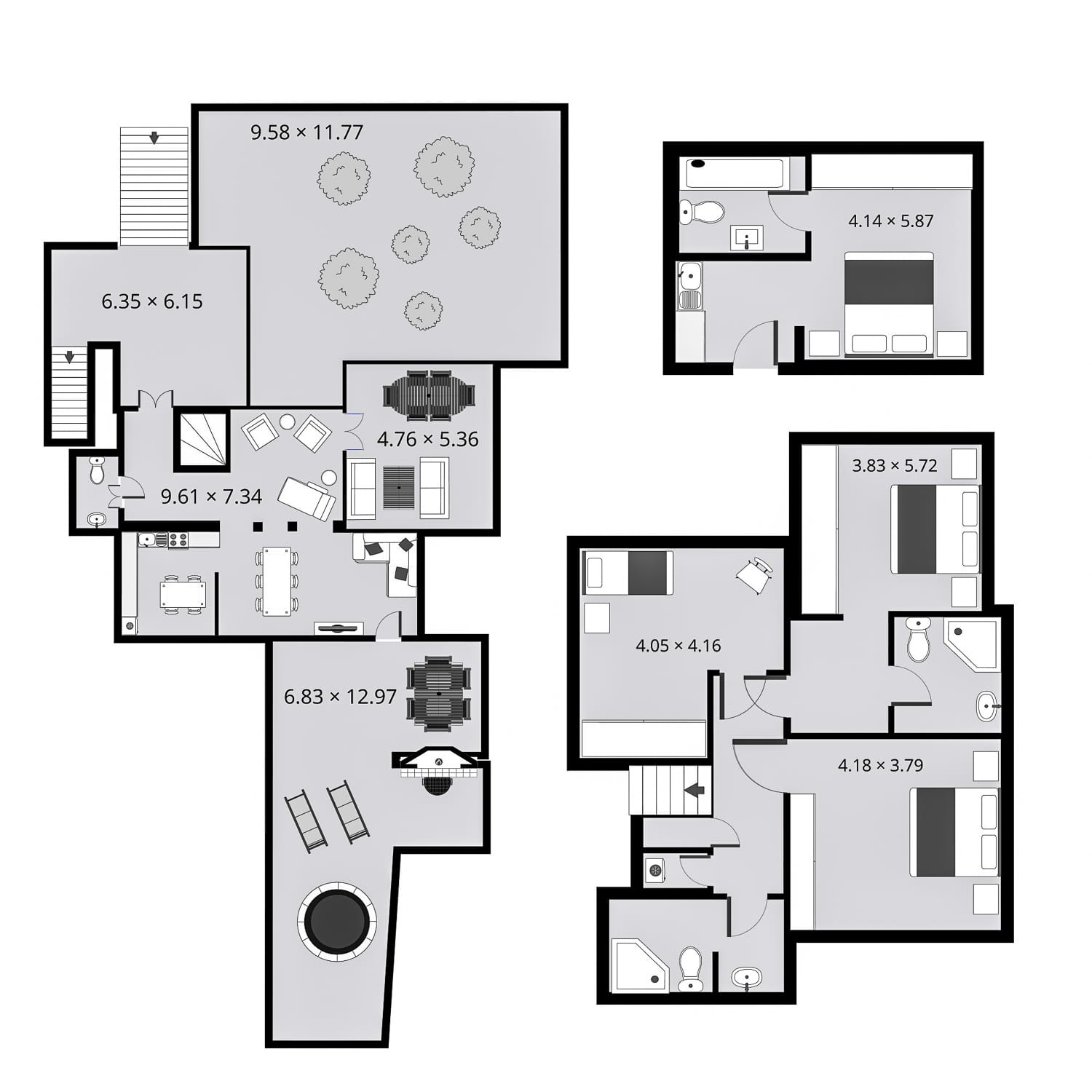 Spanning across three distinct yet interconnected accommodations, the villa comfortably hosts 16 guests. It features multiple inviting indoor and outdoor living areas, fully equipped kitchens, and elegantly designed bedrooms spread across different levels, ensuring both shared and private spaces for all guests.