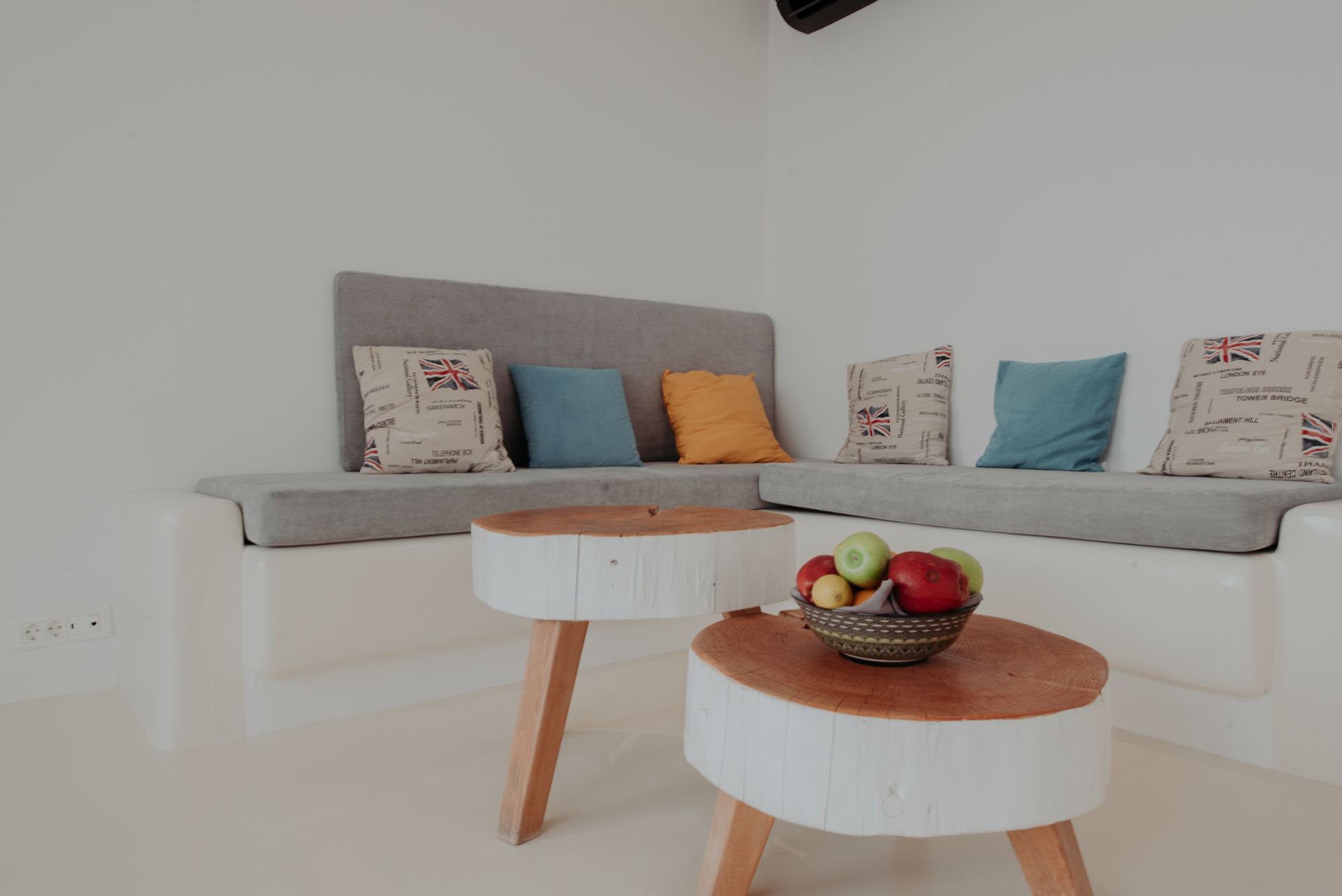 Kymata (the waves in Greek) is a 45-square-metre, ground floor 1-bedroom suite situated directly across the path from Akti. A simple and well-planned space, Kymata is fully accessible for guests with special accessibility requirements or wheelchairs and has the addition of a sloping path suitable for wheelchairs to reach the pool terrace. The separate bedroom contains a queen-sized bed while the sofa in the sitting area can be converted to 2 joined single beds to accommodate 2 other people. There is a well-equipped kitchen area and sliding doors open to a private shady veranda for outside dining and relaxing. Please note: the pool does not have a sloped entrance or at this point an accessible lift for wheelchair users.