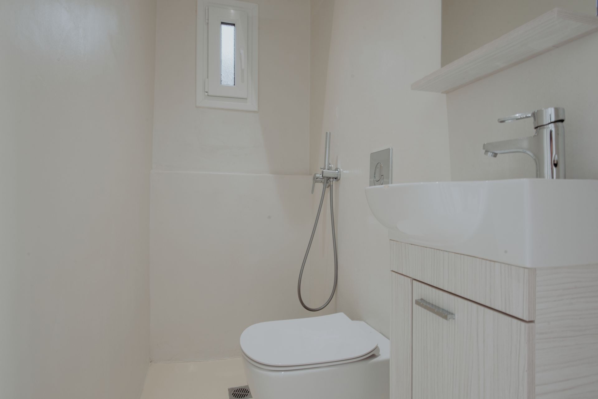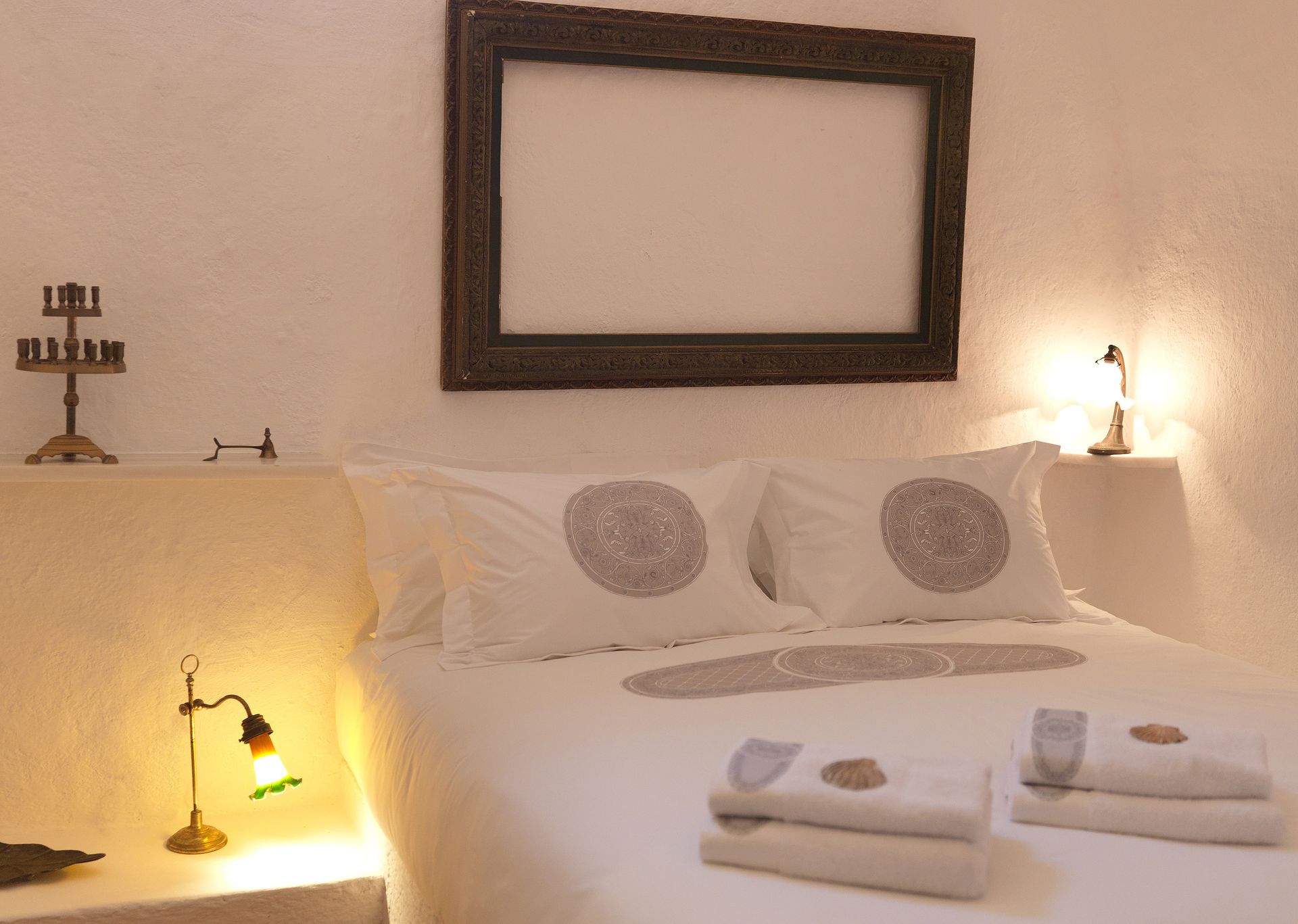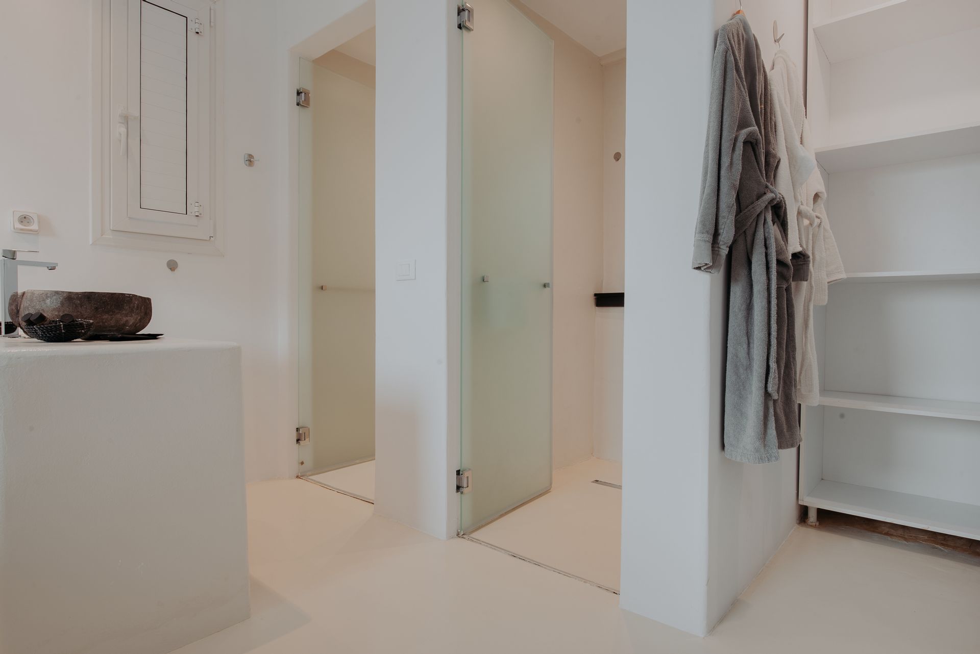 Pelagos (the Sea) is a 35-square metre suite on the ground floor of the building to the rear of the property. You enter to the kitchen and sitting area which has sliding doors opening to an outdoor terrace for dining and relaxing. The bedroom, containing 2 single beds which can be separated or placed close together, has sliding doors to a further outdoor area. The shower room is tucked to the side of the bedroom, with the WC a separate room behind a door.