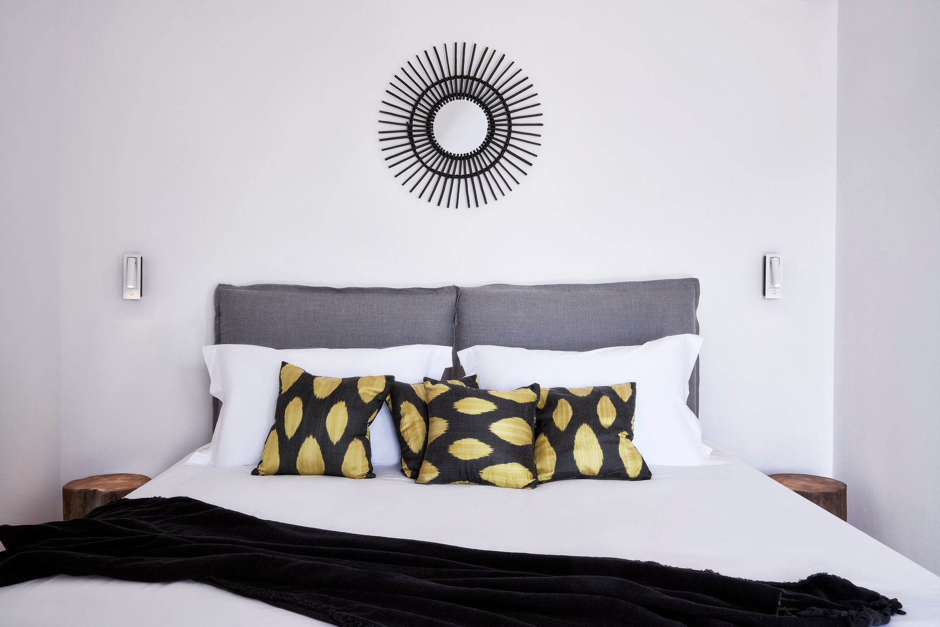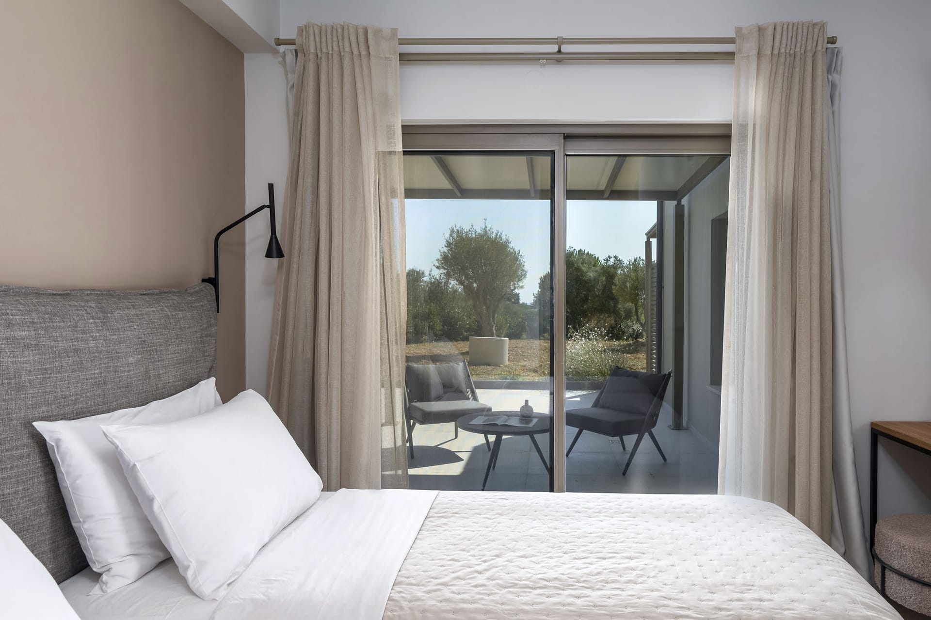 Faros(the Lighthouse) is a 51-square metre, ground floor suite situated at the rear of the property level to the terrace and swimming pool. This generous space comprises an open-plan living and modern kitchen area with a breakfast bar. Just off this area is a light-filled separate queen-size bedroom with sliding doors to an outside terrace. There is a modern and well-equipped bathroom with walk in shower. The sitting area comprises a sofa that can be converted to one single bed. Outside the property is a private terrace area with comfortable sofas for relaxing, and a dining area.