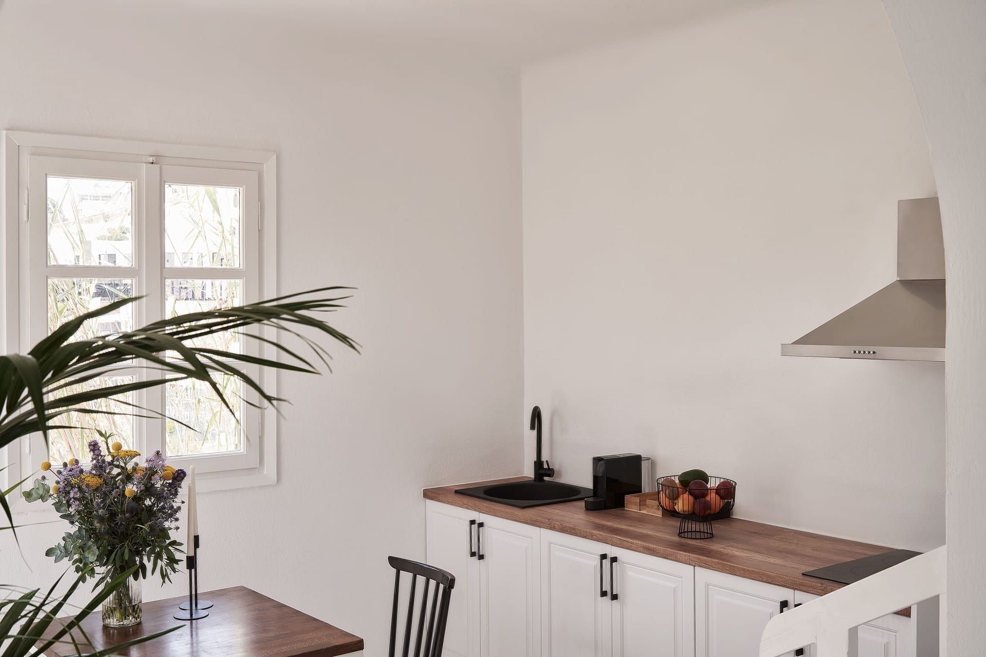 Anemos(the Wind) is a 35-square metre studio suite situated on the first floor of the building to the rear of the property. It comprises an open-plan living space with a kitchen area separated from the sleeping space by a breakfast bar. A sofa in the sitting area can be converted to a single bed for an additional guest. Sliding doors open to a balcony terrace, offering a dining area and sofa where you can enjoy the views across the olive trees towards the sea beyond.