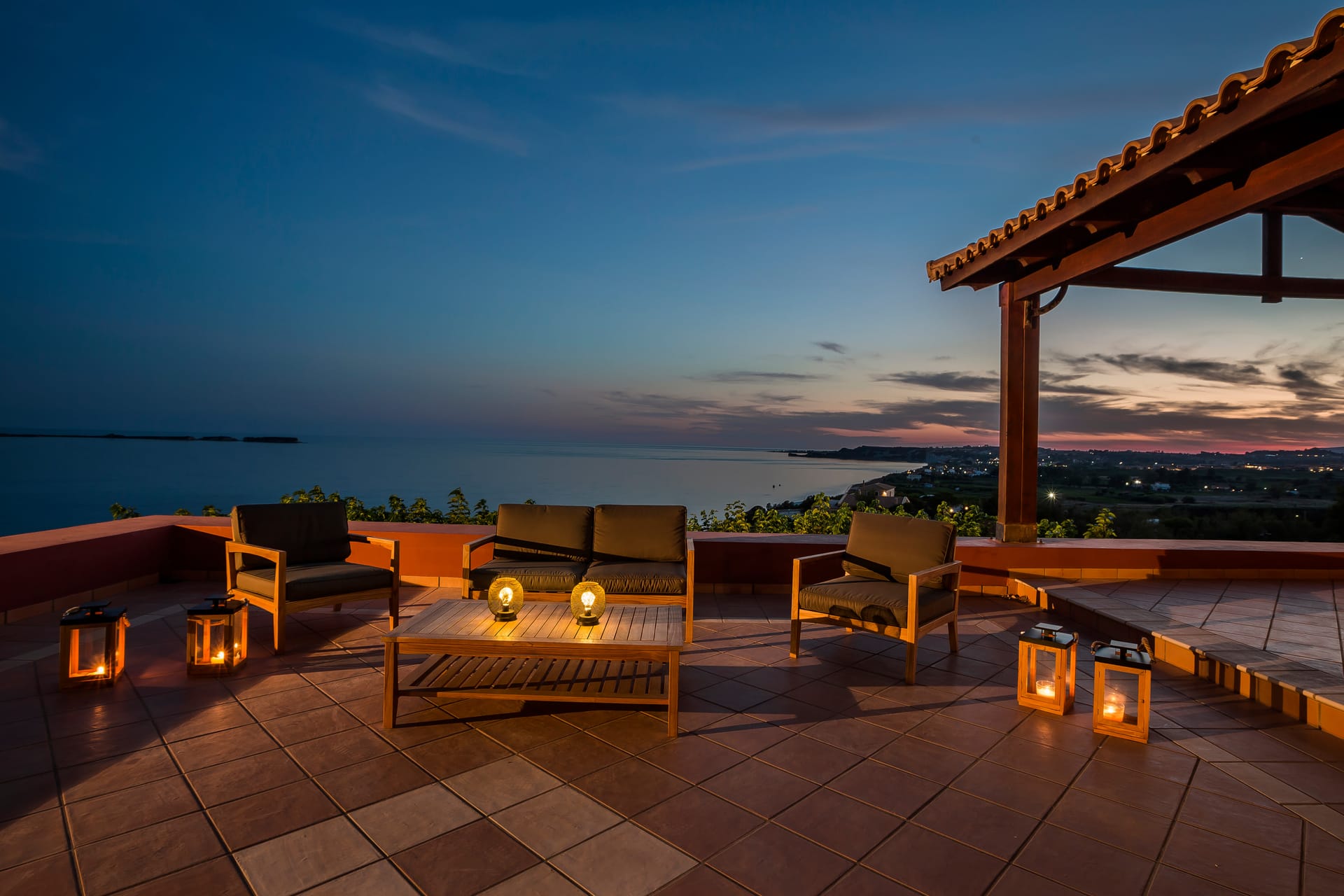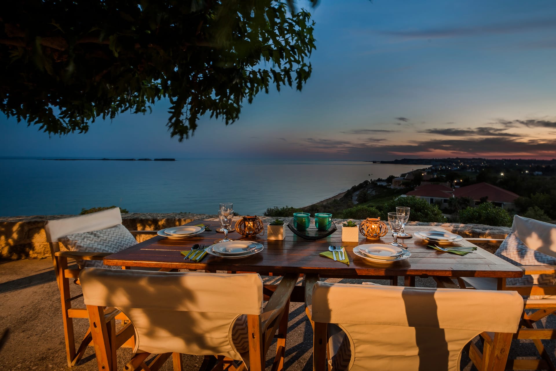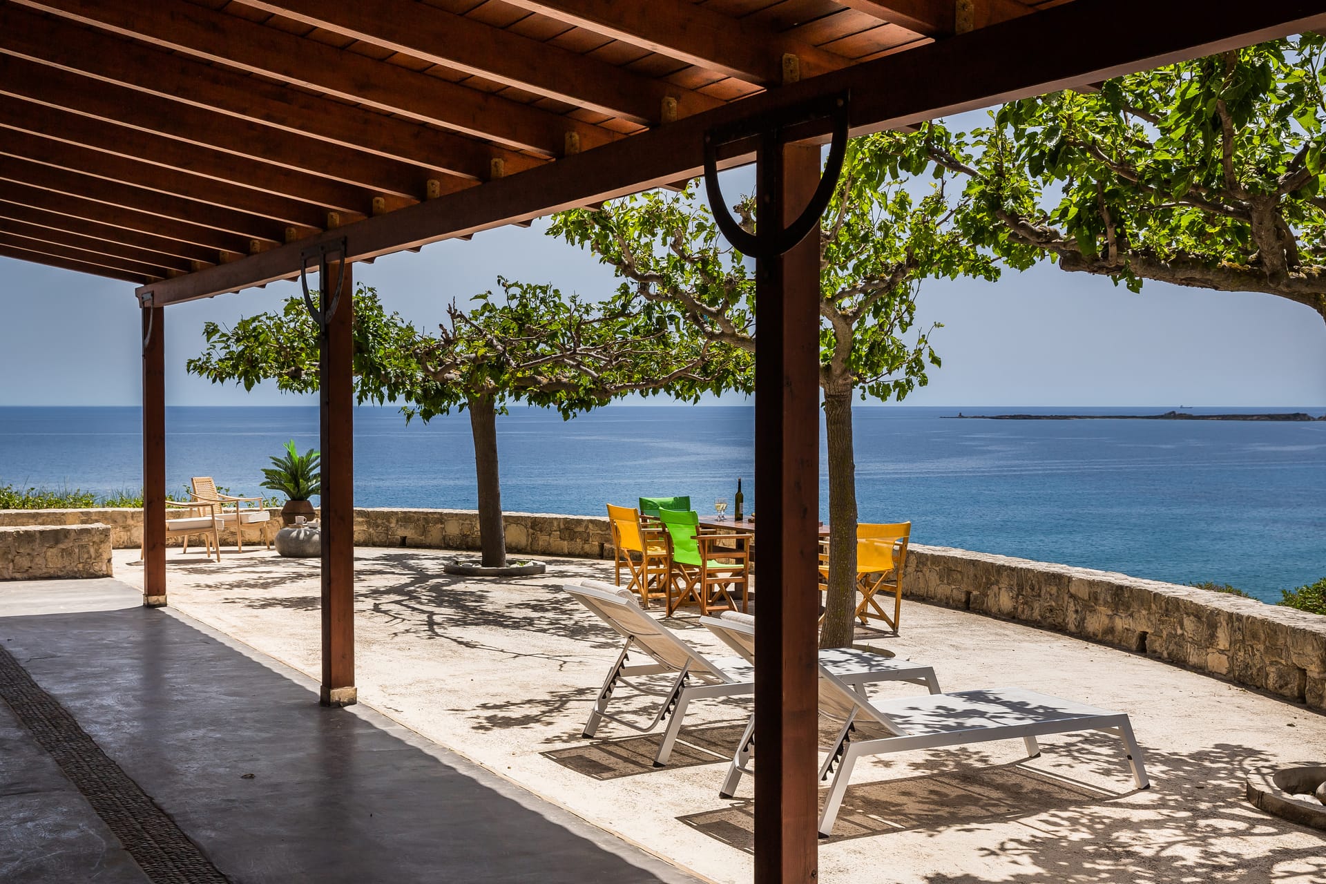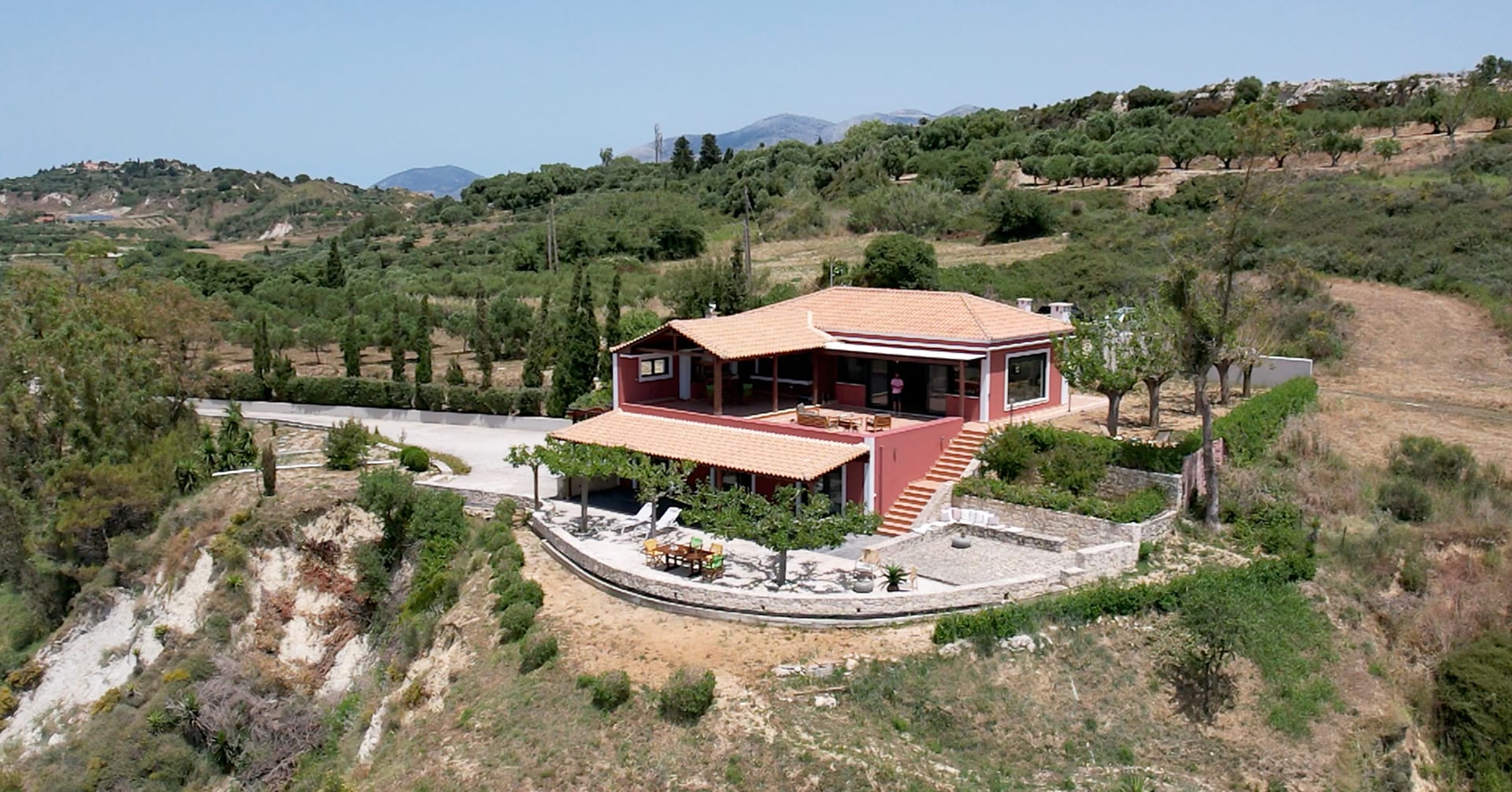 A wrap-around terrace on two levels encircles this outstanding villa situated on a prominent headland at the south of the peninsula. The terraces incorporate trees for natural shade, comfortably-furnished seating areas and vast sun-traps for tranquil tanning. There are stunning panoramic views in all directions, over the valley below, across the sea to Vardiani island, and to Zakynthos beyond. A secluded sandy beach can be reached by a short stroll meandering through a gentle cliffside path.
