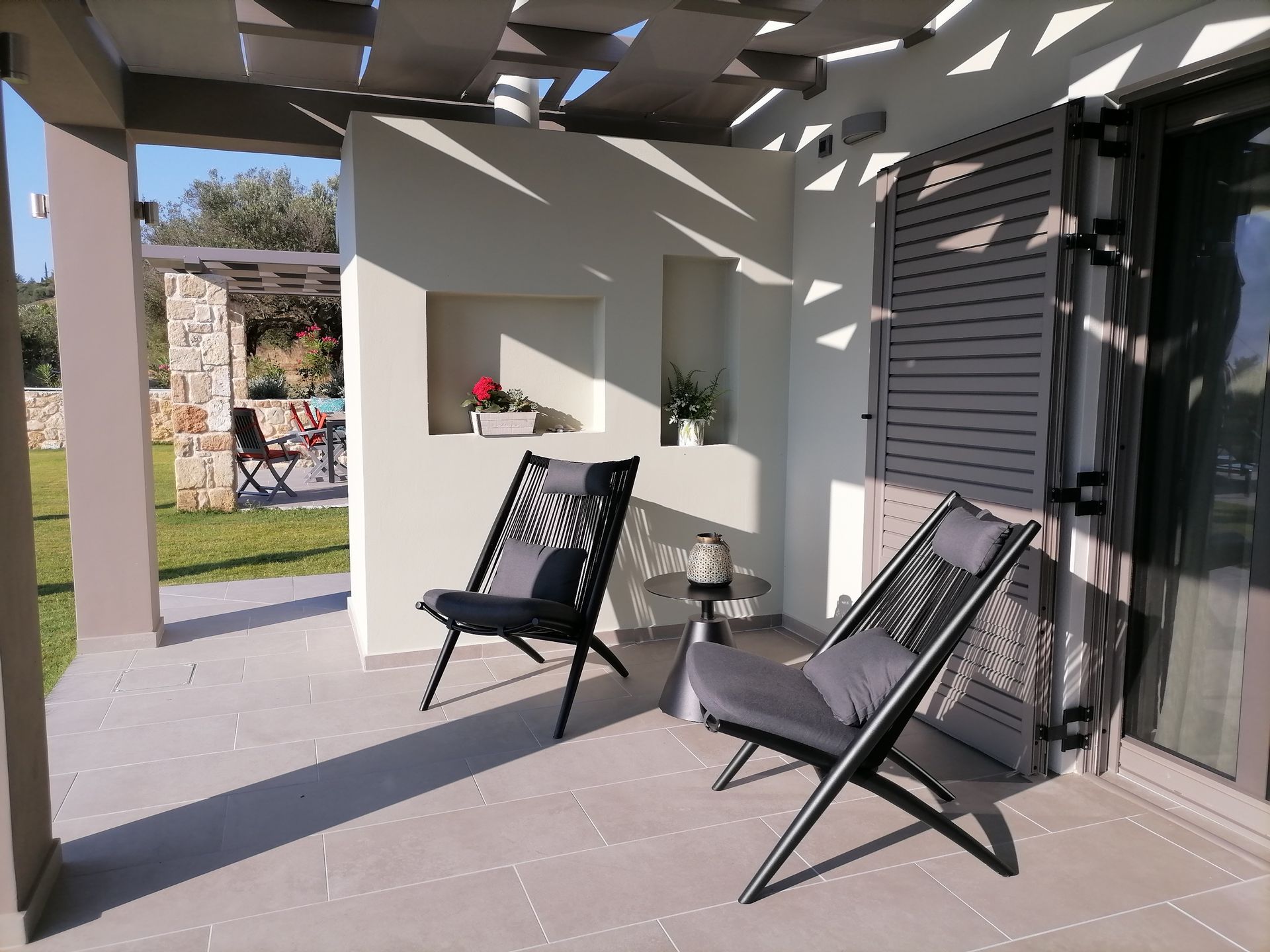 A large, flat grassy lawn surrounds the house and leads to the olive groves beyond. To the side, the house has an outside food prep area, and a covered outside dining area, with table, chairs and built-in sofas seating up to 10, where you can while away the hours after a delicious home-cooked meal.
