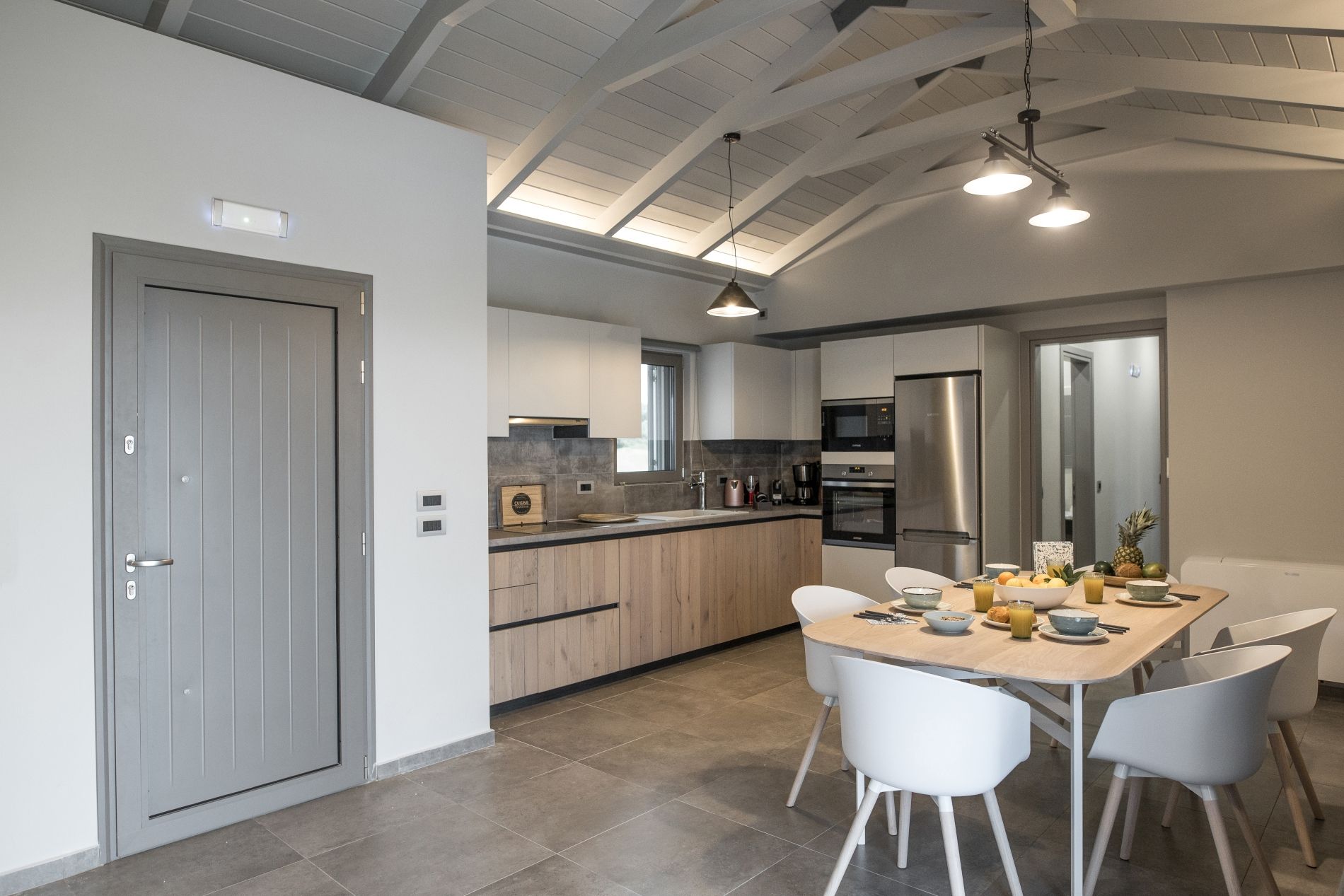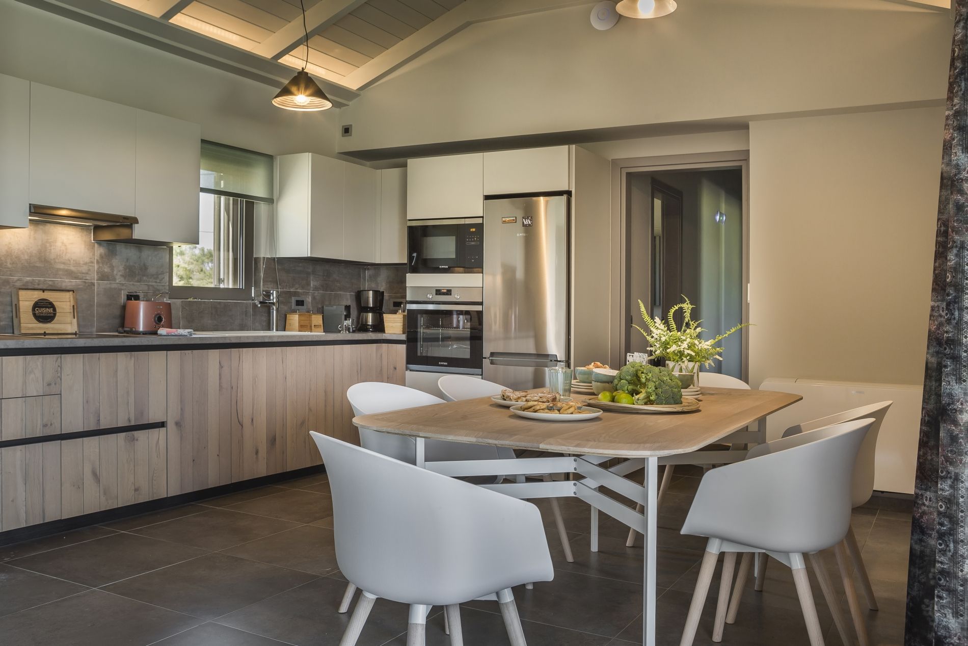 Through the front door, you enter directly into the single-storey living area; a light-filled, airy space with comfy sofas under a high-beamed ceiling. The open-plan living area includes a contemporary fitted kitchen and a spacious dining table for 6. This entire villa is situation on one floor, with spacious doorways; ideal for those with limited mobility.