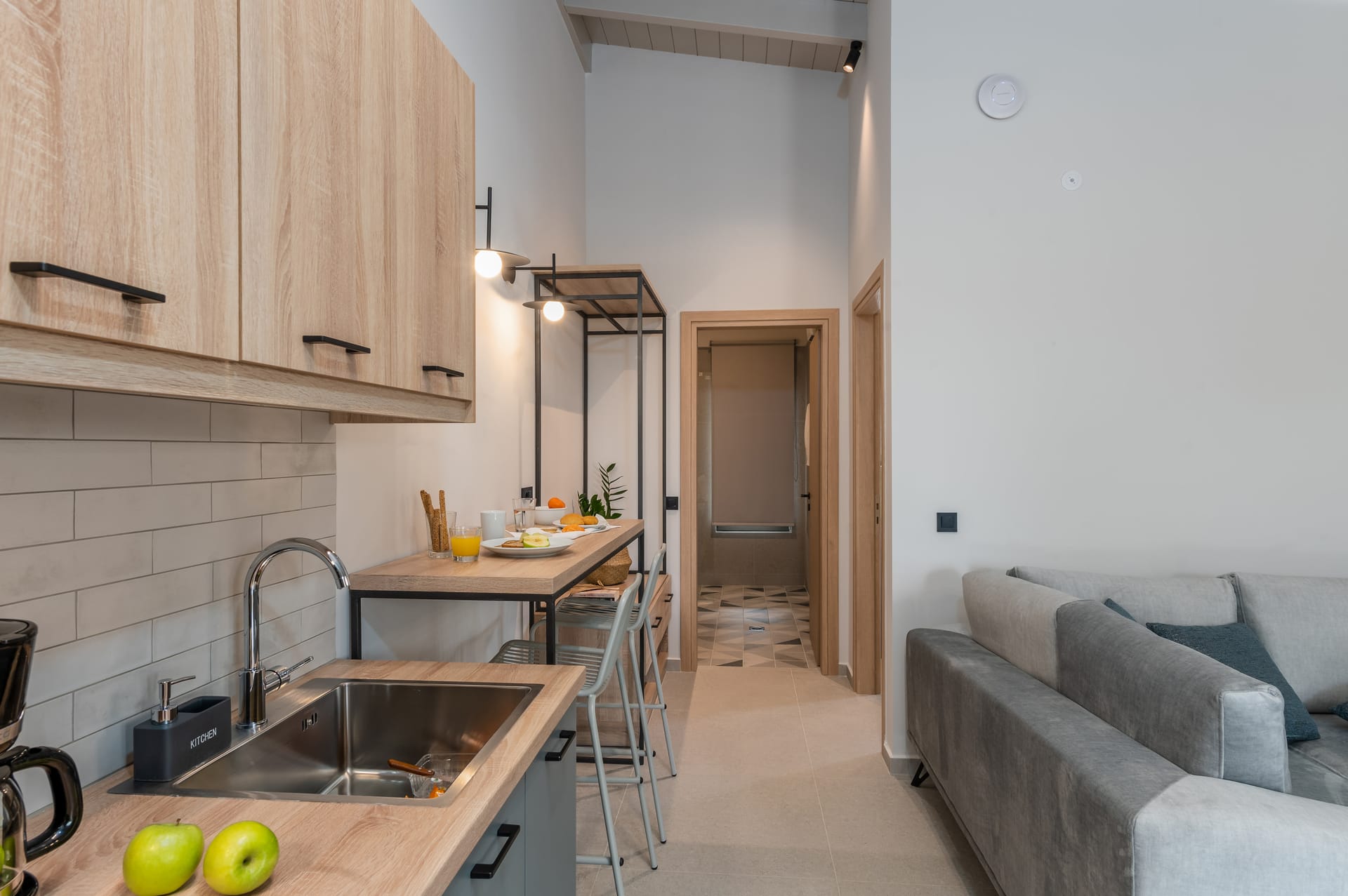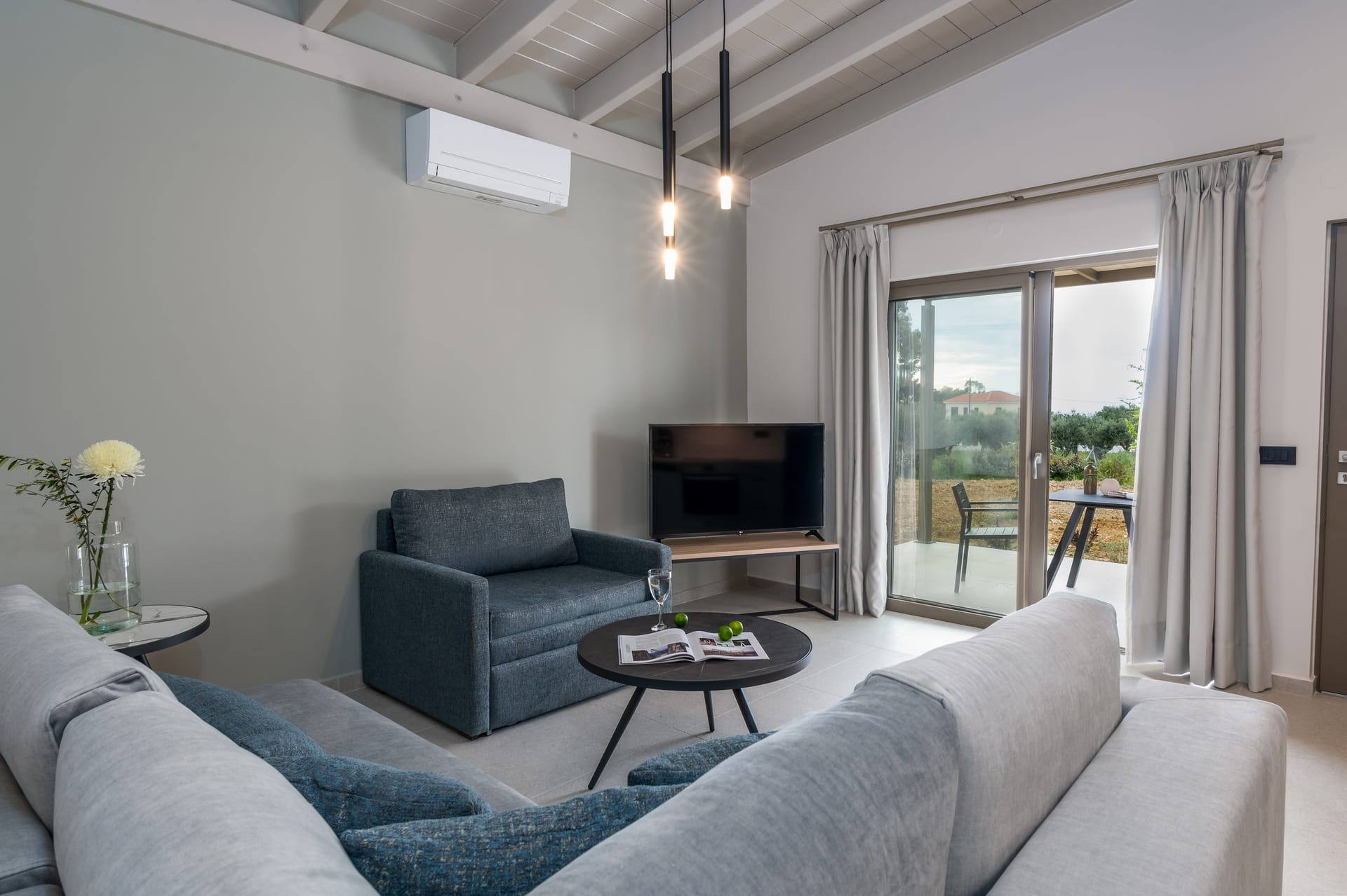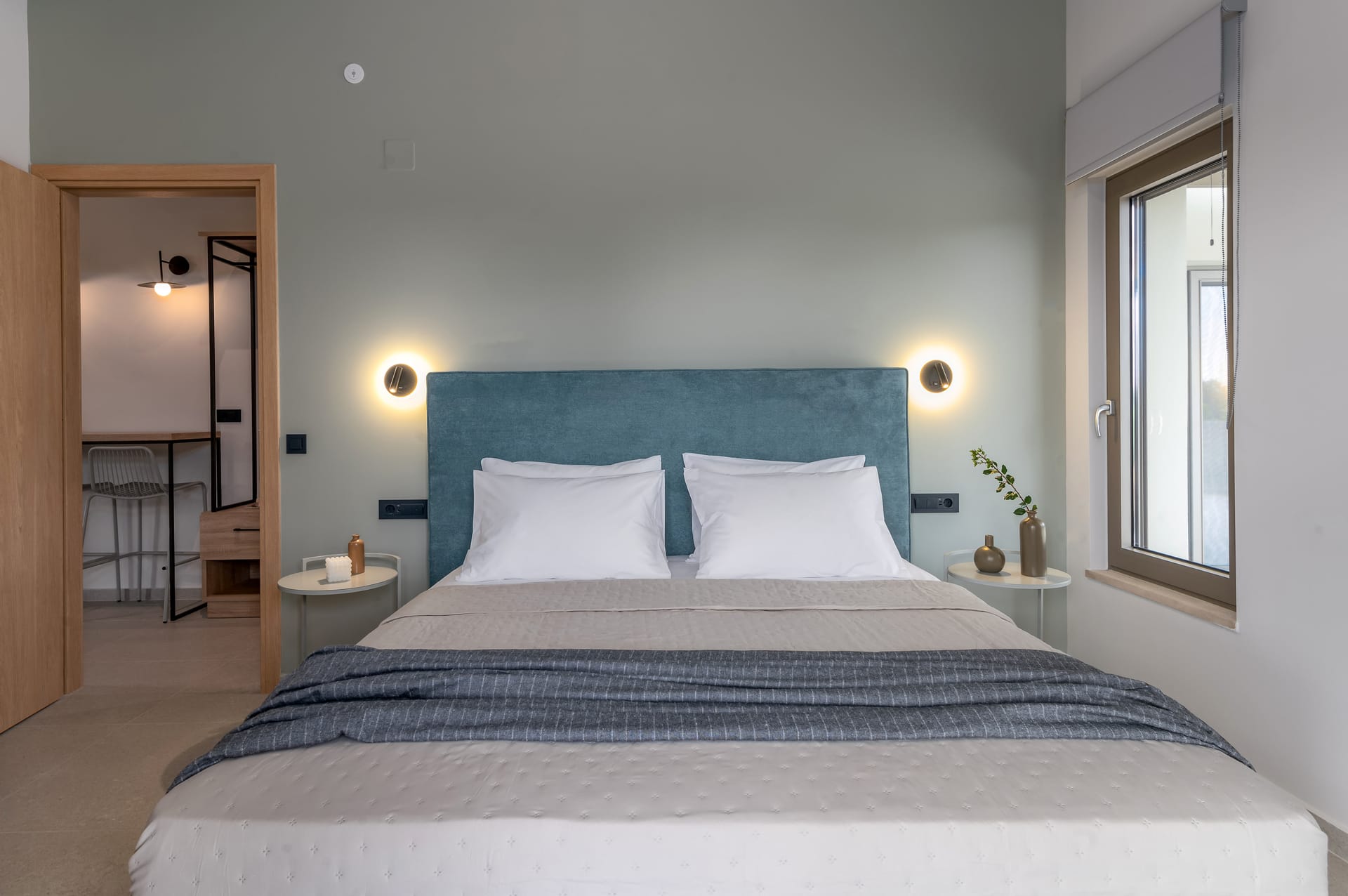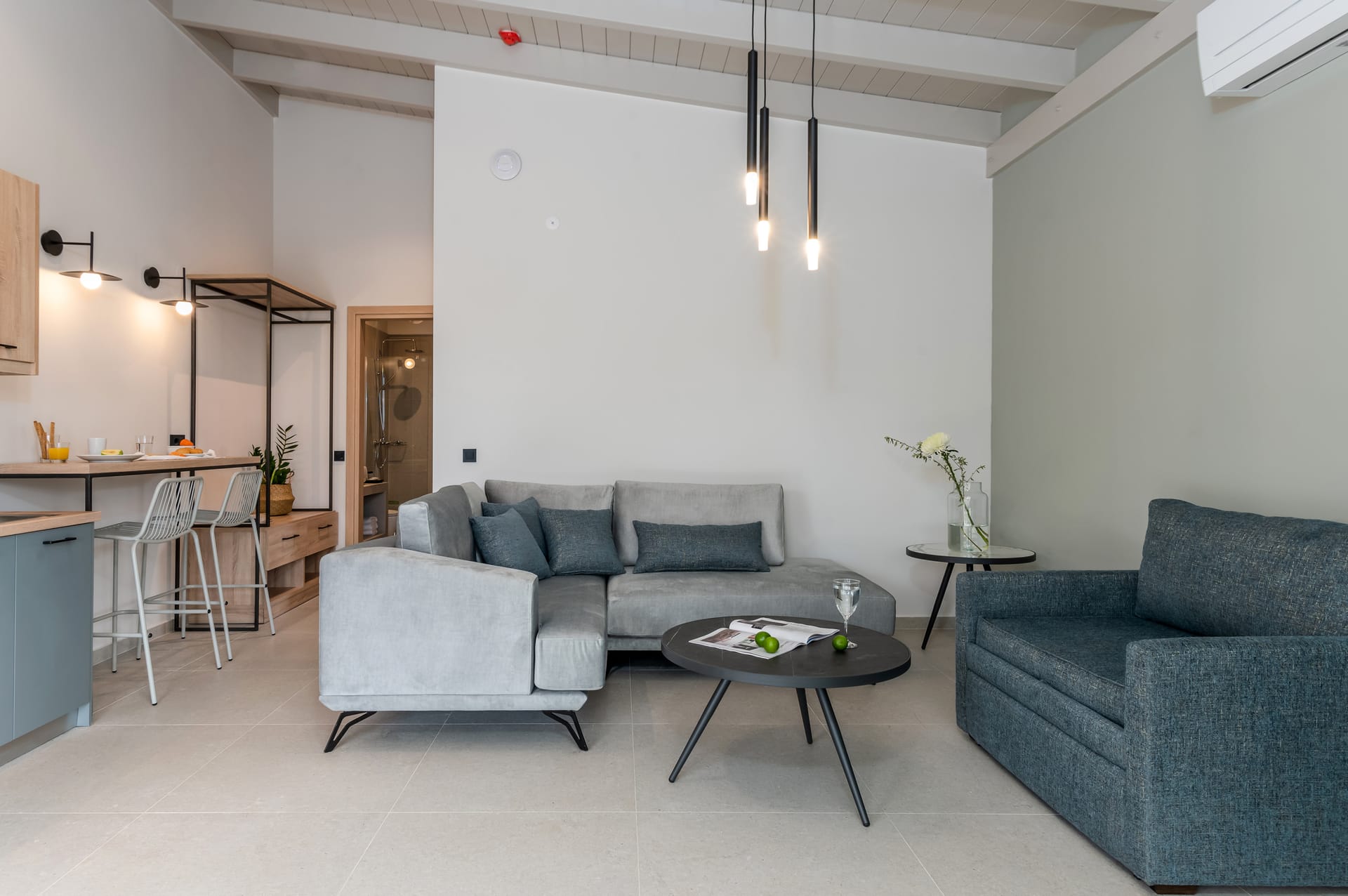 Faros (the Lighthouse) is a 51-square metre, ground floor suite situated at the rear of the property level to the terrace and swimming pool. This generous space comprises an open-plan living and modern kitchen area with a breakfast bar. Just off this area is a light-filled separate queen-size bedroom with sliding doors to an outside terrace. There is a modern and well-equipped bathroom with walk in shower. The sitting area comprises a sofa that can be converted to one single bed. Outside the property is a private terrace area with comfortable sofas for relaxing, and a dining area.