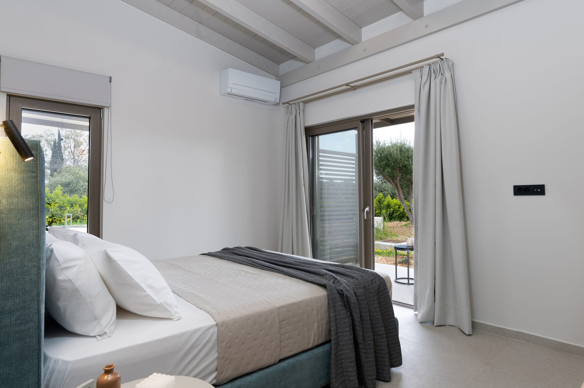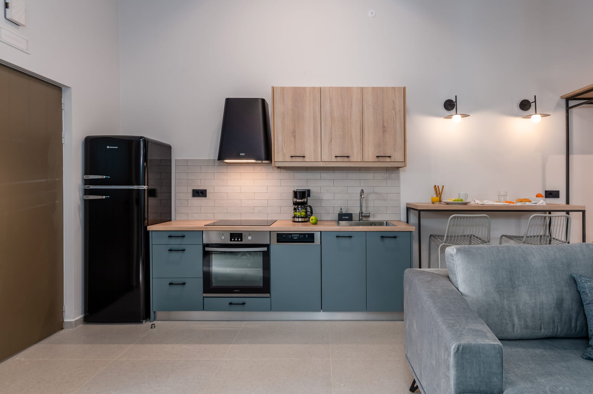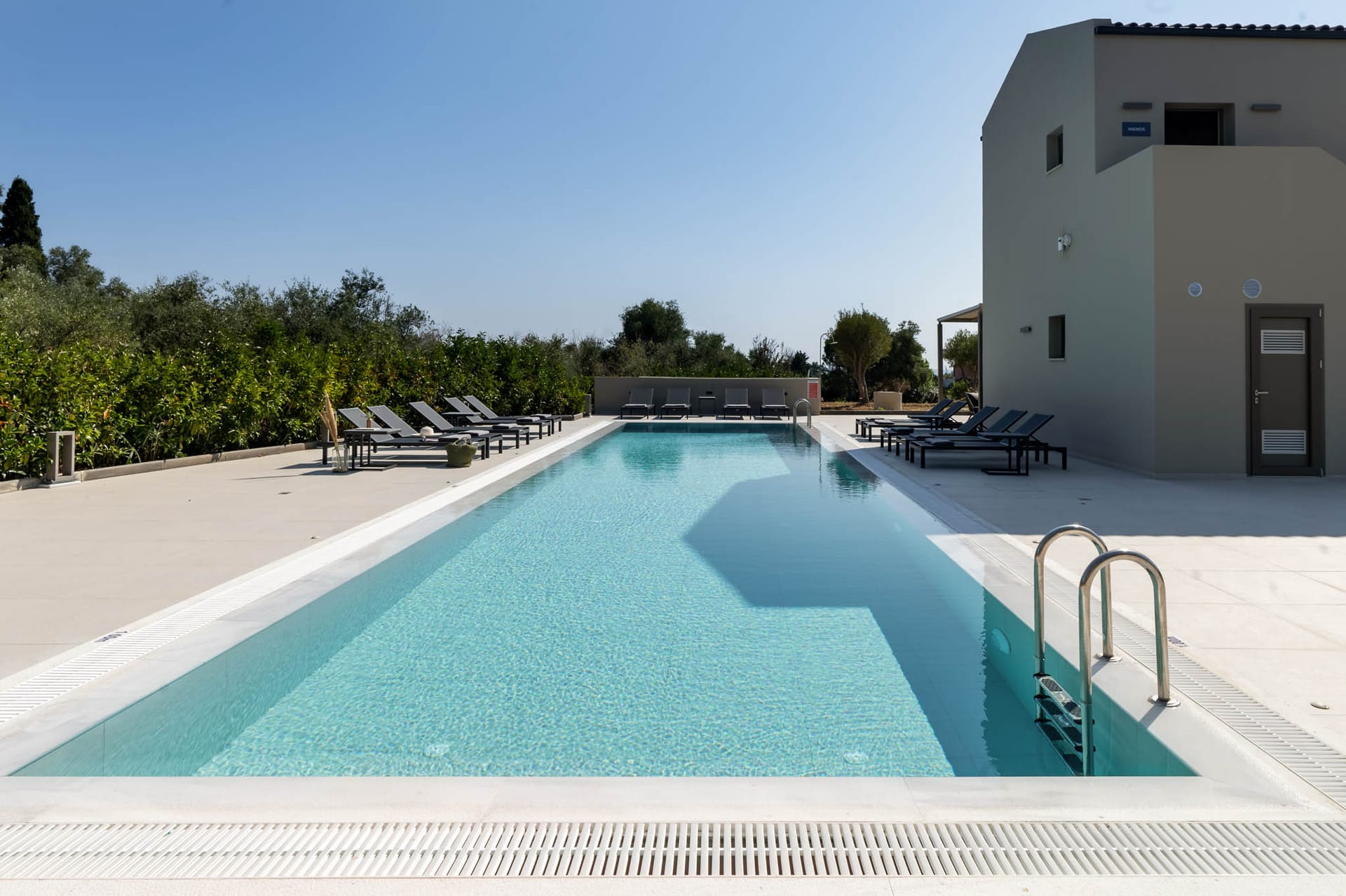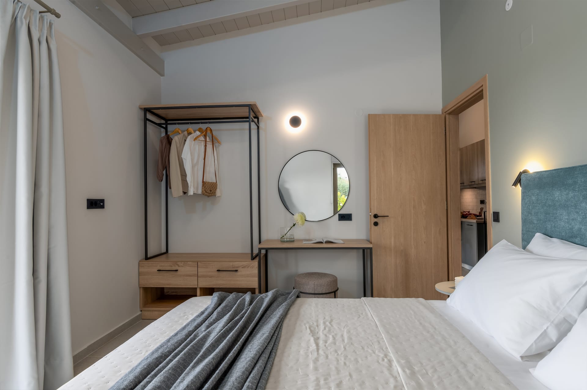 Faros (the Lighthouse) is a 51-square metre, ground floor suite situated at the rear of the property level to the terrace and swimming pool. This generous space comprises an open-plan living and modern kitchen area with a breakfast bar. Just off this area is a light-filled separate queen-size bedroom with sliding doors to an outside terrace. There is a modern and well-equipped bathroom with walk in shower. The sitting area comprises a sofa that can be converted to one single bed. Outside the property is a private terrace area with comfortable sofas for relaxing, and a dining area.