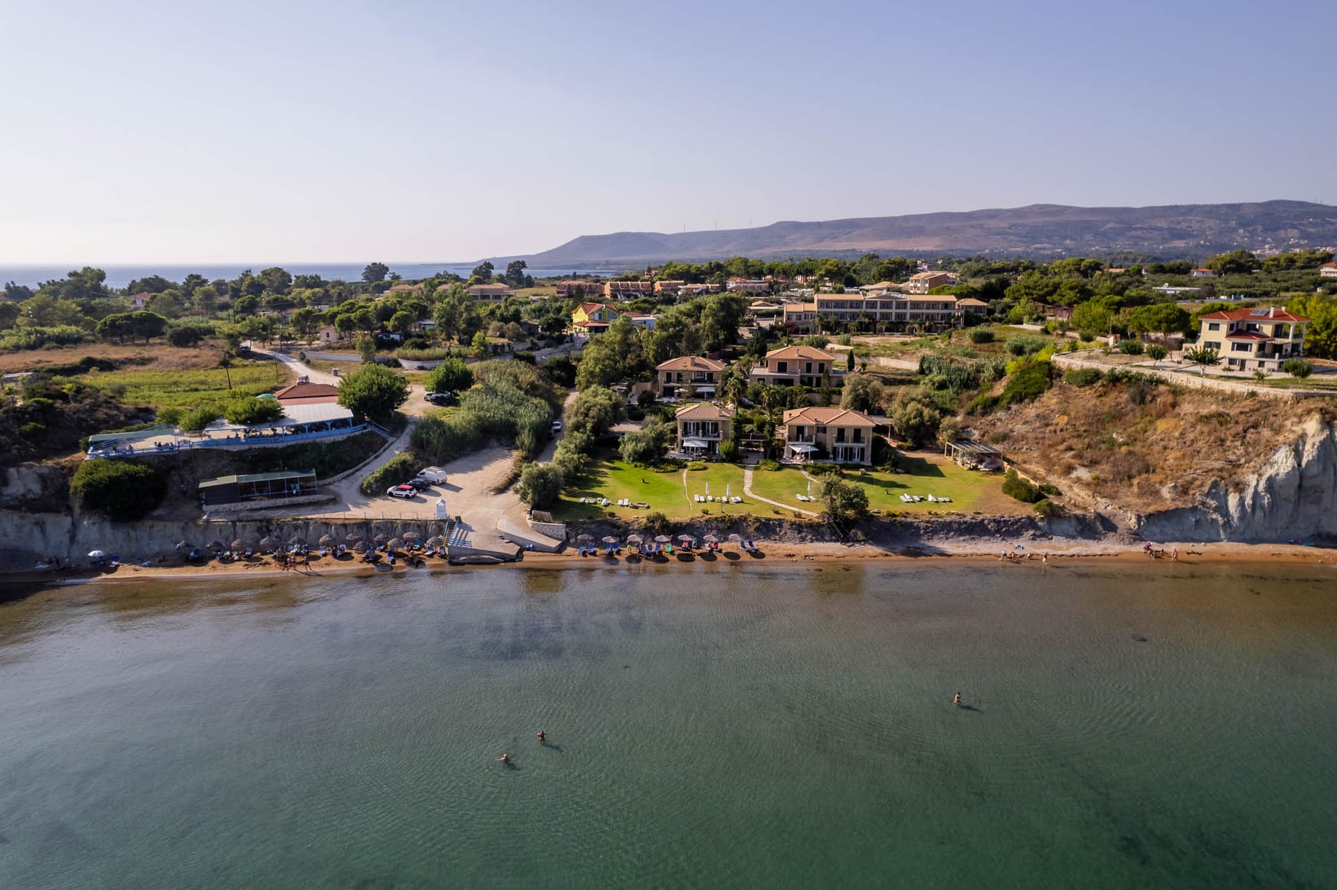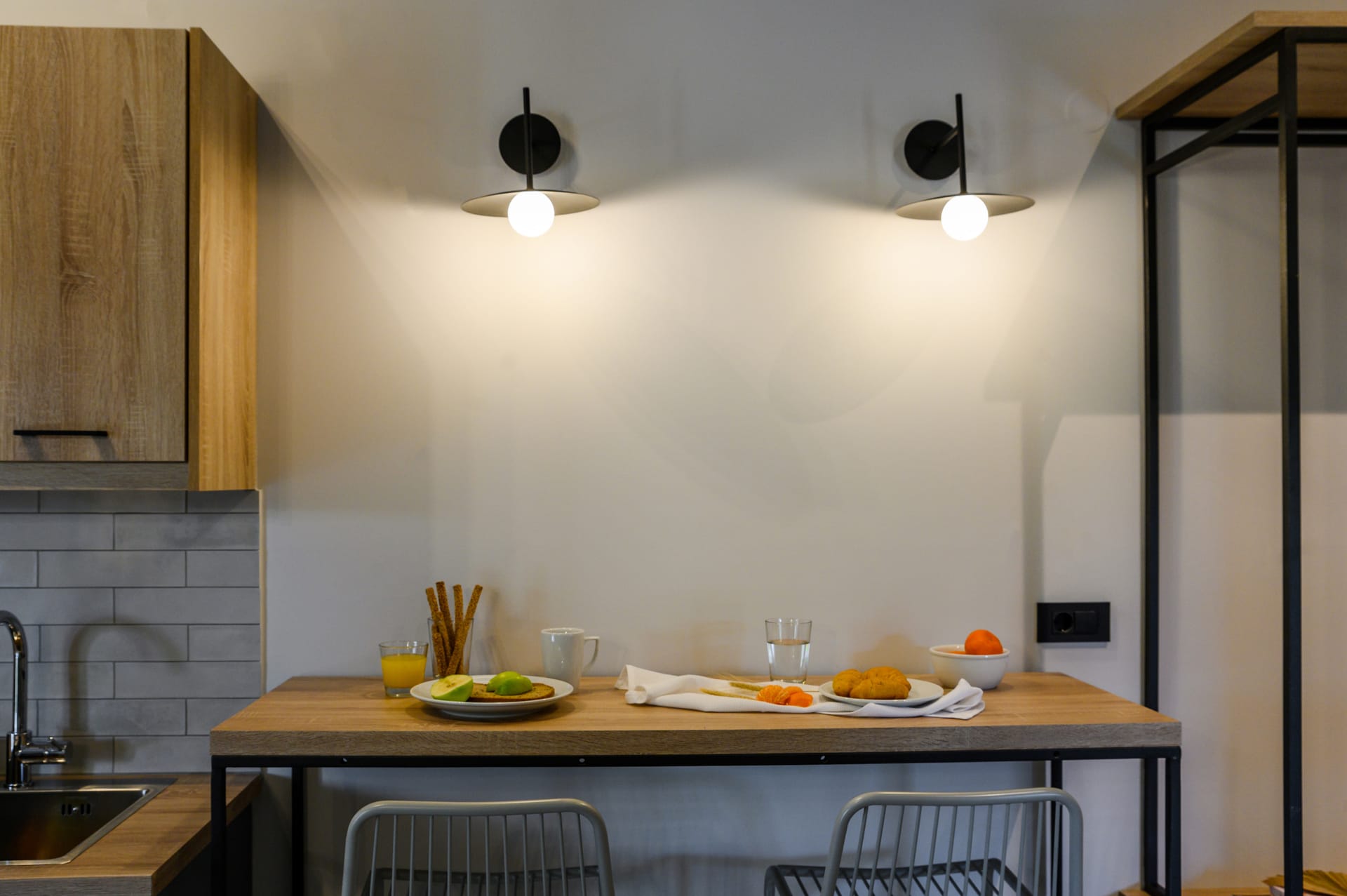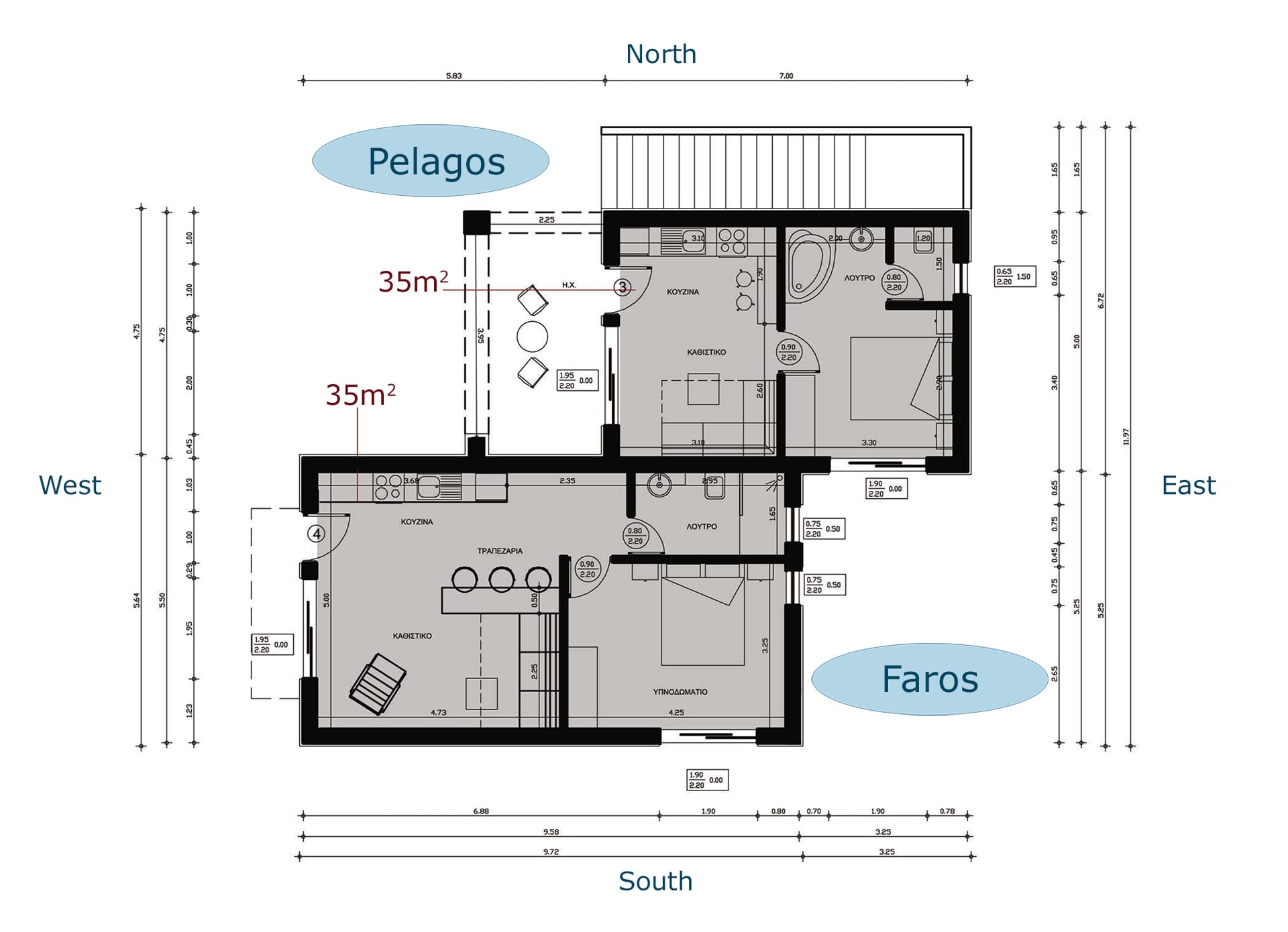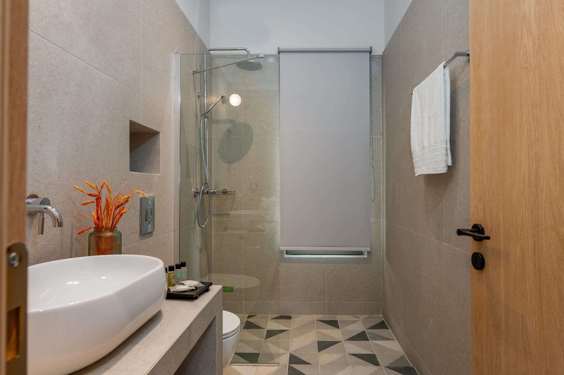 Faros (the Lighthouse) is a 51-square metre, ground floor suite situated at the rear of the property level to the terrace and swimming pool. This generous space comprises an open-plan living and modern kitchen area with a breakfast bar. Just off this area is a light-filled separate queen-size bedroom with sliding doors to an outside terrace. There is a modern and well-equipped bathroom with walk in shower. The sitting area comprises a sofa that can be converted to one single bed. Outside the property is a private terrace area with comfortable sofas for relaxing, and a dining area.