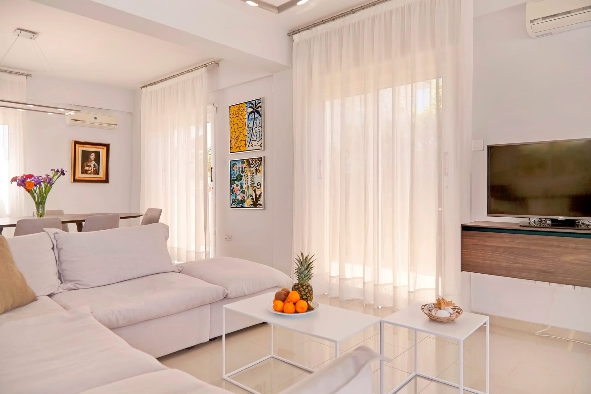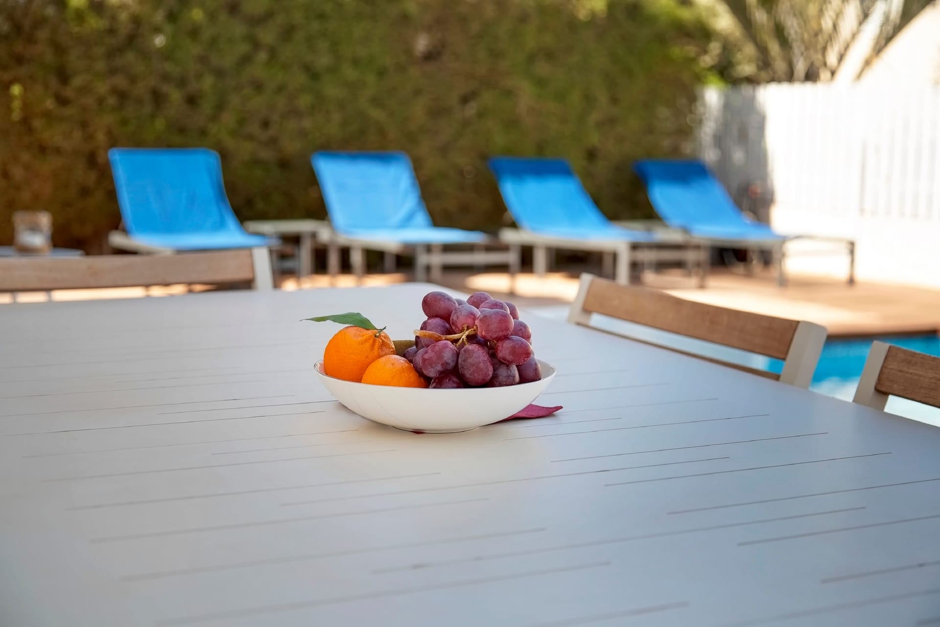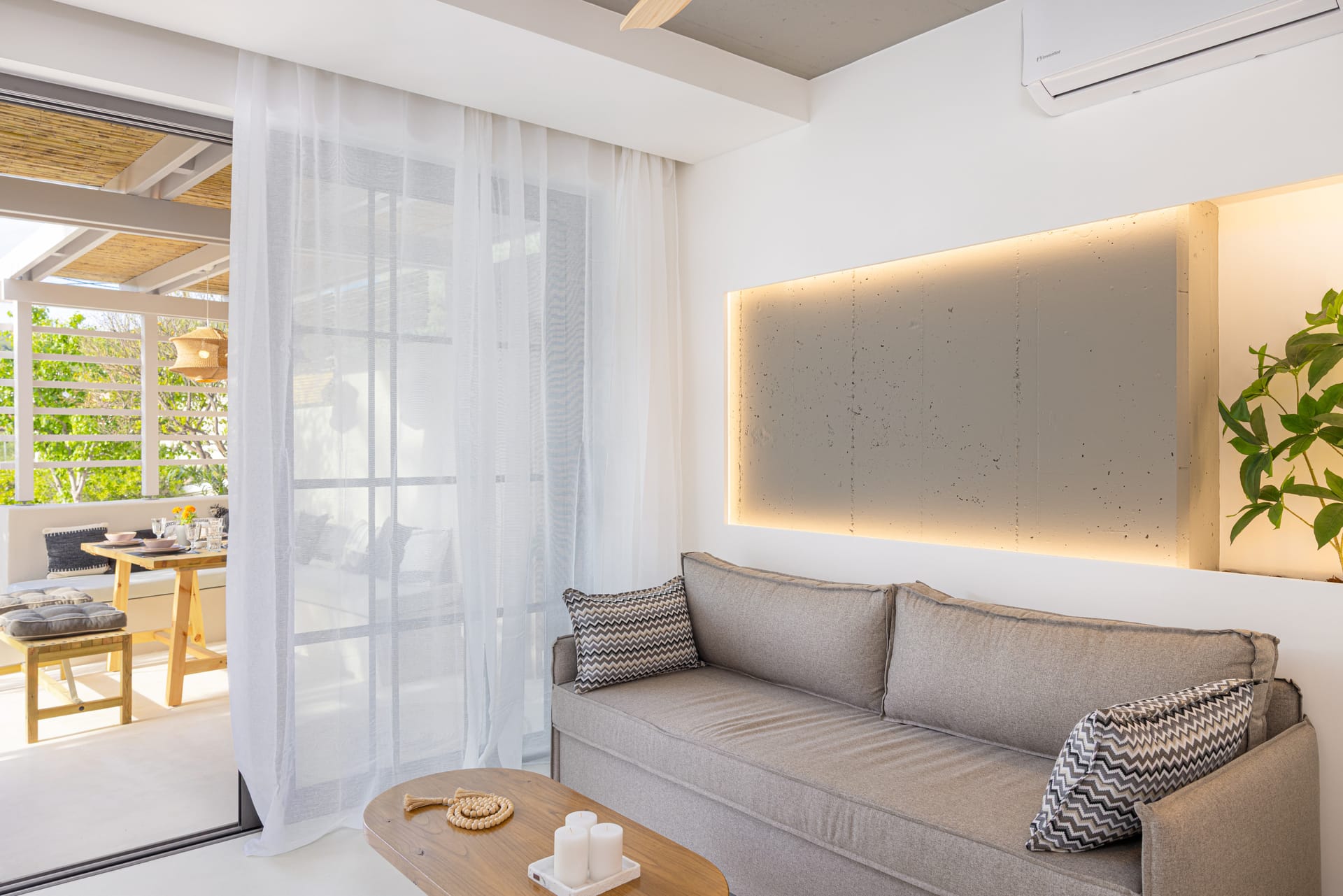 - Large open plan living space with comfortable sofas, kitchen and eating area, opening to the covered wrap-around terrace