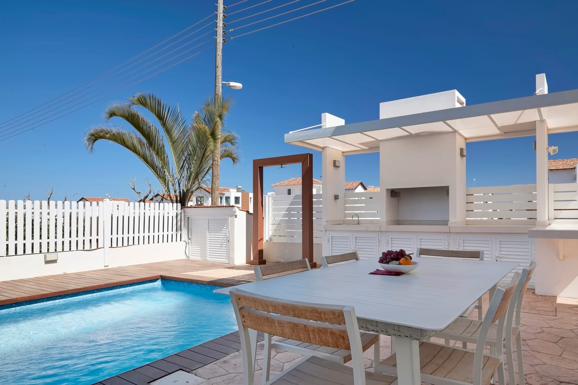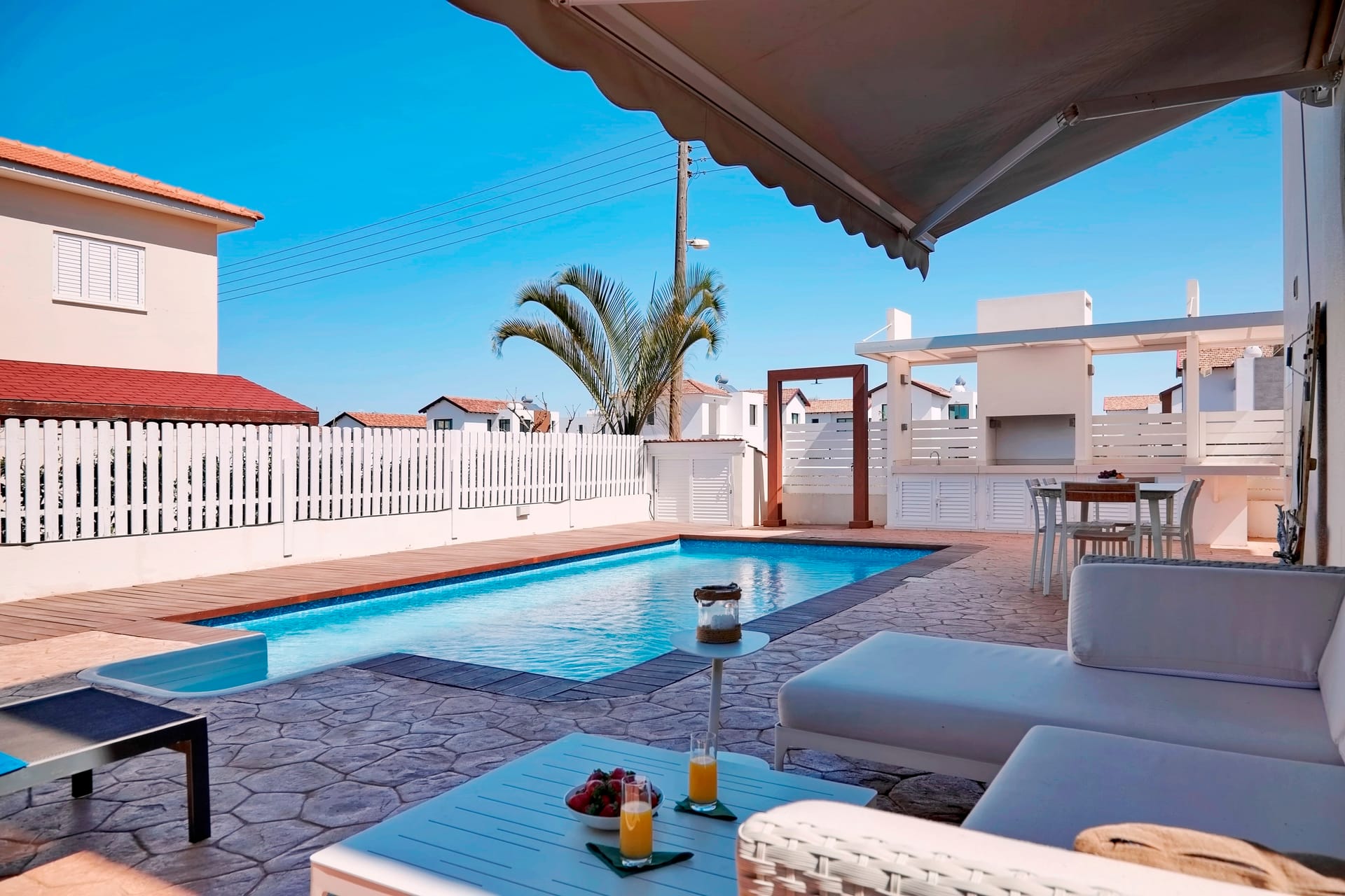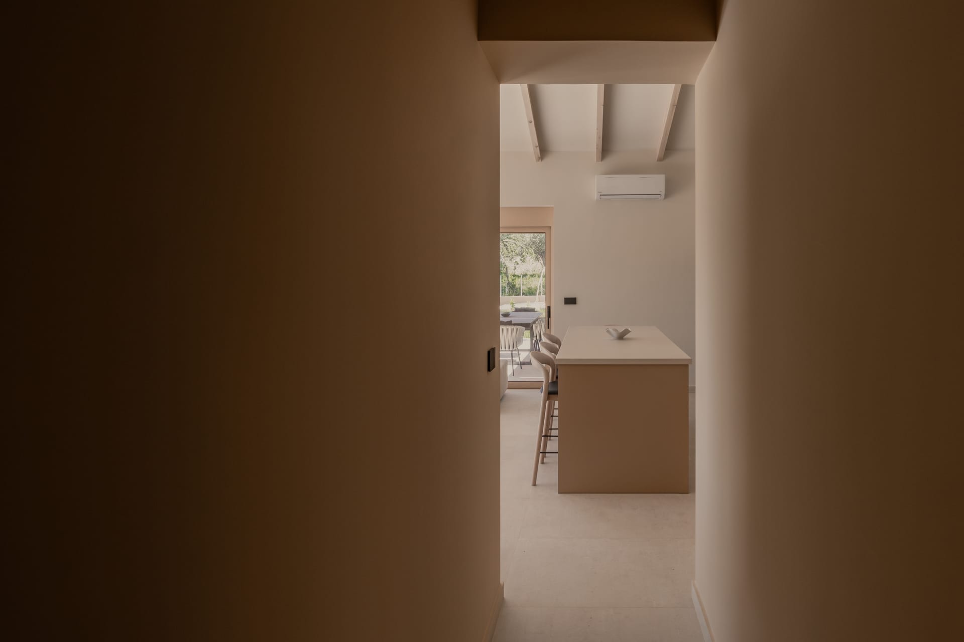 - Large open plan living space with comfortable sofas, kitchen and eating area, opening to the covered wrap-around terrace