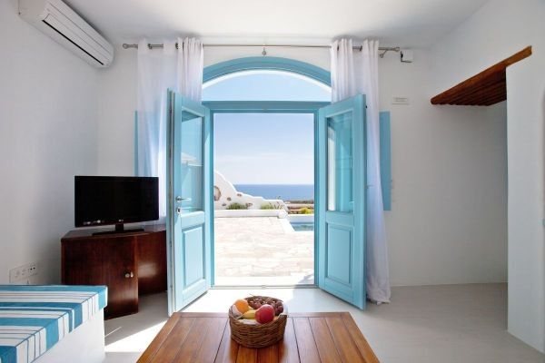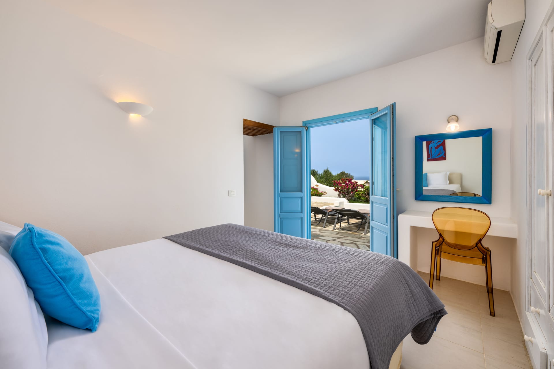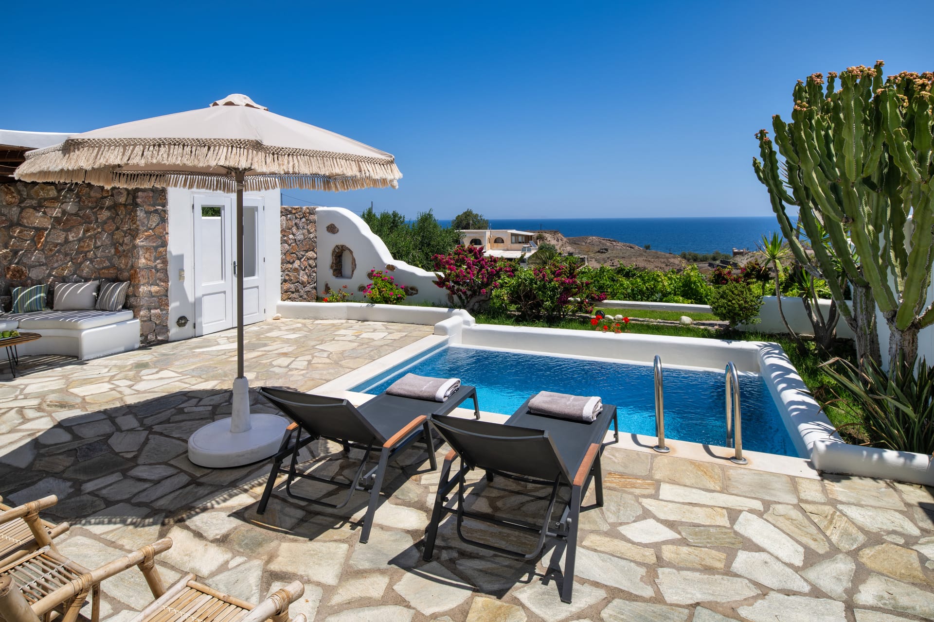 Entering the house from the poolside terrace, you immediately appreciate the care and attention that has gone into the design of these properties. The well-planned space is furnished with a fully-equipped kitchen, built-in seating areas, and the centrepiece, a stunning locally-made wooden table.