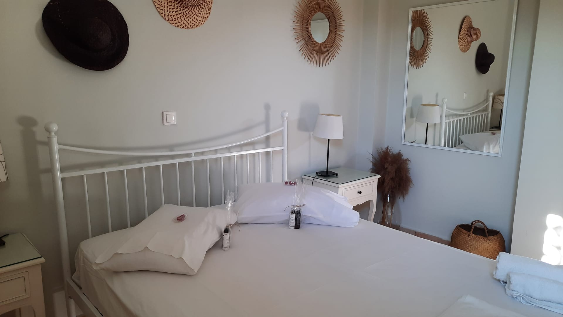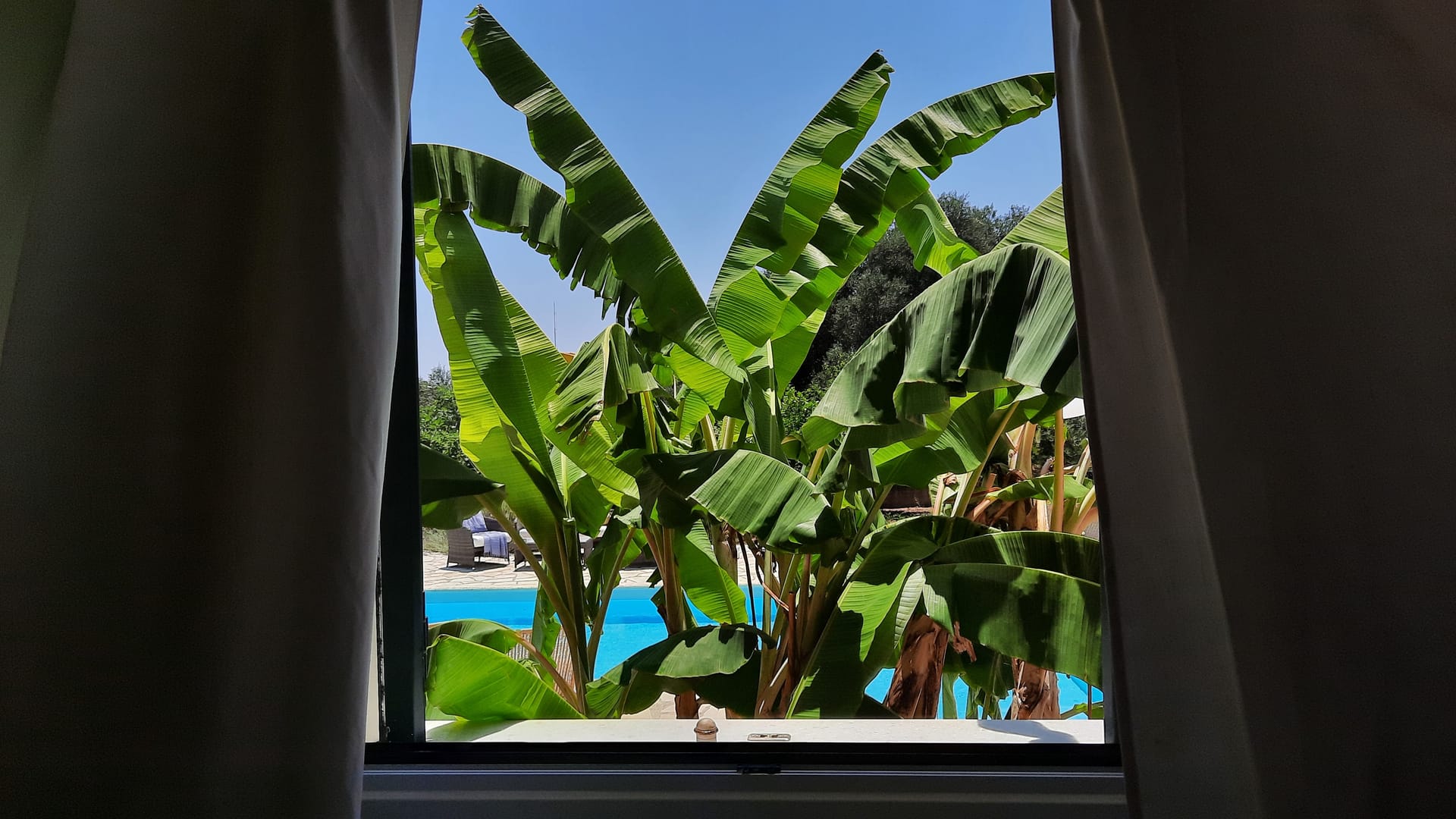 But we expect you’ll spend most of your time outside! Mitis has a stunning swimming pool where you can while away your days! The surrounding terrace is adorned with mature planting, has comfortable seating, sun loungers, and a shaded tent area. There is also an open-air ‘pool house’ where you’ll find a WC, outside shower, sitting area and a BBQ. And combined with 12 acres of gardens, full of mature olive trees, oranges, lemons and palms, you’ll never be short of a shady spot for your siesta.