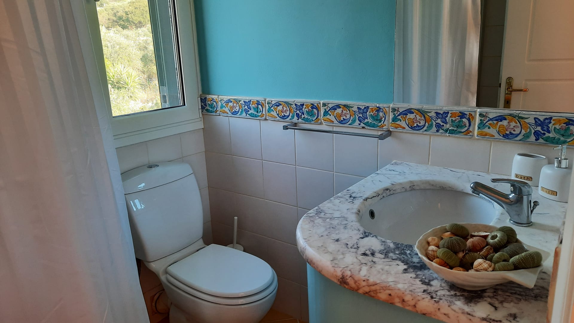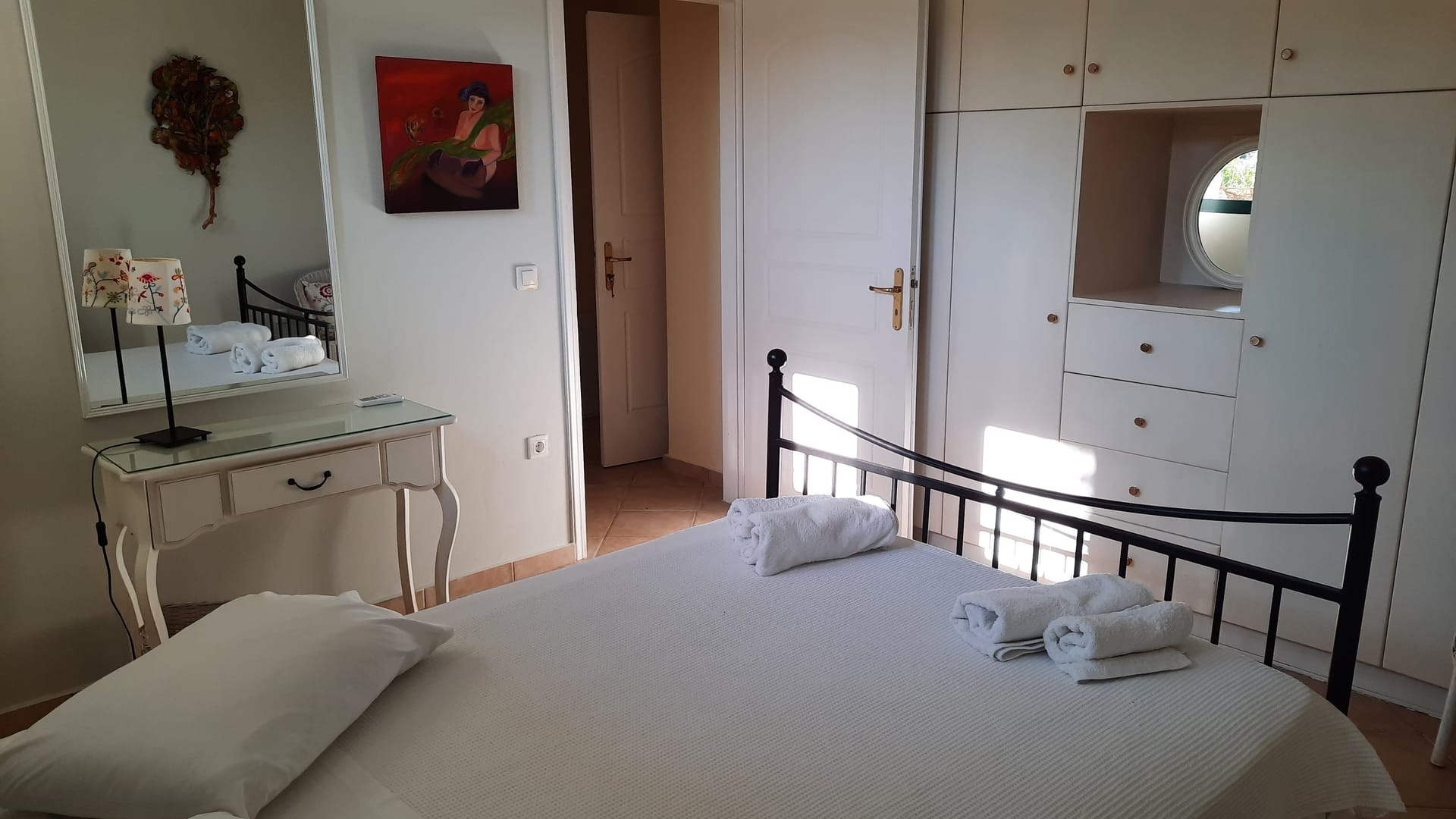 From the open-plan living area, you can enter the well-equipped large family kitchen, or step outside onto the covered terrace, with dining table and views across the gulf. Jasmine and bougainvillea climb the pillars, making this a heavenly spot to relax in the evening with a cocktail.