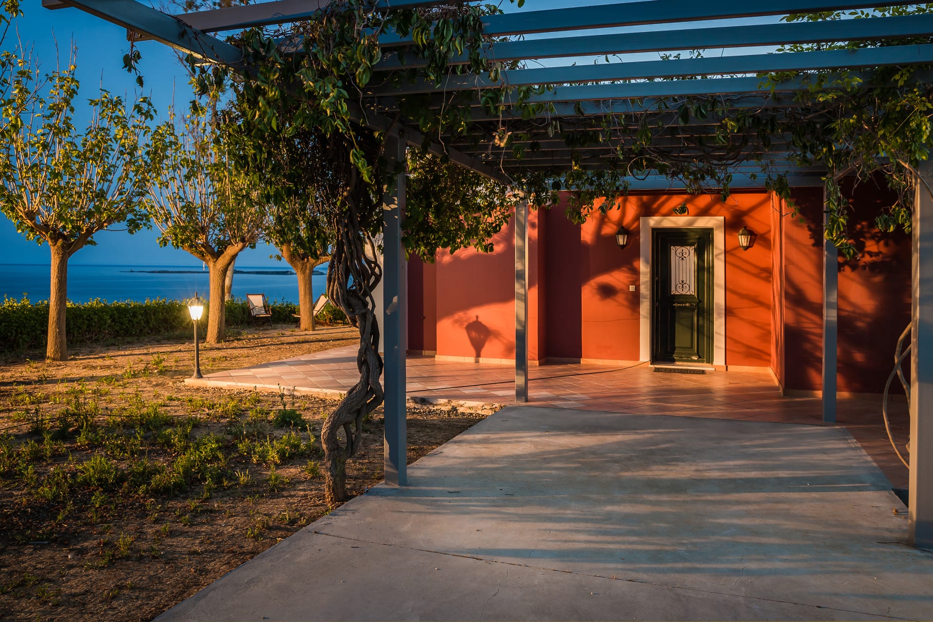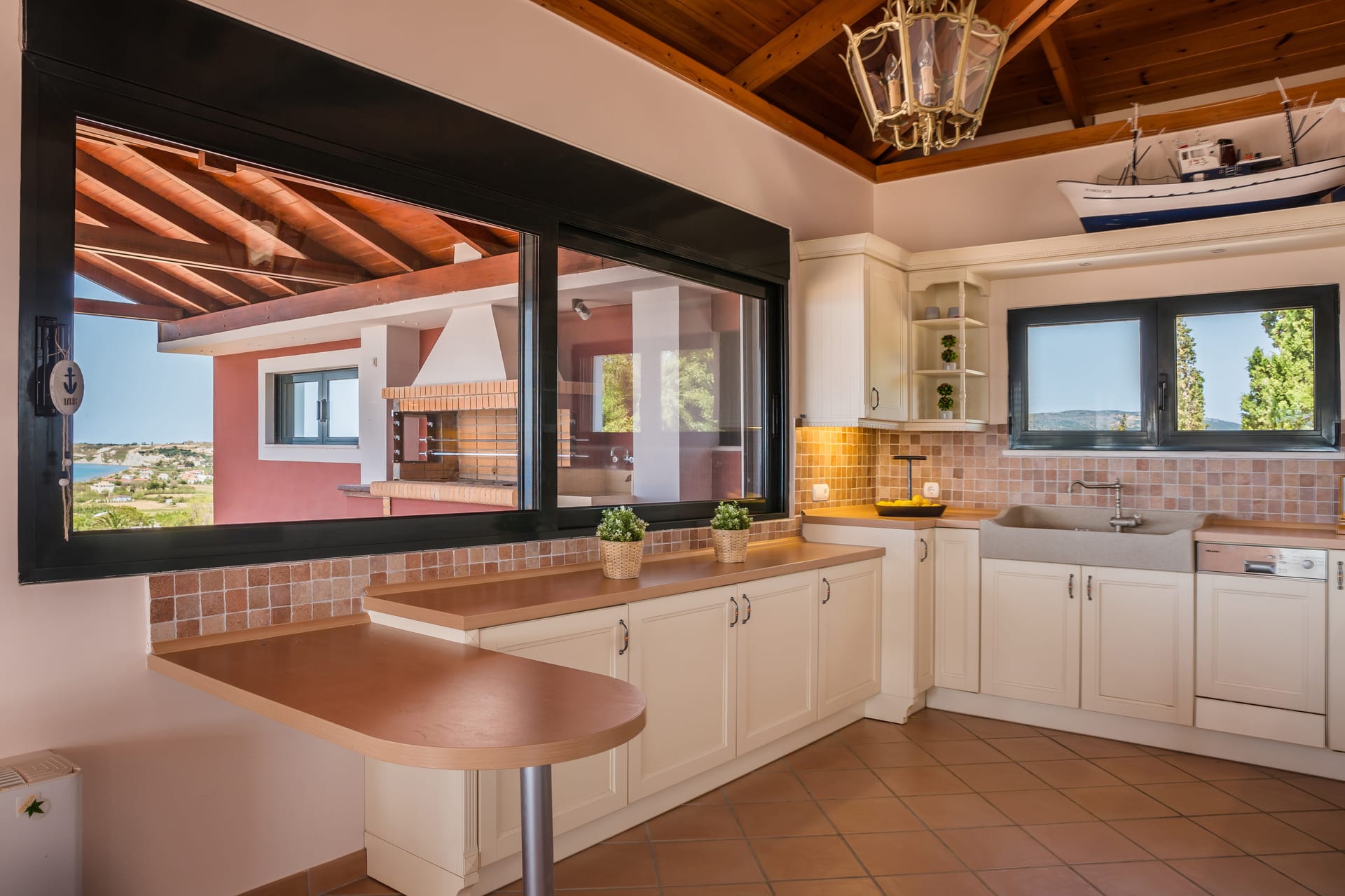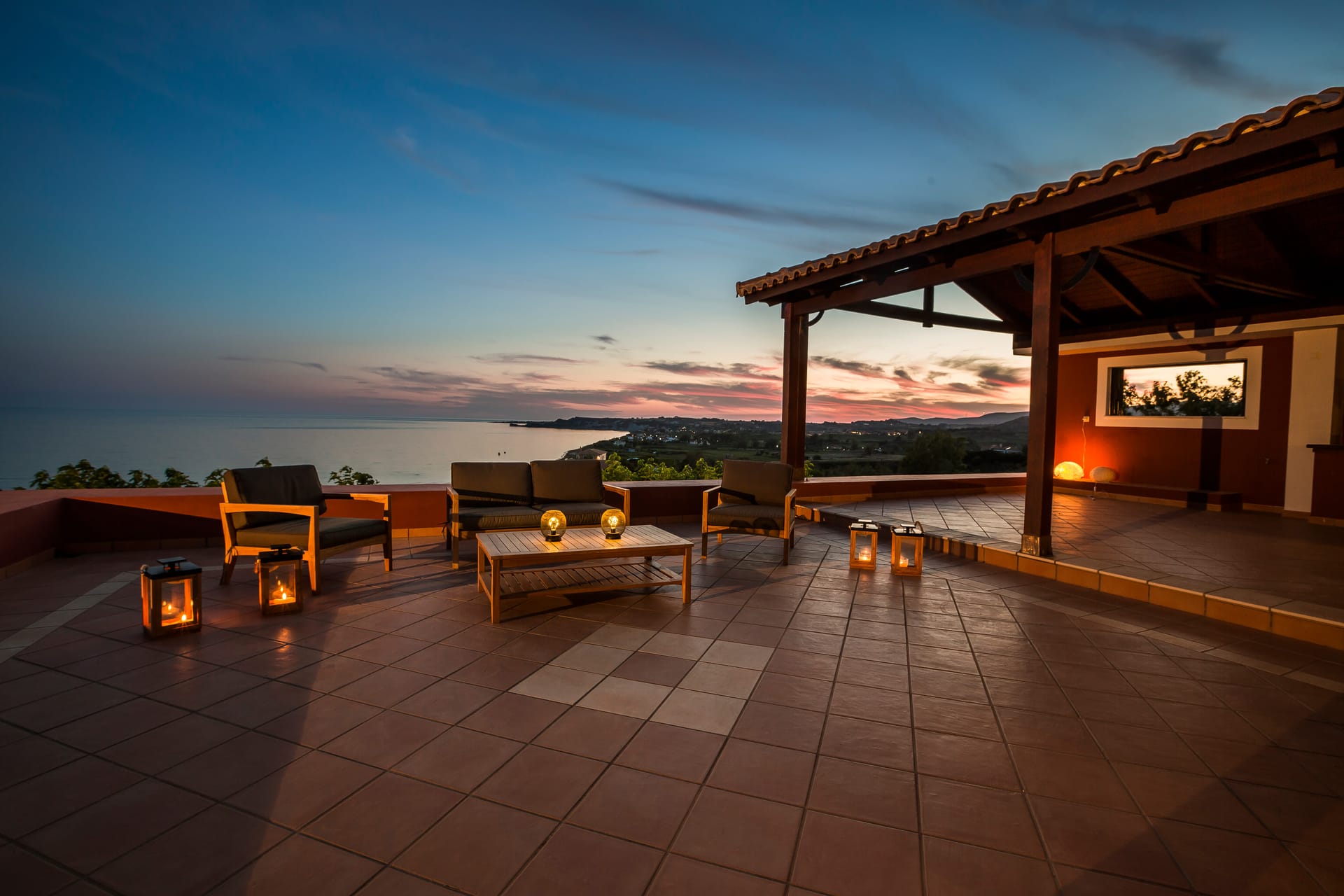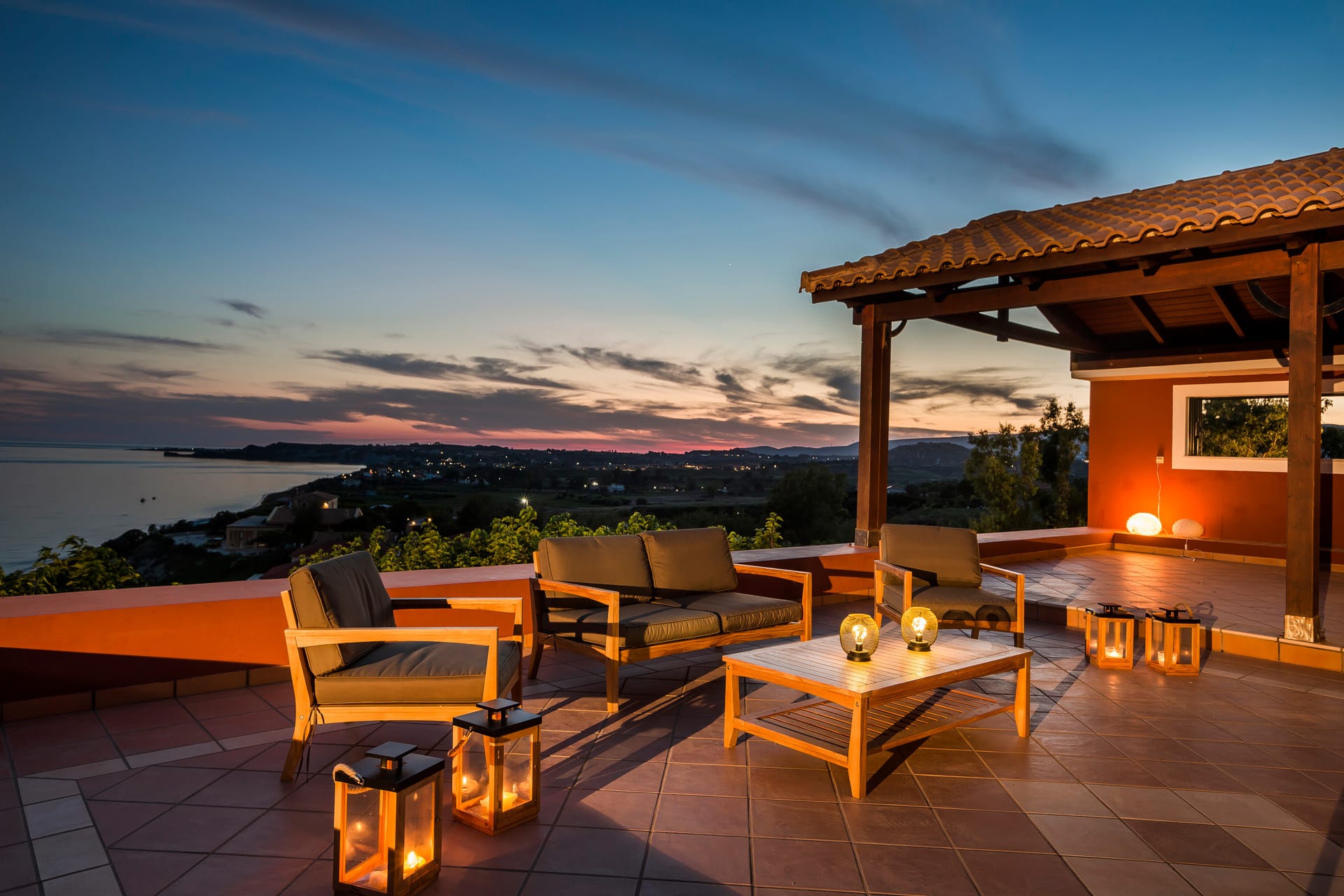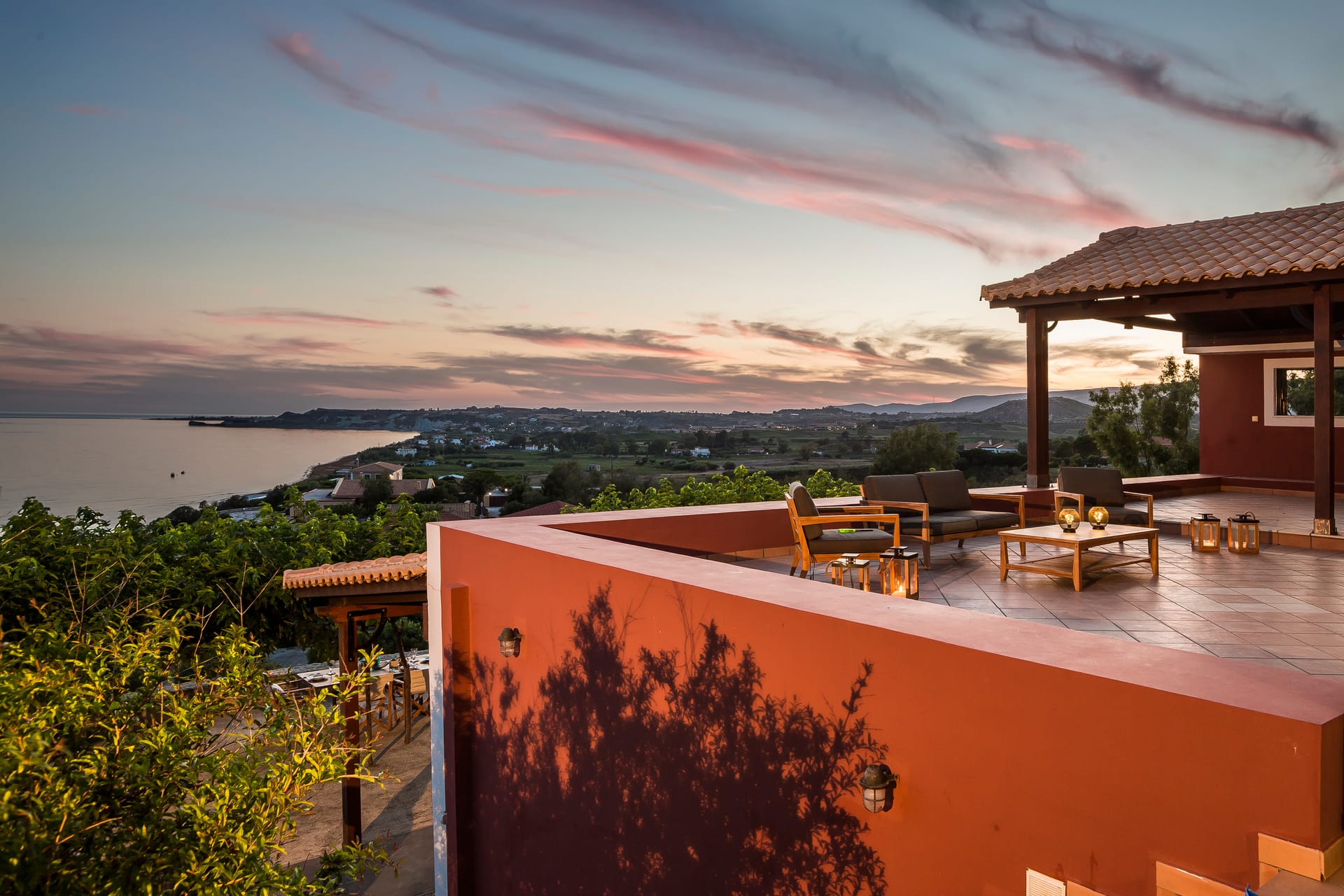 A wrap-around terrace encircles this outstanding villa situated on a prominent headland at the south of the peninsula. The terraces incorporate trees for natural shade, comfortably-furnished seating areas and vast sun-traps for tranquil tanning. A BBQ and outside seating area takes full advantage of this glorious situation. There are stunning panoramic views in all directions, over the valley below, across the sea to Vardiani island, and to Zakynthos beyond. A secluded sandy beach can be reached by a short stroll meandering through a gentle cliffside path.